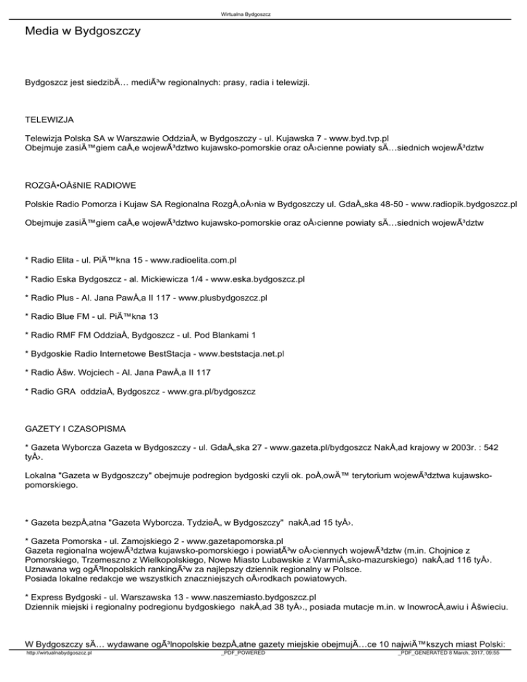 Wirtualna Bydgoszcz Media w Bydgoszczy Bydgoszcz jest siedzibą mediów regionalnych: prasy, radia i telewizji. TELEWIZJA Telewizja Polska SA w Warszawie Oddział w Bydgoszczy - ul. Kujawska 7 - www.byd.tvp.pl Obejmuje zasięgiem całe województwo kujawsko-pomorskie oraz ościenne powiaty sąsiednich województw ROZGŕOŚNIE RADIOWE Polskie Radio Pomorza i Kujaw SA Regionalna Rozgłośnia w Bydgoszczy ul. Gdańska 48-50 - www.radiopik.bydgoszcz.pl Obejmuje zasięgiem całe województwo kujawsko-pomorskie oraz ościenne powiaty sąsiednich województw * Radio Elita - ul. Piękna 15 - www.radioelita.com.pl * Radio Eska Bydgoszcz - al. Mickiewicza 1/4 - www.eska.bydgoszcz.pl * Radio Plus - Al. Jana Pawła II 117 - www.plusbydgoszcz.pl * Radio Blue FM - ul. Piękna 13 * Radio RMF FM Oddział Bydgoszcz - ul. Pod Blankami 1 * Bydgoskie Radio Internetowe BestStacja - www.beststacja.net.pl * Radio Św. Wojciech - Al. Jana Pawła II 117 * Radio GRA oddział Bydgoszcz - www.gra.pl/bydgoszcz GAZETY I CZASOPISMA * Gazeta Wyborcza Gazeta w Bydgoszczy - ul. Gdańska 27 - www.gazeta.pl/bydgoszcz Nakład krajowy w 2003r. : 542 tyś. Lokalna "Gazeta w Bydgoszczy" obejmuje podregion bydgoski czyli ok. połowę terytorium województwa kujawskopomorskiego. * Gazeta bezpłatna "Gazeta Wyborcza. Tydzień w Bydgoszczy" nakład 15 tyś. * Gazeta Pomorska - ul. Zamojskiego 2 - www.gazetapomorska.pl Gazeta regionalna województwa kujawsko-pomorskiego i powiatów ościennych województw (m.in. Chojnice z Pomorskiego, Trzemeszno z Wielkopolskiego, Nowe Miasto Lubawskie z Warmińsko-mazurskiego) nakład 116 tyś. Uznawana wg ogólnopolskich rankingów za najlepszy dziennik regionalny w Polsce. Posiada lokalne redakcje we wszystkich znaczniejszych ośrodkach powiatowych. * Express Bydgoski - ul. Warszawska 13 - www.naszemiasto.bydgoszcz.pl Dziennik miejski i regionalny podregionu bydgoskiego nakład 38 tyś., posiada mutacje m.in. w Inowrocławiu i Świeciu. W Bydgoszczy są wydawane ogólnopolskie bezpłatne gazety miejskie obejmujące 10 największych miast Polski: http://wirtualnabydgoszcz.pl _PDF_POWERED _PDF_GENERATED 8 March, 2017, 09:55 Wirtualna Bydgoszcz * Gazeta Metro * Gazeta Metropol * Dzień Dobry INNE * Akant. Miesięcznik Literacki - ul. Niedźwiedzia 7/7 - www.akant.telvinet.pl * Bydgoski Informator Kulturalny - ul. Batorego 1/3 - www.mok.bydgoszcz.pl * Kwartalnik Artystyczny. Kujawy i Pomorze - ul. Ikara 12 - www.wok.bydgoszcz.pl/kwartalnik * Promocje Pomorskie - ul. Sielanka 6 * Pod Wiatr. Czasopismo młodzieżowe - skr. pocztowa 4049 * Świat Gier Komputerowych - www.sgk.com.pl * Region Wita - czasopismo promujące Region kujawsko-pomorski * Cybermycha - internet: www.cybermycha.pl * SFera internet - www.sfera-online.pl * Biuletyn "Primum non nocere" * Posłaniec Ducha Świętego - Al. Jana Pawła II 117 - www.poslaniec.pl * Profile najstarszy ogólnopolski dwutygodnik budowlany, pismo społeczno- gospodarcze - ul. Wojska Polskiego 1, posiada oddziały w Warszawie i Poznaniu - www.profilegazeta.com * Biuletyn Informacyjny ATR * Wiadomości Diecezji Bydgoskiej * Anonse oddział regionalny w Bydgoszczy * Przewodnik Katolicki Diecezji Bydgoskiej ...oraz kilkadziesiąt lokalnych czasopism firmowych, zakładowych, branżowych, kulturalnych, parafialnych, biznesowych i lokalnych gazetek reklamowych - Ośrodek medialny - Tradycje - Wydawnictwa, drukarnie http://wirtualnabydgoszcz.pl _PDF_POWERED _PDF_GENERATED 8 March, 2017, 09:55