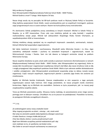 Mój serdeczny Przyjaciel, Nasz Wiceprezydent Międzynarodowej Federacji Sztuk Walki - IMAF Polska, Michał Godnicz zmarł 7 lutego. Miał dopiero 54 lata. Nasze drogi zeszły się na początku lat 80-tych podczas nauki w Wyższej Szkole Policji w Szczytnie. Obaj byliśmy pasjonatami Sztuk Walki, razem przelewaliśmy pot na wspólnych treningach: podczas zajęd programowych oraz w czasie wolnym. Razem też kooczyliśmy kursy instruktorskie. Po ukooczeniu Szkoły podjęliśmy pracę zawodową w innych miastach: Michał w Szkole Policji w Słupsku, ja w KPP Inowrocław. Przez cały czas mieliśmy jednak ze sobą kontakt i wspólnie realizowaliśmy swoje pasje. Michał był założycielem Słupskiego Klubu Karate Champion, ja współzałożycielem IKSK w Inowrocławiu. Później mieliśmy okazję spotykad się na wspólnych imprezach: zawodach, seminariach, stażach, których Michał był wspaniałym organizatorem. Był także świetnym trenerem i wychowawcą. Wyszkolił wielu Mistrzów Karate i Ju Jitsu. Jego zawodnicy zdobywali medale i puchary na zawodach krajowych i zagranicznych, nawet na Mistrzostwach Europy i Świata. Sam nie tak dawno w kategorii seniorów stanął na podium Mistrzostw Europy. Nasze wspólne działania na polu sztuk walki zostały w pewnym momencie sformalizowane w ramach Międzynarodowej Federacji Sztuk Walki - IMAF Polska. Jako Wiceprezydent tej organizacji, która w swojej idei ma jednoczyd i organizowad współpracę różnych styli dbał, aby nasze struktury rosły w siłę i mogły propagowad ideę wspólnych podstaw Sztuk Walki. Miał w tym zakresie wielkie doświadczenie i wielkie umiejętności. Jako Wiceprezydent przedstawiał wspaniałą wizję na dalszy rozwój naszej organizacji. Częśd naszych wspólnych, tegorocznych planów z powodu jego braku nie zostanie już zrealizowana. Będzie mi Michała bardzo brakowało. Zawsze znajdowałem w nim wsparcie a Jego pomysły organizacyjne zawsze były twórcze. Dziś mogę powiedzied, że nasza przyjaźo nosiła znamiona braterstwa. Nigdy się na Michale nie zawiodłem. Zarówno w życiu prywatnym, jak i w naszej pasji znajdowaliśmy wspólne zdanie. Teraz po Michale pozostanie pustka. Wszyscy mamy nadzieję, że pozostawione przez niego wzorce pomogą nam w dalszym rozwoju. Chciałbym mu za to jeszcze raz podziękowad. Pozwólcie na koniec, że pożegnam Michała szczególnymi słowami… ***, P.K. Za widnokręgiem wiary nowy znalazłeś świat Więc żegnaj przyjacielu na dzieo , miesiąc , rok, może wiek My tutaj na ziemskim padole dalej będziemy dźwigad swój krzyż A tobie Stwórca z innego źródła dał już pid Chod bez blasku słooca i szumu przybrzeżnych wód Bądź tam Michale szczęśliwy pośród niebiaoskich pól i daj nam nadzieje na to, że spotkamy się kiedyś znów. My Ciebie w sercach naszych zachowamy na zawsze już.