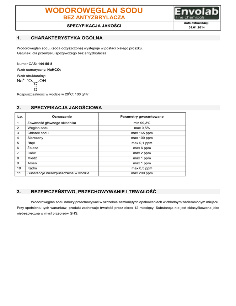 WODOROWĘGLAN SODU BEZ ANTYZBRYLACZA Data aktualizacji: SPECYFIKACJA JAKOŚCI 1. 01.01.2014 CHARAKTERYSTYKA OGÓLNA Wodorowęglan sodu, (soda oczyszczona) występuje w postaci białego proszku. Gatunek: dla przemysłu spożywczego bez antyzbrylacza Numer CAS: 144-55-8 Wzór sumaryczny: NaHCO3 Wzór strukturalny: o Rozpuszczalność w wodzie w 20 C: 100 g/litr 2. SPECYFIKACJA JAKOŚCIOWA Lp. Oznaczenie Parametry gwarantowane 1 Zawartość głównego składnika min 99,3% 2 Węglan sodu max 0,5% 3 Chlorek sodu max 165 ppm 4 Siarczany max 100 ppm 5 Rtęć max 0,1 ppm 6 Żelazo max 6 ppm 7 Ołów max 2 ppm 8 Miedź max 1 ppm 9 Arsen max 1 ppm 10 Kadm max 0,5 ppm 11 Substancje nierozpuszczalne w wodzie max 200 ppm 3. BEZPIECZEŃSTWO, PRZECHOWYWANIE I TRWAŁOŚĆ Wodorowęglan sodu należy przechowywać w szczelnie zamkniętych opakowaniach w chłodnym zaciemnionym miejscu. Przy spełnieniu tych warunków, produkt zachowuje trwałość przez okres 12 miesięcy. Substancja nie jest sklasyfikowana jako niebezpieczna w myśl przepisów GHS.
