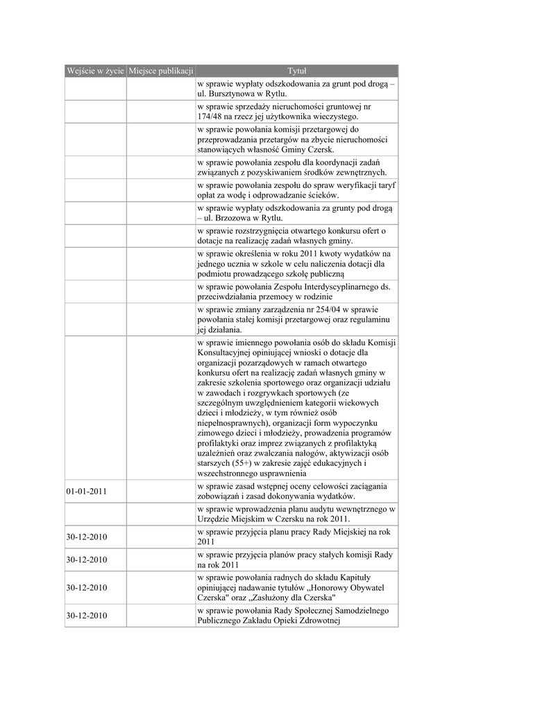 Wejście w życie Miejsce publikacji 01-01-2011 30-12-2010 30-12-2010 30-12-2010 30-12-2010 Tytuł w sprawie wypłaty odszkodowania za grunt pod drogą – ul. Bursztynowa w Rytlu. w sprawie sprzedaży nieruchomości gruntowej nr 174/48 na rzecz jej użytkownika wieczystego. w sprawie powołania komisji przetargowej do przeprowadzania przetargów na zbycie nieruchomości stanowiących własność Gminy Czersk. w sprawie powołania zespołu dla koordynacji zadań związanych z pozyskiwaniem środków zewnętrznych. w sprawie powołania zespołu do spraw weryfikacji taryf opłat za wodę i odprowadzanie ścieków. w sprawie wypłaty odszkodowania za grunty pod drogą – ul. Brzozowa w Rytlu. w sprawie rozstrzygnięcia otwartego konkursu ofert o dotacje na realizację zadań własnych gminy. w sprawie określenia w roku 2011 kwoty wydatków na jednego ucznia w szkole w celu naliczenia dotacji dla podmiotu prowadzącego szkołę publiczną w sprawie powołania Zespołu Interdyscyplinarnego ds. przeciwdziałania przemocy w rodzinie w sprawie zmiany zarządzenia nr 254/04 w sprawie powołania stałej komisji przetargowej oraz regulaminu jej działania. w sprawie imiennego powołania osób do składu Komisji Konsultacyjnej opiniującej wnioski o dotacje dla organizacji pozarządowych w ramach otwartego konkursu ofert na realizację zadań własnych gminy w zakresie szkolenia sportowego oraz organizacji udziału w zawodach i rozgrywkach sportowych (ze szczególnym uwzględnieniem kategorii wiekowych dzieci i młodzieży, w tym również osób niepełnosprawnych), organizacji form wypoczynku zimowego dzieci i młodzieży, prowadzenia programów profilaktyki oraz imprez związanych z profilaktyką uzależnień oraz zwalczania nałogów, aktywizacji osób starszych (55+) w zakresie zajęć edukacyjnych i wszechstronnego usprawnienia w sprawie zasad wstępnej oceny celowości zaciągania zobowiązań i zasad dokonywania wydatków. w sprawie wprowadzenia planu audytu wewnętrznego w Urzędzie Miejskim w Czersku na rok 2011. w sprawie przyjęcia planu pracy Rady Miejskiej na rok 2011 w sprawie przyjęcia planów pracy stałych komisji Rady na rok 2011 w sprawie powołania radnych do składu Kapituły opiniującej nadawanie tytułów „Honorowy Obywatel Czerska" oraz „Zasłużony dla Czerska" w sprawie powołania Rady Społecznej Samodzielnego Publicznego Zakładu Opieki Zdrowotnej Wejście w życie Miejsce publikacji 01-01-2011 01-01-2011 01-01-2011 30-12-2010 30-12-2010 30-12-2010 30-12-2010 30-12-2010 30-12-2010 01-01-2011 Tytuł w sprawie Gminnego Programu Profilaktyki i Rozwiązywania Problemów Alkoholowych w Gminie Czersk na rok 2011 w sprawie Gminnego Programu Przeciwdziałania Narkomanii na rok 2011 w sprawie Gminnego Programu Przeciwdziałania Przemocy w Rodzinie na rok 2011 w sprawie wyrażenia zgody na nieodpłatne przejęcie przez Gminę Czersk od Skarbu Państwa prawa własności nieruchomości nr 878 wykorzystanej jako droga publiczna w sprawie przystąpienia do sporządzenia miejscowego planu zagospodarowania przestrzennego części gminy Czersk we wsi Rytel w sprawie zatwierdzenia umowy dla realizacji projektu „Borowiackie szlaki - kompleksowa redukcja presji turystycznej w Rezerwacie Biosfery Bory Tucholskie" w sprawie zatwierdzenia aneksu nr 3 do umowy partnerskiej dla realizacji projektu „Poprawa dostępności terenów inwestycyjnych w gminie Czersk etap I - przebudowa ul. Pomorskiej i budowa ul. P. Ferensa wraz ze skrzyżowaniem z ul. Królowej Jadwigi i odcinkiem ul. Łubianka" w sprawie wydatków budżetu Gminy Czersk, które w 2010 r. nie wygasają z upływem roku budżetowego w sprawie ustalenia wynagrodzenia Burmistrza Czerska w sprawie wieloletniej prognozy finansowej gminy Czersk na lata 2011 – 2024 w sprawie zwołania zebrań mieszkańców sołectw na terenie Gminy Czersk w sprawie zwołania zebrań mieszkańców Osiedli w Czersku w sprawie przyjęcia autopoprawek do materiałów na III sesję Rady Miejskiej w Czersku w sprawie zmiany zarządzenia w sprawie ustalenia stawki czynszu najmu lokali wchodzących w skład mieszkaniowego zasobu gminy Czersk w sprawie wypłaty odszkodowania za grunt pod drogą – ul. Elizy Orzeszkowej w Rytlu w sprawie zmiany uchwały budżetowej na 2010 rok oraz w sprawie zmiany planu finansowego zadań z zakresu administracji rządowej oraz innych zadań zleconych jednostce samorządu terytorialnego odrębnymi ustawami do uchwały budżetowej gminy Czersk na 2010 rok w sprawie przyjęcia zmiany zestawienia planów finansowych jednostek budżetowych gminy Czersk na 2010 rok w sprawie wypłaty odszkodowania za grunt pod drogą – ul. Łosińska w Czersku Wejście w życie Miejsce publikacji 29-11-2010 29-11-2010 29-11-2010 29-11-2010 29-11-2010 21-02-2011 21-02-2011 16-12-2011 21-02-2011 21-02-2011 21-02-2011 25-12-2010 Tytuł w sprawie wykupu nieruchomości nr 672/7 – ul. Sportowa w Czersku. w sprawie powołania Zastępcy Burmistrza Czerska w sprawie w sprawie powołania Komisji do spraw Mieszkaniowych Gminy Czersk oraz określenia regulaminu jej działania w sprawie powołania doraźnej komisji skrutacyjnej w celu przeprowadzenia tajnego głosowania nad wyborem Przewodniczącego i Wiceprzewodniczącego Rady Miejskiej w sprawie wyboru Przewodniczącego Rady Miejskiej w Czersku w sprawie wyboru Wiceprzewodniczącego Rady Miejskiej w Czersku w sprawie powołania stałych Komisji Rady Miejskiej w Czersku i określenia ich składu w sprawie składów osobowych stałych komisji Rady w sprawie miejscowego planu zagospodarowania przestrzennego części miasta Czersk. w sprawie miejscowego planu zagospodarowania przestrzennego terenu części działek nr 257 LP i nr 258 LP - obręb geodezyjny Lutom gm. Czersk. w sprawie szczegółowych zasad, sposobu i trybu umarzania, odraczania lub rozkładania na raty spłaty należności pieniężnych mających charakter cywilnoprawny przypadających Gminie Czersk oraz jej jednostkom podległym, a także
