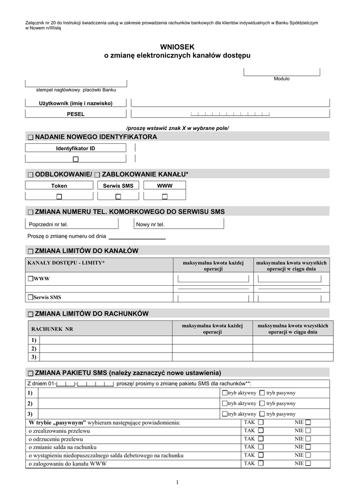 Załącznik nr 20 do Instrukcji świadczenia usług w zakresie prowadzenia rachunków bankowych dla klientów indywidualnych w Banku Spółdzielczym w Nowem n/Wisłą WNIOSEK o zmianę elektronicznych kanałów dostępu Modulo stempel nagłówkowy placówki Banku Użytkownik (imię i nazwisko) |_ _|_ _|_ _|_ _|_ _|_ _|_ _|_ _|_ _|_ _|_ _| PESEL /proszę wstawić znak X w wybrane pole/ NADANIE NOWEGO IDENTYFIKATORA Identyfikator ID ODBLOKOWANIE/ Token ZABLOKOWANIE KANAŁU* Serwis SMS WWW ZMIANA NUMERU TEL. KOMORKOWEGO DO SERWISU SMS Poprzedni nr tel. Nowy nr tel. Proszę o zmianę numeru od dnia ZMIANA LIMITÓW DO KANAŁÓW KANAŁY DOSTĘPU - LIMITY* maksymalna kwota każdej operacji maksymalna kwota wszystkich operacji w ciągu dnia maksymalna kwota każdej operacji maksymalna kwota wszystkich operacji w ciągu dnia WWW Serwis SMS ZMIANA LIMITÓW DO RACHUNKÓW RACHUNEK NR 1) 2) 3) ZMIANA PAKIETU SMS (należy zaznaczyć nowe ustawienia) Z dniem 01-|_ _|_ _|-|_ _|_ _|_ _|_ _| proszę/ prosimy o zmianę pakietu SMS dla rachunków**: 1) tryb aktywny tryb pasywny 2) tryb aktywny tryb pasywny 3) W trybie „pasywnym” wybieram następujące powiadomienia: o zrealizowaniu przelewu o odrzuceniu przelewu o zmianie salda na rachunku o wystąpieniu niedopuszczalnego salda debetowego na rachunku o zalogowaniu do kanału WWW tryb aktywny tryb pasywny 1 TAK NIE TAK NIE TAK NIE TAK NIE TAK NIE TAK NIE automatyczne powiadamianie o saldzie rachunku w wybrane dni tygodnia i o określonej godzinie Pn Wt Śr Cz Pt So Nd Godzina ________________ Tylko w przypadku zmiany TAK NIE *w przypadku, gdy numery rachunków zostały już wpisane w tabeli „Zmiana limitów do rachunków” nie ma potrzeby ich ponownego przepisywania, wystarczy wpisać „jw.” WYDANIE NOWYCH ŚRODKÓW IDENTYFIKACJI ELEKTRONICZNEJ/ REZYGNACJA ZE WZNOWIENIA ŚRODKÓW IDENTYFIKACJI ELEKTRONICZNEJ* Token Identyfikator ID Przyczyny wydania nowego środka: DOSTARCZENIE PRZESYŁKI odbiór w placówce banku miejscowość, data miejscowość, data podpis Posiadacza podpis współposiadacza miejscowość, data stempel funkcyjny i podpis pracownika placówki Banku * ** W przypadku rezygnacji ze wznowienia środka identyfikacji elektronicznej, zablokowania, odblokowania elektronicznego kanału dostępu przez pełnomocnika niniejszy formularz podpisywany jest przez pełnomocnika W przypadku, gdy numery rachunków zostały już wpisane w tabeli „Zmiana limitów do rachunków” nie ma potrzeby ich ponownego przepisywania, wystarczy wpisać „jw.” 2