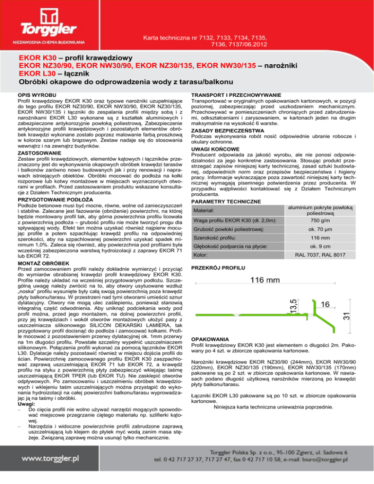 Karta techniczna nr 7132, 7133, 7134, 7135, 7136, 7137/06.2012 EKOR K30 – profil krawędziowy EKOR NZ30/90, EKOR NW30/90, EKOR NZ30/135, EKOR NW30/135 – narożniki EKOR L30 – łącznik Obróbki okapowe do odprowadzenia wody z tarasu/balkonu OPIS WYROBU Profil krawędziowy EKOR K30 oraz typowe narożniki uzupełniające do tego profilu EKOR NZ30/90, EKOR NW30/90, EKOR NZ30/135, EKOR NW30/135 i łączniki do zespalania profili między sobą i z narożnikami EKOR L30 wykonane są z kształtek aluminiowych i zabezpieczone antykorozyjnie powłoką poliestrową. Zabezpieczenie antykorozyjne profili krawędziowych i pozostałych elementów obróbek krawędzi wykonane zostało poprzez malowanie farbą proszkową w kolorze szarym lub brązowym. Zestaw nadaje się do stosowania wewnątrz i na zewnątrz budynków. ZASTOSOWANIE Zestaw profili krawędziowych, elementów kątowych i łączników przeznaczony jest do wykonywania okapowych obróbek krawędzi tarasów i balkonów zarówno nowo budowanych jak i przy renowacji i naprawach istniejących obiektów. Obróbki mocować do podłoża na kołki rozporowe lub kotwy montażowe w miejscach wyznaczonych otworami w profilach. Przed zastosowaniem produktu wskazane konsultacje z Działem Technicznym producenta. TRANSPORT I PRZECHOWYWANIE Transportować w oryginalnych opakowaniach kartonowych, w pozycji poziomej, zabezpieczając przed uszkodzeniem mechanicznym. Przechowywać w pomieszczeniach chroniących przed zabrudzeniami, odkształceniami i zarysowaniem, w kartonach jeden na drugim maksymalnie na wysokość 6 warstw. ZASADY BEZPIECZEŃSTWA Podczas wykonywania robót nosić odpowiednie ubranie robocze i okulary ochronne. PRZYGOTOWANIE PODŁOŻA Podłoże betonowe musi być mocne, równe, wolne od zanieczyszczeń i stabilne. Zalecane jest fazowanie (obniżenie) powierzchni, na której będzie montowany profil tak, aby górna powierzchnia profilu licowała z powierzchnią podłoża – grubość profilu nie może tworzyć progu dla spływającej wody. Efekt ten można uzyskać również najpierw mocując profile a potem szpachlując krawędź profilu na odpowiedniej szerokości, aby na szpachlowanej powierzchni uzyskać spadek minimum 1,0%. Zaleca się również, aby powierzchnia pod profilami była wcześniej zabezpieczona warstwą hydroizolacji z zaprawy EKOR 71 lub EKOR 72. PARAMETRY TECHNICZNE MONTAŻ OBRÓBEK Przed zamocowaniem profili należy dokładnie wymierzyć i przyciąć do wymiarów obrabianej krawędzi profil krawędziowy EKOR K30. Profile należy układać na wcześniej przygotowanym podłożu. Szczególną uwagę należy zwrócić na to, aby otwory usytuowane wzdłuż „noska” profilu wysunięte były całą swoją powierzchnią poza krawędź płyty balkonu/tarasu. W przestrzeni nad tymi otworami umieścić sznur dylatacyjny. Otwory nie mogą ulec zaślepieniu, ponieważ stanowią integralną część odwodnienia. Aby uniknąć podciekania wody pod profil można, przed jego montażem, na dolnej powierzchni profili, przy jej krawędziach i wokół otworów montażowych ułożyć pasy z uszczelniacza silikonowego SILICON DEKARSKI LAMIERA, tak przygotowany profil docisnąć do podłoża i zamocować kołkami. Profile mocować z pozostawieniem przerwy dylatacyjnej ok. 1mm przerwy na 1m długości profilu. Powstałe szczeliny wypełnić uszczelniaczem silikonowym. Połączenia profili wykonać za pomocą łączników EKOR L30. Dylatacje należy pozostawić również w miejscu dojścia profili do ścian. Powierzchnię zamocowanego profilu EKOR K30 zaszpachlować zaprawą uszczelniającą EKOR 71 lub EKOR 72, a krawędź profilu na styku z powierzchnią płyty zabezpieczyć wklejając taśmę uszczelniającą EKOR TPER (lub EKOR TU). Nie zasklepić otworów odpływowych. Po zamocowaniu i uszczelnieniu obróbek krawędziowych i wklejeniu taśm uszczelniających można przystąpić do wykonania hydroizolacji na całej powierzchni balkonu/tarasu wyprowadzając ją na taśmy i obróbki. Uwagi: – Do cięcia profili nie wolno używać narzędzi mogących spowodować miejscowe przegrzanie ciętego materiału np. szlifierki kątowej. – Narzędzia i widoczne powierzchnie profili zabrudzone zaprawą uszczelniającą lub klejem do płytek myć wodą zanim masa stężeje. Związaną zaprawę można usunąć tylko mechanicznie. UWAGI KOŃCOWE Producent odpowiada za jakość wyrobu, ale nie ponosi odpowiedzialności za jego konkretne zastosowania. Stosując produkt przestrzegać zapisów niniejszej karty technicznej, zasad sztuki budowlanej, odpowiednich norm oraz przepisów bezpieczeństwa i higieny pracy. Informacje wykraczające poza zawartość niniejszej karty technicznej wymagają pisemnego potwierdzenia przez producenta. W przypadku wątpliwości kontaktować się z Działem Technicznym producenta. Materiał: Waga profilu EKOR K30 (dł. 2,0m): Grubość powłoki poliestrowej: aluminium pokryte powłoką poliestrową 750 g/m ok. 70 μm Szerokość profilu: 116 mm Głębokość podparcia na płycie: ok. 9 cm Kolor: RAL 7037, RAL 8017 PRZEKRÓJ PROFILU OPAKOWANIA Profil krawędziowy EKOR K30 jest elementem o długości 2m. Pakowany po 4 szt. w zbiorcze opakowania kartonowe. Narożniki krawędziowe EKOR NZ30/90 (244mm), EKOR NW30/90 (220mm), EKOR NZ30/135 (190mm), EKOR NW30/135 (170mm) pakowane są po 2 szt. w zbiorcze opakowania kartonowe. W nawiasach podano długość użytkową narożników mierzoną po krawędzi płyty balkonu/tarasu. Łączniki EKOR L30 pakowane są po 10 szt. w zbiorcze opakowania kartonowe. Niniejsza karta techniczna unieważnia poprzednie.