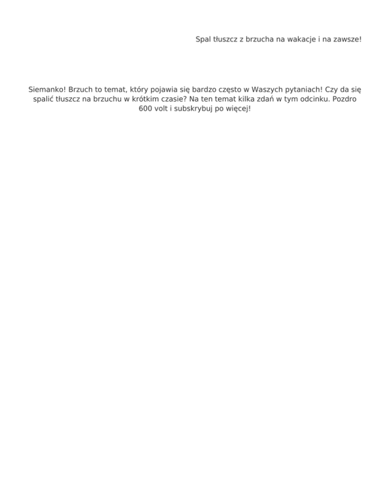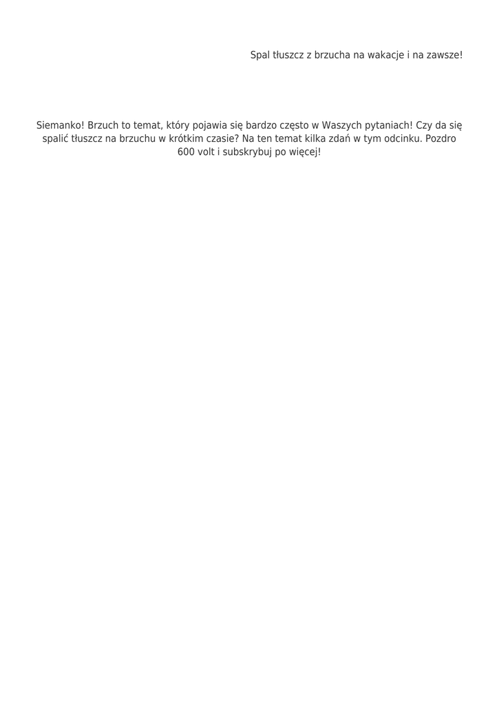 Spal tłuszcz z brzucha na wakacje i na zawsze! Siemanko! Brzuch to temat, który pojawia się bardzo często w Waszych pytaniach! Czy da się spalić tłuszcz na brzuchu w krótkim czasie? Na ten temat kilka zdań w tym odcinku. Pozdro 600 volt i subskrybuj po więcej!