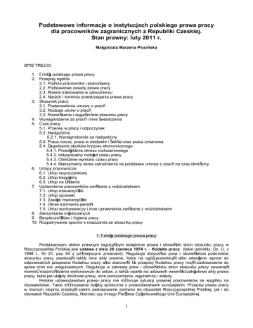 Podstawowe informacje o instytucjach polskiego prawa pracy dla pracowników zagranicznych z Republiki Czeskiej. Stan prawny: luty 2011 r. Małgorzata Marzena Plucińska SPIS TREŚCI: 1. Źródła polskiego prawa pracy 2. Przepisy ogólne 2.1. Pojęcie pracownika i pracodawcy 2.2. Podstawowe zasady prawa pracy 2.3. Równe traktowanie w zatrudnieniu 2.4. Nadzór i kontrola przestrzegania prawa pracy 3. Stosunek pracy 3.1. Postanowienia umowy o pracę 3.2. Rodzaje umów o pracę 3.3. Rozwiązanie i wygaśnięcie stosunku pracy 4. Wynagrodzenie za pracę i inne świadczenia 5. Czas pracy 5.1. Przerwy w pracy i odpoczynek 5.2. Nadgodziny 5.2.1. Wynagrodzenie za nadgodziny 5.3. Praca nocna, praca w niedziele i święta oraz praca zmianowa 5.4. Łagodzenie skutków kryzysu ekonomicznego 5.4.1. Przedłużenie okresu rozliczeniowego 5.4.2. Indywidualny rozkład czasu pracy 5.4.3. Obniżenie wymiaru czasu pracy 5.4.4. Maksymalny okres zatrudnienia na podstawie umowy o pracę na czas określony 6. Urlopy pracownicze 6.1. Urlop wypoczynkowy 6.2. Urlop bezpłatny 6.3. Urlop na żądanie 7. Uprawnienia pracowników związane z rodzicielstwem 7.1. Urlop macierzyński 7.2. Urlop ojcowski 7.3. Zasiłek macierzyński 7.4. Okres karmienia piersią 7.5. Urlop wychowawczy i inne uprawnienia związane z rodzicielstwem 8. Zatrudnianie młodocianych 9. Bezpieczeństwo i higiena pracy 10. Rozpatrywanie sporów o roszczenia ze stosunku pracy 1. Źródła polskiego prawa pracy Podstawowym aktem prawnym regulującym wzajemne prawa i obowiązki stron stosunku pracy w Rzeczpospolitej Polskiej jest ustawa z dnia 26 czerwca 1974 r. - Kodeks pracy (tekst jednolity: Dz. U. z 1998 r., Nr 21, poz 94 z późniejszymi zmianami). Regulacje dotyczące praw i obowiązków podmiotów stosunku pracy zawierają także inne akty prawne, które na ogół przewidują albo odesłanie wprost do odpowiednich przepisów Kodeksu pracy albo stanowią, że przepisy Kodeksu pracy mają zastosowanie do spraw nimi nie uregulowanych. Regulacje w zakresie praw i obowiązków stron stosunku pracy zawierają również rozporządzenia wykonawcze do ustaw, a także oparte na ustawach wewnątrzzakładowe akty prawa pracy, takie jak układy zbiorowe pracy, inne porozumienia, regulaminy i statuty. Polskie ustawodawstwo prawa pracy nie różnicuje sytuacji prawnej pracowników ze względu na obywatelstwo. Takie różnicowanie byłoby sprzeczne z prawodawstwem europejskim. Przepisy prawa pracy w równym stopniu znajdują zatem zastosowanie zarówno do obywateli Rzeczypospolitej Polskiej, jak i do obywateli Republiki Czeskiej, Niemiec czy innego Państwa Członkowskiego Unii Europejskiej. 1 2. Przepisy ogólne 2.1. Pojęcie pracownika i pracodawcy Pracownikiem jest osoba fizyczna, bez względu na obywatelstwo, zatrudniona przez pracodawcę na podstawie umowy o pracę, powołania, wyboru, mianowania lub spółdzielczej umowy o pracę. Pracownik jest zobowiązany do wykonywania pracy osobiście, pod kierownictwem pracodawcy i na jego rzecz za wynagrodzeniem. Warunkiem koniecznym i zarazem wystarczającym dla przyznania danej osobie statusu pracownika jest pozostawanie w stosunku pracy. Natomiast pracodawcą jest jednostka organizacyjna, choćby nie posiadała osobowości prawnej, a także osoba fizyczna, jeżeli zatrudniają one pracowników. 2.2. Podstawowe zasady prawa pracy Polski Kodeks pracy przewiduje szereg zasad podstawowych, w oparciu o które unormowane zostały poszczególne instytucje prawne. Do najważniejszych należą: l prawo każdej osoby do podjęcia pracy; l swoboda nawiązywania stosunków pracy; l obowiązek pracodawcy poszanowania dóbr osobistych pracownika; l obowiązek równego traktowania pracowników; l zakaz dyskryminowania pracowników; l prawo pracownika do godziwego wynagrodzenia; l obowiązek państwa zapewnienia ochrony uprawnieniom pracowników w oparciu o automatyzm prawny; l prawo pracowników i pracodawców do tworzenia i przystępowania do organizacji zawodowych; l prawo pracowników do partycypacji w zarządzaniu firmą w zakresie spraw dotyczących ich osobiście. 2.3. Równe traktowanie w zatrudnieniu Zasada równego traktowania w zatrudnieniu zapewnia ochronę prawną kandydatom do pracy, pracownikom i byłym pracownikom. Równe traktowanie w zatrudnieniu oznacza niedyskryminowanie w jakikolwiek sposób, bezpośrednio lub pośrednio, ze względu na jakiekolwiek okoliczności, w szczególności bez względu na: płeć, wiek, niepełnosprawność, rasę, religię, narodowość, przekonania polityczne, przynależność związkową, pochodzenie etniczne, wyznanie, orientacje seksualną, zatrudnienie na czas określony lub nie określony, zatrudnienie w pełnym lub niepełnym wymiarze czasu pracy. Zasada ta nakłada na pracodawcę m. in. obowiązek równego traktowania pracowników w zakresie: nawiązania i rozwiązania stosunku pracy, warunków zatrudnienia, awansowania, dostępu do szkolenia w celu podnoszenia kwalifikacji zawodowych. 2.4. Nadzór i kontrola przestrzegania prawa pracy Polskie ustawodawstwo zapewnia państwowy nadzór i kontrolę przestrzegania prawa pracy, w tym także przepisów i zasad bezpieczeństwa i higieny pracy (BHP) poprzez wyspecjalizowane organy. Zadania te wykonuje w szczególności Państwowa Inspekcja Pracy (PIP). Ponadto, nadzór i kontrolę przestrzegania zasad, przepisów higieny pracy i warunków środowiska pracy sprawuje Państwowa Inspekcja Sanitarna (PIS). Dodatkową kontrolę przestrzegania prawa pracy w przypadkach przewidzianych ustawą zapewnia instytucja społeczna inspekcja pracy. 3. Stosunek pracy 3.1. Postanowienia umowę o pracę Do obligatoryjnych elementów, jakie musi zawierać każda umowa o pracę należą: określenie stron umowy, jej rodzaj (np. na okres próbny, na czas określony, umowa na zastępstwo), data jej zawarcia, warunki pracy i płacy, a w szczególności: l rodzaj pracy, l miejsce wykonywania pracy, l wynagrodzenie za pracę odpowiadające rodzajowi pr