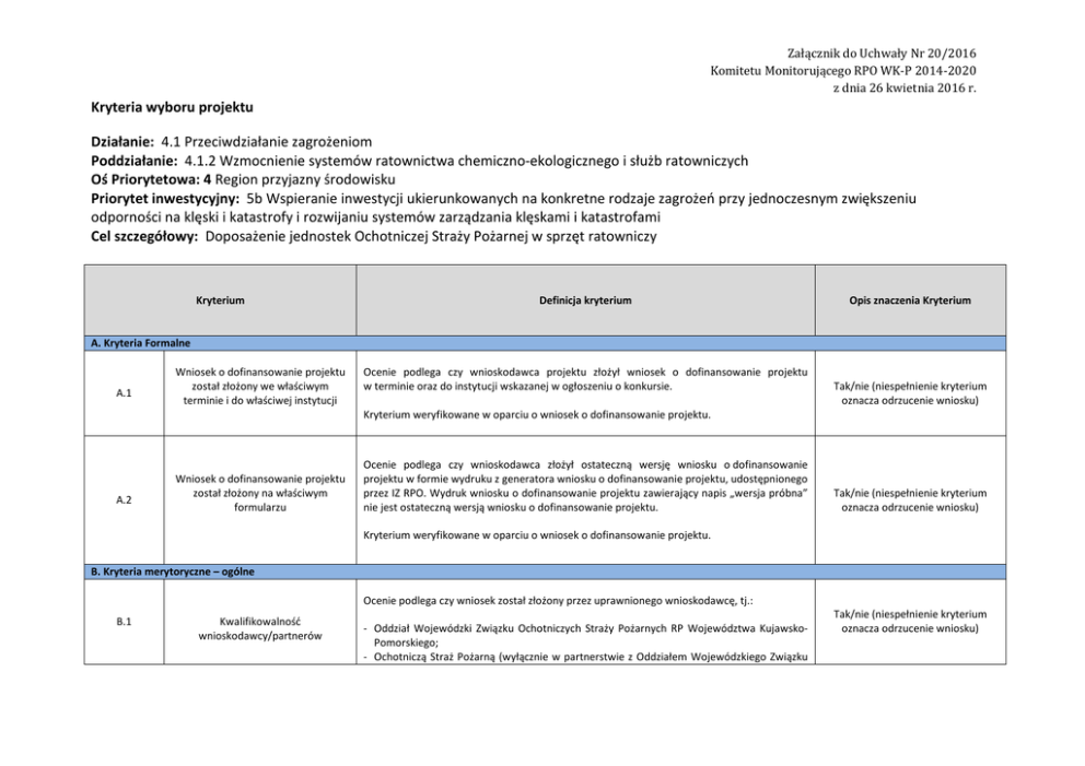 Załącznik do Uchwały Nr 20/2016 Komitetu Monitorującego RPO WK-P 2014-2020 z dnia 26 kwietnia 2016 r. Kryteria wyboru projektu Działanie: 4.1 Przeciwdziałanie zagrożeniom Poddziałanie: 4.1.2 Wzmocnienie systemów ratownictwa chemiczno-ekologicznego i służb ratowniczych Oś Priorytetowa: 4 Region przyjazny środowisku Priorytet inwestycyjny: 5b Wspieranie inwestycji ukierunkowanych na konkretne rodzaje zagrożeń przy jednoczesnym zwiększeniu odporności na klęski i katastrofy i rozwijaniu systemów zarządzania klęskami i katastrofami Cel szczegółowy: Doposażenie jednostek Ochotniczej Straży Pożarnej w sprzęt ratowniczy Kryterium Definicja kryterium Opis znaczenia Kryterium A. Kryteria Formalne A.1 Wniosek o dofinansowanie projektu został złożony we właściwym terminie i do właściwej instytucji Ocenie podlega czy wnioskodawca projektu złożył wniosek o dofinansowanie projektu w terminie oraz do instytucji wskazanej w ogłoszeniu o konkursie. Tak/nie (niespełnienie kryterium oznacza odrzucenie wniosku) Kryterium weryfikowane w oparciu o wniosek o dofinansowanie projektu. A.2 Wniosek o dofinansowanie projektu został złożony na właściwym formularzu Ocenie podlega czy wnioskodawca złożył ostateczną wersję wniosku o dofinansowanie projektu w formie wydruku z generatora wniosku o dofinansowanie projektu, udostępnionego przez IZ RPO. Wydruk wniosku o dofinansowanie projektu zawierający napis „wersja próbna” nie jest ostateczną wersją wniosku o dofinansowanie projektu. Tak/nie (niespełnienie kryterium oznacza odrzucenie wniosku) Kryterium weryfikowane w oparciu o wniosek o dofinansowanie projektu. B. Kryteria merytoryczne – ogólne Ocenie podlega czy wniosek został złożony przez uprawnionego wnioskodawcę, tj.: B.1 Kwalifikowalność wnioskodawcy/partnerów - Oddział Wojewódzki Związku Ochotniczych Straży Pożarnych RP Województwa KujawskoPomorskiego; - Ochotniczą Straż Pożarną (wyłącznie w partnerstwie z Oddziałem Wojewódzkiego Związku Tak/nie (niespełnienie kryterium oznacza odrzucenie wniosku) Załącznik do Uchwały Nr 20/2016 Komitetu Monitorującego RPO WK-P 2014-2020 z dnia 26 kwietnia 2016 r. Ochotniczych Straży Pożarnych). Kryterium weryfikowane w oparciu o wniosek o dofinansowanie projektu oraz załączniki. B.2 Niepodleganie wykluczeniu z możliwości otrzymania dofinansowania ze środków Unii Europejskiej Ocenie podlega czy wnioskodawca projektu nie podlega wykluczeniu z możliwości otrzymania dofinansowania ze środków Unii Europejskiej na podstawie: - art. 207 ust. 4 ustawy z dnia 27 sierpnia 2009 r. o finansach publicznych (Dz. U. z 2013 r. 885 ze zm.), - art. 12 ust. 1 pkt 1 ustawy z dnia 15 czerwca 2012 r. o skutkach powierzania wykonywania pracy cudzoziemcom przebywającym wbrew przepisom na terytorium Rzeczypospolitej Polskiej (Dz. U. poz. 769), - art. 9 ust. 1 pkt 2a ustawy z dnia 28 października 2002 r. o odpowiedzialności podmiotów zbiorowych za czyny zabronione pod groźbą kary (tekst jednolity: Dz. U. z 2015 r. poz. 1212). Tak/nie (niespełnienie kryterium oznacza odrzucenie wniosku) Kryterium będzie weryfikowane w oparciu o oświadczenie stanowiące integralną część wniosku o dofinansowanie projektu. B.3 Miejsce realizacji projektu Ocenie podlega czy projekt realizowany jest na terytorium województwa kujawskopomorskiego. Tak/nie (niespełnienie kryterium oznacza odrzucenie wniosku) Kryterium weryfikowane w oparciu o wniosek o dofinansowanie projektu. B.4 B.5 Załączniki do wniosku o dofinansowanie są kompletne, poprawne i zgodne z przepisami prawa polskiego i unijnego oraz wymogami Instytucji Zarządzającej RPO WK-P 2014-2020 Zgodność projektu z wymaganiami prawa dotyczącego ochrony środowiska Ocenie podlega czy wnioskodawca projektu dołączył do wniosku o dofinansowanie projektu wszystkie załączniki zgodnie z listą załączników zamieszczoną w regulaminie konkursu oraz czy załączniki do wniosku o dofinansowanie projektu są zgodne z przepisami prawa polskiego i unijnego oraz z Instrukcją wypełniania załączników do wniosku o dofinansowanie projektu w ramach RPO WK-P 2014-2020 Tak/nie (niespełnienie kryterium oznacza odrzucenie wniosku) Kryterium weryfikowane w oparciu o załączniki do wniosku o dofinansowanie projektu. Ocenie podlega czy działania zaplanowane w projekcie zostały przygotowane zgodnie z wymaganiami prawa dotyczącego ochrony środowiska. Kryterium weryfikowane w oparciu o załączniki do wniosku o dofinansowanie projektu. Tak/nie (niespełnienie kryterium oznacza odrzucenie wniosku) Załącznik do Uchwały Nr 20/2016 Komitetu Monitorującego RPO WK-P 2014-2020 z dnia 26 kwietnia 2016 r. Ocenie podlega czy projekt jest zgodny z następującym typem projektu: B.6 Projekt jest zgodny z typami projektów przewidzianymi do wsparcia w ramach Działania/ Poddziałania Zakup specjalistycznego sprzętu i wyposażenia obiektów dla jednostek Ochotniczych Straży Pożarnych, funkcjonujących w Krajowym Systemie Ratowniczo-Gaśniczym, niezbędnego do skutecznego prowadzenia akcji ratowniczych oraz usuwania skutków zagrożeń naturalnych i poważnych awarii. Tak/nie (niespełnienie kryterium oznacza odrzucenie wniosku) Kryterium weryfikowane w oparciu o wniosek o dofinansowanie projektu. B.7 Wskaźniki realizacji projektu Ocenie podlega: - czy wskaźniki realizacji (produktu, rezultatu) zostały wyrażone liczbowo oraz podano czas ich osiągnięcia? - czy zostały precyzyjnie właściwie oszacowane w odniesieniu do zakresu projektu? - czy wybrano wszystkie wskaźniki związane z realizacją projektu? Tak/nie (niespełnienie kryterium oznacza odrzucenie wniosku) Kryterium weryfikowane w oparciu o wniosek o dofinansowanie projektu. B.8 Prawidłowość określenia wkładu własnego Ocenie podlega czy wkład własny Wnioskodawcy oraz partnerów (jeśli dotyczy), stanowi nie mniej niż 15% w wydatkach kwalifikowalnych projektu. Tak/nie (niespełnienie kryterium oznac
