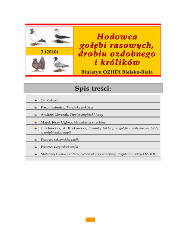 3 (2010) Hodowca gołębi rasowych, drobiu ozdobnego i królików Biuletyn OZHDI Bielsko-Biała Spis treści: Od Redakcji Karol Jasienica, Turyńska jaskółka Andrzej Liwczak, Tippler angielski lotny Marek Jerzy Uglorz, Miniaturowe cochiny T. Klimczak, A. Krykowska, Choroby bakteryjne gołębi i podstawowe błędy w antybiotykoterapii Wzorzec saksońskiej czajki Wzorzec turyńskiej czajki Materiały (Statut OZHDI, Schemat organizacyjny, Regulamin sekcji OZHDI) 1 © – Okręgowy Związek Hodowców Drobnego Inwentarza w BielskuBiałej Skład i opracowanie tekstów: Manfred Uglorz (Karol Jasienica) Zarząd Okręgowego Związku Hodowców Drobnego Inwentarza w Bielsku – Białej Andrzej Liwczak – prezes Kazimierz Stachura – wiceprezes Kazimierz Majer – skarbnik Leszek Zając – sekretarz Grzegorz Koraczyński – członek Zarząd Sekcji Gołębi Rasowych i Drobiu Ozdobnego w Bielsku-Białej Przewodniczący: Andrzej Liwczak; zastępca przewodniczącego: Kazimierz Majer; sekretarz: Leszek Zając; skarbnik: Kazimierz Frąc; członek zarządu: Robert Turała Zarząd Sekcji Królików w Bielski-Białej Przewodniczący: Kazimierz Stachura; zastępca przewodniczącego: Grzegorz Koraczyński; sekretarz: Elżbieta Kubies; skarbnik: Jan Sidzina; członek zarządu: Marian Błachut Adresy do korespondencji: Andrzej Liwczak: email: [email protected]; Kazimierz Majer: email: [email protected]; Stachura Kazimierz: tel.502253976 , 33/8215701 2 Hodowca gołębi rasowych, drobiu ozdobnego i królików – 3(2010) Od Redakcji Od ukazania się 2. numeru Hodowcy gołębi rasowych i drobiu ozdobnego wiele się zmieniło w Okręgowym Związku Hodowców Drobnego Inwentarza w BielskuBiałej. Przede wszystkim na Walnym Zebraniu Członków, które odbyło się 22 lutego 2010 roku w Bielsku-Białej, przyjęty został schemat organizacyjny Związku oraz dokonano wyboru nowych władz Okręgowego Związku. Prezesem OZHDI został Andrzej Liwczak, wiceprezesem Kazimierz Stachura, skarbnikiem Kazimierz Majer, sekretarzem Leszek Zając, członkiem zarządu Grzegorz Koraczyński. W skład Komisji Rewizyjnej weszli: Elżbieta Kubies (przewodnicząca), Czesław Matuszyński (z-ca przewodniczącego) oraz Ludwik Ozga (członek). 11 kwietnia br. odbyło się kolejne zebranie Sekcji Gołębi Rasowych i Drobiu Ozdobnego. Przewodniczący Okręgowego Związku Hodowców Drobnego Inwentarza w Bielsku-Białej odczytał regulamin sekcji OZHDI i przystąpiono do wyboru władz Sekcji Gołębi Rasowych i Drobiu Ozdobnego. Wybrane zostało kierownictwo zarządu w składzie: Andrzej Liwczak (przewodniczący), Kazimierz Majer (wiceprzewodniczący), Kazimierz Frąc (skarbnik), Leszek Zając (sekretarz), Robert Turała (członek). W skład komórki kontroli sekcji GRIDO weszli: (Henryk Gluza (przewodniczący) oraz Ludwik Ozga (członek). Zebranie Sekcji GRIDO w Bielsku-Białej Zebranie swoją obecnością zaszczycili: Jan Pajka (Prezes Polskiego Związku Hodowców Gołębi Rasowych i Drobnego Inwentarza) oraz Stanisław Suski (sekretarz w PZHGRiDI). Pan Jan Pajka mówił o bieżących sprawach PZHGRiDI, o problemach, które wymagają niezwłocznego rozwiązania, oraz odpowiadał na li- 3 Hodowca gołębi rasowych, drobiu ozdobnego i królików – 3(2010) czne pytania zebranych członków GRIDO, a także obecnych na zebraniu hodowców królików rasowych. Podczas zebrania Prezes PZHGRiDI wręczył Manfredowi Uglorzowi złotą oznakę zasługi PZHGRiDI za rozwój gołębiarstwa w Polsce, głównie za czynny udział w redagowaniu najnowszego wydania Standardów Gołębi Rasowych, oraz jeden egzemplarz Standardów. Wręczenie złotej oznaki PZHGRiDI Członkowie Sekcji GRIDO w Bielsku-Białej prosili Prezesa PZHGRiDI, aby częściej odwiedzał bielskich hodowców. *** Oddając Hodowcom gołębi i kur nr 3. Hodowcy gołębi rasowych, drobiu ozdobnego i królików, życzymy przyjemnej lektury i dobrego sezonu hodowlanego. Karol Jasienica 4 Hodowca gołębi rasowych, drobiu ozdobnego i królików – 3(2010) Turyńska jaskółka Pochodzenie Turyńska jaskółka, obok turyńskiej czajki jest najbardziej typowym gołębiem, należącym do grupy 5, wyhodowanym w Turyngii w Niemczech. Ludność zamieszkująca wioski rozsiane w tzw. Turyńskim Lesie od dawna z upodobaniem hodowała gołębie barwne, dobrze latające i chętnie żerujące w polu. Prawdopodobnie były już hodowane w końcu XVII wieku (E. Zurth, Unsere Tauben. Die Farbentauben, Reutlingen). Dawniej hodowano w Turyngii jaskółki gładkonogie oraz łapciaste. Obecnie wzorzec turyńskiej jaskółki przewiduje tylko gołębie gładkonogie. O ile jaskółki turyńskie nie powinny mieć żadnych piór i ozdób na nogach, to w przypadku upierzenia głowy dopuszcza się jaskółki gładkogłowe i z koronką, zakończoną rozetami. W hodowlach przeważają jaskółki koroniaste. Budowa Turyńska jaskółka jest gołębiem silnym, typu polnego, o prawie poziomej postawie. U jaskółek turyńskich pierś powinna być szeroka, zaokrąglona i silna, szyja zaś średniej długości i zwężająca się w kierunku głowy. Cały korpus jest nieco wydłużony, nogi zaś średniej długości. Kolor pazurków jest bez znaczenia. Plecy przykrywają długie i zwarte skrzydła, z których jaskółki potrafią w locie uczynić bardzo dobry użytek. Patrząc z boku, głowa powinna być nieco wydłużona i wysklepiona. Czoło powinno być szerokie i podniesione. Wzorzec przewiduje oczy wyłącznie ciemne, otoczone wąskimi brwiami, od koloru cielistego do czerwonego. Bardzo ważny jest prawidłowy kolor średniej wielkości dzioba. Dolna część dzioba jest zawsze koloru cielistego. U jaskółek czerwonych i żółtych dziób jest koloru cielistego, u czarnych, niebieskich i niebieskich grochowych górna część dzioba powinna być czarna. Ciemno rogowy dziób mają jaskółki niebieskopłowe, grochowe niebieskopłowe, czerwonopłowe oraz grochowe czerwonopłowe. U żółtopłowych i grochowych żółtopłow