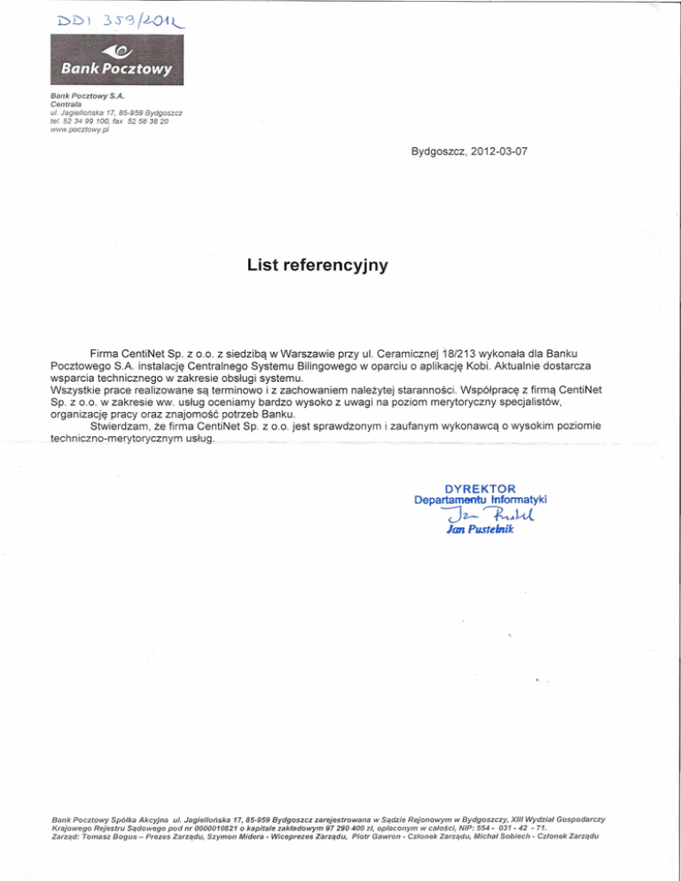 Stwierdzam, że firma CentiNet Sp. z 0.0, jest sprawdzonym i zaufanym wykonawcą o wysokim poziomie