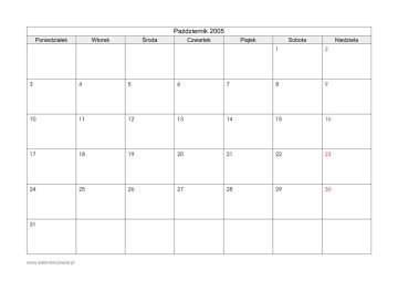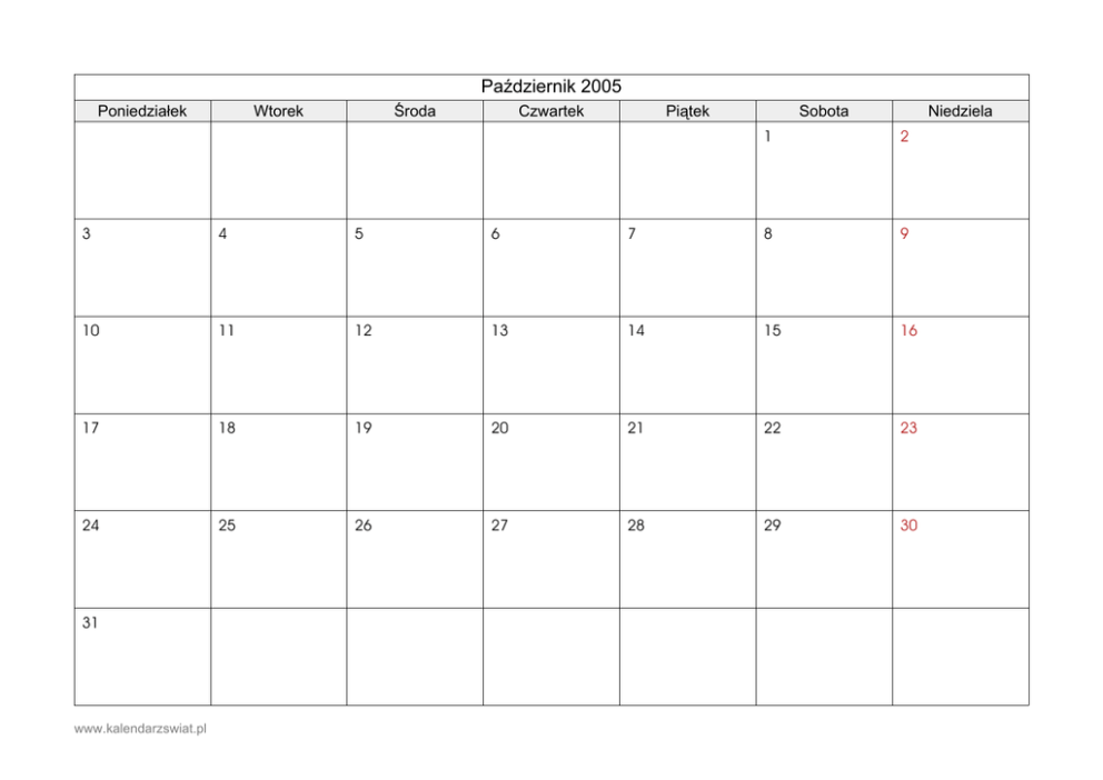 Październik 2005 Poniedziałek Wtorek Środa Czwartek Piątek Sobota Niedziela 1 2 3 4 5 6 7 8 9 10 11 12 13 14 15 16 17 18 19 20 21 22 23 24 25 26 27 28 29 30 31 www.kalendarzswiat.pl