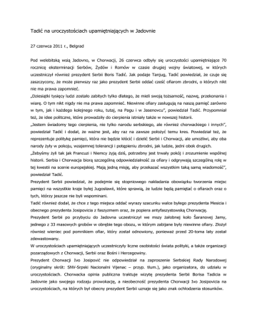 Tadić na uroczystościach upamiętniających w Jadovnie 27 czerwca 2011 r., Belgrad Pod welebitską wsią Jadovno, w Chorwacji, 26 czerwca odbyły się uroczystości upamiętniające 70 rocznicę eksterminacji Serbów, Żydów i Romów w czasie drugiej wojny światowej, w których uczestniczył również prezydent Serbii Boris Tadić. Jak podaje Tanjug, Tadić powiedział, że czuje się zaszczycony, że może pierwszy raz jako prezydent Serbii oddać cześć ofiarom zbrodni, o których nikt nie ma prawa zapomnieć. „Dziesiątki tysięcy ludzi zostało zabitych tylko dlatego, że mieli swoją tożsamość, nazwę, przekonania i wiarę. O tym nikt nigdy nie ma prawa zapomnieć. Niewinne ofiary zasługują na naszą pamięć zarówno w tym, jak i każdego kolejnego roku, tutaj, na Pagu i w Jasenovcu”, powiedział Tadić. Przypomniał też, że idee politczne, które prowadziły do cierpienia istniały także w nowszej historii. „Jestem świadomy tego cierpienia, nie tylko narodu serbskiego, ale również chorwackiego i innych”, powiedział Tadić i dodał, że ważne jest, aby raz na zawsze położyć temu kres. Powiedział też, że reprezentuje politykę pamięci, która nie będzie kłócić i dzielić Serbii i Chorwacji, ale umożliwi, aby oba narody żyły w pokoju, wzajemnej tolerancji i potępieniu zbrodni, jak ludzie, jedni obok drugich. „Żebyśmy żyli tak jak Francuzi i Niemcy żyją dziś, potrzebny jest trwały pokój i zrozumienie wspólnej historii. Serbia i Chorwacja biorą szczególną odpowiedzialność za ofiary i odgrywają szczególną rolę w tej kwestii na scenie europejskiej. Mają jedną misję, aby przekazać wszystkim taką samą wiadomość”, powiedział Tadić. Prezydent Serbii powiedział, że podejmie się stopniowego nakładania obowiązku tworzenia miejsc pamięci na wszystkie kraje byłej Jugosławii, które sprawią, że ludzie będą pamiętać o ofiarach oraz o tych, którzy jeszcze nie byli wspominani. Tadić również dodał, że chce z tego miejsca oddać wyrazy szacunku walce byłego prezydenta Mesicia i obecnego prezydenta Josipovicia z faszyzmem oraz, że popiera antyfaszystowską Chorwację. Prezydent Serbii po przybyciu do Jadovna uczestniczył we mszy żałobnej koło Šaranovej Jamy, jednego z 33 masowych grobów w obrębie tego obozu, w którym zabijane były niewinne ofiary. Złożył również wieniec pod pomnikiem ofiar, który został odnowiony, ponieważ przed 20-toma laty został zdewastowany. W uroczystościach upamiętniających uczestniczyły liczne osobistości świata polityki, a także organizacji pozarządowych z Chorwacji, Serbii oraz Bośni i Hercegowiny. Prezydent Chorwacji Ivo Josipović nie odpowiedział na zaproszenie Serbskiej Rady Narodowej (oryginalny skrót: SNV-Srpski Nacionalni Vijenac – przyp. tłum.), jako organizatora, do udziału w uroczystościach. Chorwacka opinia publiczna traktuje wizytę prezydenta Serbii Borisa Tadicia w Jadovnie jako swojego rodzaju prowokację, a nieobecność prezydenta Chorwacji Ivo Josipovicia na uroczystościach, na których był obecny prezydent Serbii uznaje się jako znak ochłodzenia stosunków. W Jadownie od maja do sierpnia 1941 roku, w ciągu 132 dni istnienia obozu, zabitych zostało ponad 40.000 ludzi, wśród których było 38.000 Serbów. Jadovno i Jasenovac były miejscami największych zbrodni dokonanych przez ustaszy w czasie drugiej wojny światowej. Šaranova Jama jest tylko jedną z 32 jaskiń w górach Velebit, do której zostały wrzucone ciała ofiar obozu, którego oddziały istaniały także w zatokach Metajna i Slana na wyspie Pag, gdzie ciała kobiet i dzieci były wrzucane do morza. Na podst. politika.rs, tłum. i red. I.Ż-I., zdj. politika.rs Walka o indeksy rozpoczęta 25 czerwca 2011, Belgrad/ Nowy Sad/ Kragujewac/ Nowy Pazar W tym roku najwięcej młodych Serbów będzie ubiegać się o miejsce na studiach medycznych, ekonomicznych i prawniczych. Spada zainteresowanie rolnictwem, fizyką i chemią. BELGRAD. Zainteresowanie studiami na Uniwersytecie w Belgradzie jest na takim samym poziomie, co w zeszłym roku – o 14.144 miejsca konkuruje 19.211 kandydatów. Ponownie najtrudniej będzie zdobyć indeks na Wydziale Bezpieczeństwa – 1.112 kandydatów na 390 miejsc – i na Wydziale Psychologii – 324 kandydatów na 88 miejsc. Rekordową ilość zgłoszeń odnotowano na Wydziale Sztuk Teatralnych, gdzie o 100 miejsc zawalczy 599 kandydatów, z czego 338 chce zdobyć jedno z 12 miejsc na aktorstwie. W przybliżeniu po dwie osoby na miejsce zarejestrowały się na medycynę (973 zgłoszenia), nauki polityczne (952), architekturę (408), stomatologię (397), farmację (603) i wychowanie fizyczne (356). Według prorektor ds. nauczania, dr Nedy Bokan, w porównaniu z ubiegłymi latami wzrosło zainteresowanie pedagogiką (razem 761 zgłoszeń), rolnictwem (746) i matematyką (609). Najmniej absolwentów szkół średnich wybiera się natomiast na fizykę (89) i chemię (109), a największym tegorocznym rozczarowaniem jest geografia. W poprzednich latach zainteresowanie tym kierunkiem było tak duże, że w rekrutacji odpadali kandydaci z bardzo wysoką punktacją. W zeszłym roku aplikowało prawie 1000 osób, w bieżącym około 315 - czyli w zasadzie tyle, ile jest miejsc. NOWY SAD. Według informacji podanych przez Rektorat Uniwersytetu w Nowym Sadzie, na 8.686 miejsc zarejestrowało się 8.461 kandydatów. Tłok panuje na Wydziale Nauk Technicznych, gdzie o 1.710 miejsc ubiega się 1.827 absolwentów szkół średnich. Największą konkurencję przewiduje się na Wydziale Medycznym. Po jeden indeks sięgną tu 2 osoby (542 miejsca, 1.039 zgłoszeń). Więcej kandydatów niż miejsc odnotowano także na Wydziale Filozoficznym (1.253) i Wydziale Nauk Matematyczno-Przyrodniczych (1.038), podczas gdy zgłoszenia na wszystkie pozostałe są poniżej limitu miejsc, włączając Wydział Ekonomiczny (1.260 miejsc, 771 zgłoszeń) i Wydział Prawa (