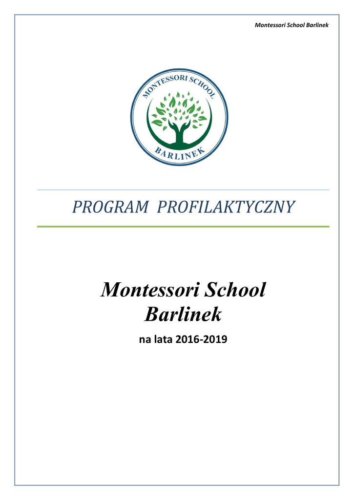 Montessori School Barlinek PROGRAM PROFILAKTYCZNY Montessori School Barlinek na lata 2016-2019 Montessori School Barlinek 1. Wstęp Program profilaktyki Montessori School Barlinek jest nieodłącznym elementem statutu Szkoły i wspólnie z programem wychowawczym realizuje cele wychowawczo-opiekuocze oraz profilaktyczne. Głównym założeniem programu profilaktyki jest szeroko rozumiana działalnośd Szkoły na rzecz zapobiegania zachowaniom ryzykownym oraz interwencja w sytuacjach wymagających zdecydowanej reakcji na niepożądane zjawiska i zachowania uczniów. Program profilaktyki w swoich założeniach ma na celu wspomóc wychowawczą rolę rodziców, dostarczad wiedzy i przykładów na temat przestrzegania norm współżycia społecznego oraz przygotowad uczniów do życia w dorosłym świecie ludzi odpowiedzialnych za swoje zachowania. Realizacja programu profilaktyki jest przewidziana na trzy lata, począwszy od roku szkolnego 2016/2017. 2. Podstawa prawna: • • • • • • Konstytucja Rzeczypospolitej Polskiej z dnia 2 kwietnia 1997 r. uchwalona przez Zgromadzenie Narodowe w dniu 2 kwietnia 1997 r., przyjęta przez Naród w referendum konstytucyjnym w dniu 25 maja 1997 r., podpisana przez Prezydenta Rzeczypospolitej Polskiej w dniu 16 lipca 1997 r. (tj. Dz.U. z 1997 r. Nr 78 poz. 483 ze zm.), Ustawa z dnia 7 września 1991 r. o systemie oświaty (tj. Dz.U. z 2004 r. Nr 256 poz. 2572 ze zm.), Ustawa z dnia 26 stycznia 1982 r. Karta nauczyciela (tj. Dz.U. z 2014 r. poz. 191 ze zm.), Rozporządzenie Ministra Edukacji Narodowej z dnia 27 sierpnia 2012 r. w sprawie podstawy programowej wychowania przedszkolnego oraz kształcenia ogólnego w poszczególnych typach szkół (Dz.U. z 2012 r. poz. 977 ze zm.), Rozporządzenie Ministra Edukacji Narodowej i Sportu z dnia 31 stycznia 2003 r. w sprawie szczegółowych form działalności wychowawczej i zapobiegawczej wśród dzieci i młodzieży zagrożonych uzależnieniem (Dz.U. z 2003 r. Nr 26 poz. 226), Ustawa z dnia 19 sierpnia 1994 r. o ochronie zdrowia psychicznego (tj. Dz.U. z 2011 r. Nr 231 poz. 1375 ze zm.), • Ustawa z dnia 26 października 1982 r. o wychowaniu w trzeźwości i przeciwdziałaniu alkoholizmowi (tj. Dz.U. z 2012 r. poz. 1356 ze zm.), • Ustawa z dnia 24 kwietnia 1997 r. o przeciwdziałaniu narkomanii (tj. Dz.U. z 2012 r. poz. 124), • Ustawa z dnia 9 listopada 1995 r. o ochronie zdrowia przed następstwami używania tytoniu i wyrobów tytoniowych (Dz.U. z 1996 r. Nr 10 poz. 55 ze zm.). 2|S tr o na Montessori School Barlinek 3. Założenia programu: 1) główne założenia programu koncentrują się wokół przeciwdziałania zachowaniom ryzykownym i niepożądanym przez skutecznie prowadzoną profilaktykę zachowao, 2) zadaniem Szkoły jest wzmacnianie pozytywnych zachowao uczniów oraz promowanie działao, które służą powszechnie akceptowanym normom społecznym, 3) profilaktyka zachowao, stała diagnoza zachowao uczniów będzie prowadzona na bieżąco w ramach godzin do dyspozycji wychowawcy oraz w ramach odrębnych zajęd profilaktycznoedukacyjnych, w tym w formie przedstawieo i scenek z zakresu profilaktyki zachowao, 4) profilaktyka w Szkole w kolejnych trzech latach będzie opierała się na następujących działaniach: a) wzmocnienie pracy z uczniami o specjalnych potrzebach edukacyjnych, w tym także z uczniem zdolnym, b) wzbogacenie oferty zajęd pozalekcyjnych - koła zainteresowao, zajęcia wyrównawcze i wychowawcze, w oparciu o rzeczywiste potrzeby uczniów, c) wspomaganie rozwoju moralnego uczniów (poszanowanie norm, wartości i autorytetów), d) stwarzanie uczniom warunków do rozwijania własnych zainteresowao i zagospodarowanie wolnego czasu uczniów zajęciami pozalekcyjnymi, e) wspomaganie rodziców w prawidłowym pełnieniu przez nich funkcji wychowawczych; 5) Szkoła będzie kontynuowała współpracę z następującymi instytucjami: a) placówki kulturalno-oświatowe (ośrodek kultury, biblioteka publiczna, kino, teatr, muzea i inne): • • • uczestnictwo w spektaklach teatralnych o charakterze profilaktycznym, udział w spotkaniach poświęconych problemom zdrowotnym, udział w konkursach organizowanych przez placówki kulturalno-oświatowe, b) placówki oświatowo-opiekuocze (poradnia psychologiczno-pedagogiczna, poradnia uzależnieo): • • • • pomoc uczniom przejawiającym trudności w zachowaniu i nauce, pomoc dzieciom z rodzin uzależnionych i patologicznych, udzielanie pomocy rodzinom znajdującym się w trudnej sytuacji materialnej, udział w spotkaniach organizowanych przez psychologów, pedagogów, lekarzy specjalistów; c) wymiar sprawiedliwości (sąd, kuratorzy, policja): • • współpraca z kuratorem, sadem rodzinnym, udział w zajęciach prowadzonych przez policjantów na temat przeciwdziałania agresji i przestępczości. 3|S tr o na Montessori School Barlinek 4. Cele programu: dbałośd o zapewnienie uczniom bezpiecznych warunków nauki, systematyczne diagnozowanie zachowao uczniów, w szczególności zachowao ryzykownych, wzmacnianie pozytywnych zachowao uczniów, dostarczanie przykładów właściwych postaw, zwracanie uwagi na kulturalne zachowania, zapobieganie i prowadzenie profilaktyki uzależnieo , zapobieganie nadmiernemu spędzaniu czasu przy komputerze, przestrzeganie przed cyberprzemocą, 7) promowanie zdrowego trybu życia, 8) promowanie zdrowej żywności, 9) utrwalenie postaw i zachowao społecznych warunkujących prawidłowy rozwój. 1) 2) 3) 4) 5) 6) 5. Cele szczegółowe: 1) wypracowanie szkolnego kodeksu dobrego wychowania, 2) poznawanie zasad savoir-vivre'u w praktyce, 3) systematyczne uświadamianie uczniom szkodliwości używania wulgaryzmów, 4) promowanie szacunku do języka ojczystego, 5) przeprowadzenie cyklu lekcji wychowawczych poświęconych szkodliwości zachowao ryzykownych, w tym wszelkim przejawom przemocy i agresji, 6) realizacja zajęd poświęconych szkodliwości używek, 7) zorganizowanie zajęd pozalekcyjnych, rozwij