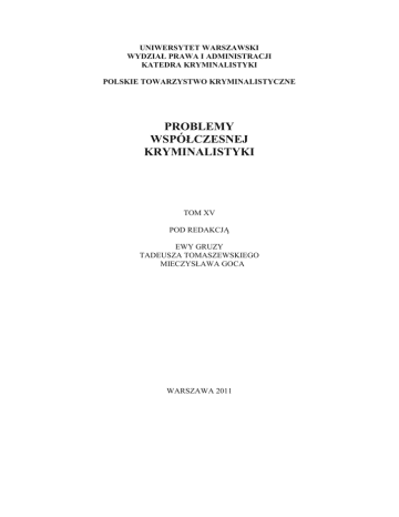 UNIWERSYTET WARSZAWSKI WYDZIAŁ PRAWA I ADMINISTRACJI KATEDRA KRYMINALISTYKI POLSKIE TOWARZYSTWO KRYMINALISTYCZNE PROBLEMY WSPÓŁCZESNEJ KRYMINALISTYKI TOM XV POD REDAKCJĄ EWY GRUZY TADEUSZA TOMASZEWSKIEGO MIECZYSŁAWA GOCA WARSZAWA 2011 SPIS TREACI Ewa Gruza WSTEP ............................................................................................. 7 WSPOMNIENIE .............................................................................. 9 Karol Borchólski PRZESTĘPCZOŚĆ KIBICOW PIŁKARSKICH NA TLE ART. 59-61 USTAWY Z DNIA 20 MARCA 2009 R. O BEZPIECZEŃSTWIE IMPREZ MASOWYCH ........................... 11 Luiza Czesnin KRYMINALISTYCZNA PROBLEMATYKA OGLĘDZIN ZE SZCZEGOLNYM UWZGLĘDNIENIEM OGLĘDZIN ZWŁOK ............................................................................................ 27 Agnieszka Dalecka, Mariusz Michalski PRAWNE ASPEKTY CZYNNOSCI PRZESZUKANIA ................ 41 Anna Maria Dubleska TYMCZASOWE ARESZTOWANIE W UJĘCIU KRYMINALISTYCZNYM.............................................................. 47 Antoni Feluś DEKOMPOZYCJA STRUKTURY GRAFICZNO-JĘZYKOWE JAKO ŚRODEK USTALANIA PRZYCZYN PATOLOGICZNYCH PISMA I MIARA JEGO ZABURZENIA (cześć I) ........................... 57 Katarzyna Furman-¸Łajszczak KRYMINALISTYKA I BIEGLI W SŁUŻBIE SZTUKI ................. 85 Bartosz Grube ZJAWISKO SERYJNEGO ZABOJSTWA - POSTAWA OSKARŻONEGO PRZED SNDEM ORAZ ZNACZENIE SPRAWNOACI DZIAŁANIA ORGANOW ACIGANIA W PROCESIE WYKRYWCZYM ..................................................... 97 Anna Konduracka EWOLUCJA MODUS OPERANDI SPRAWCOW PRZEMYTU NA PRZYKŁADZIE GRANICY POLSKO-UKRAIŃSKIEJ ........ 111 PaweΠ Łabuz BADANIE ZJAWISKA ZORGANIZOWANEJ PRZESTĘPCZOŚCI NARKOTYKOWEJ W POLSCE.................... 123 Waldemar Maciejko, Jacek Rzeszotarski SYSTEM JAKOŚCI W LABORATORIUM FONOSKOPIJNYM. WALIDACJA METOD BADAWCZYCH (część I) ............................131 Daniel Majkowski RESTRYKCYJNY DOSTĘP DO BRONI PALNEJ W POLSCE A „URZĄDZENIA PNEUMATYCZNE” - NIESZKODLIWE ZABAWKI CZY PEŁNOPRAWNA BROŃ PALNA? ......................151 Anita Mastalerz-Glibowska PODSTAWOWE ZAŁOŻENIA GEOPROFILOWANIA .................167 Mariusz Michalski, Agnieszka Dalecka PRAWNE ASPEKTY ZATRZYMANIA OSOBY ........................... 177 Aneta Mikołajczyk FAUNA ZWŁOK - ENTOMOLOGIA I JEJ WYKORZYSTANIE W OSZACOWANIU CZASU ZGONU ............................................ 183 Tomasz Sawicki EKSPERYMENT PROCESOWY W SPRAWACH O POŻARY...... 195 Joanna Stojer EFEKT CSI - FAKT CZY ARTEFAKT? ......................................... 203 Franciszek Trzebski FAŁSZOWANIE ZABYTKOW RUCHOMYCH W UJĘCIU KRYMINALISTYCZNYM I PRAWNOKARNYM - WYBRANE PRZYPADKI ............................................................. 217 Aleksandra Tucholska-Lenart METODY BIOLOGII MOLEKULARNEJ W IDENTYFIKACJI OFIAR KATASTROF MASOWYCH .............................................. 239 Wioleta Wiktorowicz, Paweł Łabuz ASPEKTY PRAWNO-KRYMINALISTYCZNE BEZPIECZEŃSTWA IMPREZ MASOWYCH NA PRZYKŁADZIE PRZESTĘPCZOŚCI STADIONOWEJ.............................................. 245 Katarzyna Wolska ZARYS HISTORII MEDYCYNY SĄDOWEJ I OPINIOWANIA SĄDOWO-LEKARSKIEGO DO KOŃCA XIX WIEKU ................ 255 Jerzy Wojciech Wójcik PORWANIE DLA OKUPU ............................................................. .267 Komunikaty REGULAMIN PRZYZNAWANIA NAGROD POLSKIEGO TOWARZYSTWA KRYMINALISTYCZNEGO W KONKURSIE IM. PROF. TADEUSZA HANAUSKA NA PRACĘ ROKU Z DZIEDZINY KRYMINALISTYKI ............................................ 297 REGULAMIN KONKURSU NA NAGRODĘ PROFESORA BRUNONA HOŁYSTA DLA WYRÓŻNIAJNCYCH SIĘ MŁODYCH KRYMINALISTYKOW ............................................. 301 ZAKRES BADAŃ LABORATORIUM KRYMINALISTYCZNEGO CENTRUM BADAWCZO SZKOLENIOWEGO POLSKIEGO TOWARZYSTWA KRYMINALISTYCZNEGO ............................................................ 303 REGULAMIN PUBLIKOWANIA PRAC W „PROBLEMACH WSPOŁCZESNEJ KRYMINALISTYKI” ....................................... 305