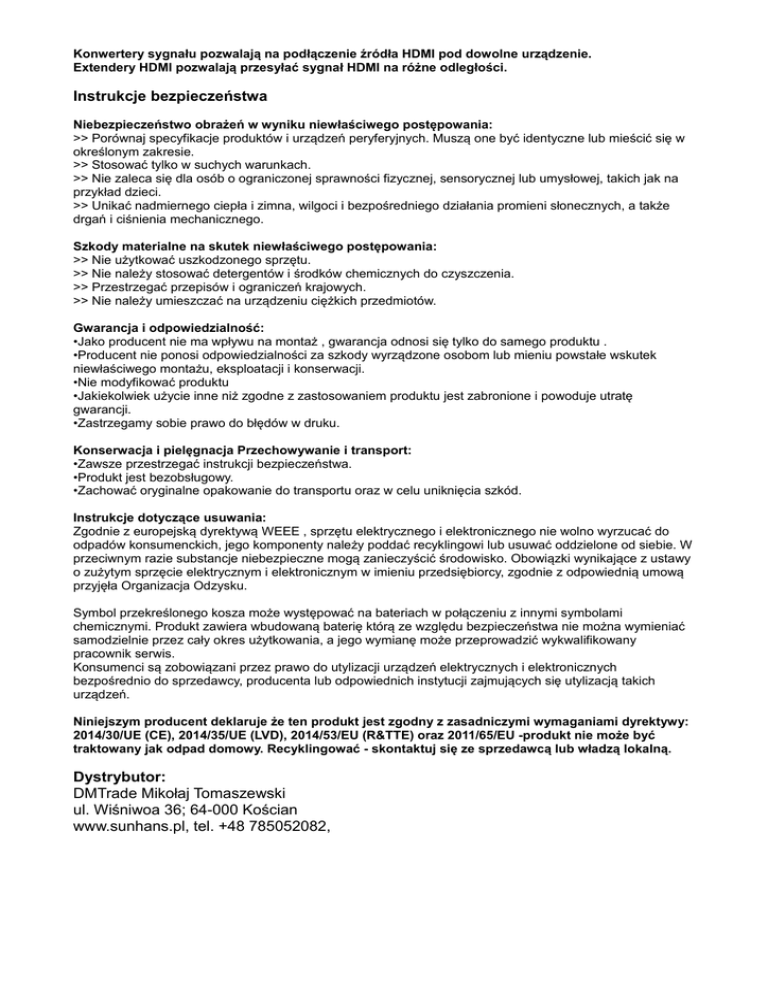 Konwertery sygnału pozwalają na podłączenie źródła HDMI pod dowolne urządzenie. Extendery HDMI pozwalają przesyłać sygnał HDMI na różne odległości. Instrukcje bezpieczeństwa Niebezpieczeństwo obrażeń w wyniku niewłaściwego postępowania: >> Porównaj specyfikacje produktów i urządzeń peryferyjnych. Muszą one być identyczne lub mieścić się w określonym zakresie. >> Stosować tylko w suchych warunkach. >> Nie zaleca się dla osób o ograniczonej sprawności fizycznej, sensorycznej lub umysłowej, takich jak na przykład dzieci. >> Unikać nadmiernego ciepła i zimna, wilgoci i bezpośredniego działania promieni słonecznych, a także drgań i ciśnienia mechanicznego. Szkody materialne na skutek niewłaściwego postępowania: >> Nie użytkować uszkodzonego sprzętu. >> Nie należy stosować detergentów i środków chemicznych do czyszczenia. >> Przestrzegać przepisów i ograniczeń krajowych. >> Nie należy umieszczać na urządzeniu ciężkich przedmiotów. Gwarancja i odpowiedzialność: •Jako producent nie ma wpływu na montaż , gwarancja odnosi się tylko do samego produktu . •Producent nie ponosi odpowiedzialności za szkody wyrządzone osobom lub mieniu powstałe wskutek niewłaściwego montażu, eksploatacji i konserwacji. •Nie modyfikować produktu •Jakiekolwiek użycie inne niż zgodne z zastosowaniem produktu jest zabronione i powoduje utratę gwarancji. •Zastrzegamy sobie prawo do błędów w druku. Konserwacja i pielęgnacja Przechowywanie i transport: •Zawsze przestrzegać instrukcji bezpieczeństwa. •Produkt jest bezobsługowy. •Zachować oryginalne opakowanie do transportu oraz w celu uniknięcia szkód. Instrukcje dotyczące usuwania: Zgodnie z europejską dyrektywą WEEE , sprzętu elektrycznego i elektronicznego nie wolno wyrzucać do odpadów konsumenckich, jego komponenty należy poddać recyklingowi lub usuwać oddzielone od siebie. W przeciwnym razie substancje niebezpieczne mogą zanieczyścić środowisko. Obowiązki wynikające z ustawy o zużytym sprzęcie elektrycznym i elektronicznym w imieniu przedsiębiorcy, zgodnie z odpowiednią umową przyjęła Organizacja Odzysku. Symbol przekreślonego kosza może występować na bateriach w połączeniu z innymi symbolami chemicznymi. Produkt zawiera wbudowaną baterię którą ze względu bezpieczeństwa nie można wymieniać samodzielnie przez cały okres użytkowania, a jego wymianę może przeprowadzić wykwalifikowany pracownik serwis. Konsumenci są zobowiązani przez prawo do utylizacji urządzeń elektrycznych i elektronicznych bezpośrednio do sprzedawcy, producenta lub odpowiednich instytucji zajmujących się utylizacją takich urządzeń. Niniejszym producent deklaruje że ten produkt jest zgodny z zasadniczymi wymaganiami dyrektywy: 2014/30/UE (CE), 2014/35/UE (LVD), 2014/53/EU (R&TTE) oraz 2011/65/EU -produkt nie może być traktowany jak odpad domowy. Recyklingować - skontaktuj się ze sprzedawcą lub władzą lokalną. Dystrybutor: DMTrade Mikołaj Tomaszewski ul. Wiśniwoa 36; 64-000 Kościan www.sunhans.pl, tel. +48 785052082,