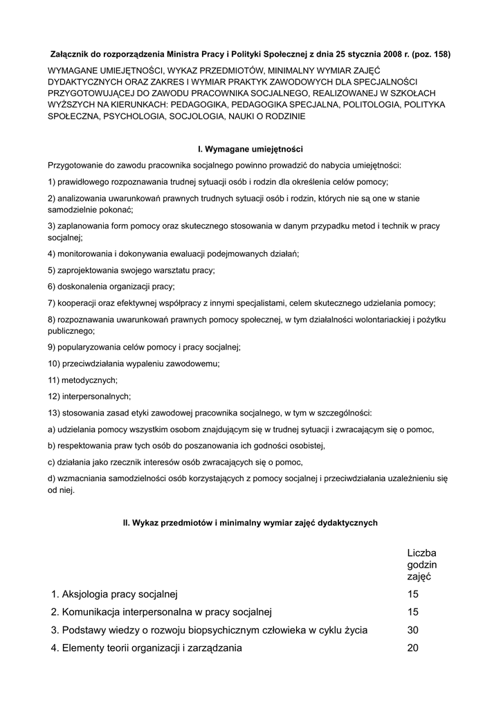 Załącznik do rozporządzenia Ministra Pracy i Polityki Społecznej z dnia 25 stycznia 2008 r. (poz. 158) WYMAGANE UMIEJĘTNOŚCI, WYKAZ PRZEDMIOTÓW, MINIMALNY WYMIAR ZAJĘĆ DYDAKTYCZNYCH ORAZ ZAKRES I WYMIAR PRAKTYK ZAWODOWYCH DLA SPECJALNOŚCI PRZYGOTOWUJĄCEJ DO ZAWODU PRACOWNIKA SOCJALNEGO, REALIZOWANEJ W SZKOŁACH WYŻSZYCH NA KIERUNKACH: PEDAGOGIKA, PEDAGOGIKA SPECJALNA, POLITOLOGIA, POLITYKA SPOŁECZNA, PSYCHOLOGIA, SOCJOLOGIA, NAUKI O RODZINIE I. Wymagane umiejętności Przygotowanie do zawodu pracownika socjalnego powinno prowadzić do nabycia umiejętności: 1) prawidłowego rozpoznawania trudnej sytuacji osób i rodzin dla określenia celów pomocy; 2) analizowania uwarunkowań prawnych trudnych sytuacji osób i rodzin, których nie są one w stanie samodzielnie pokonać; 3) zaplanowania form pomocy oraz skutecznego stosowania w danym przypadku metod i technik w pracy socjalnej; 4) monitorowania i dokonywania ewaluacji podejmowanych działań; 5) zaprojektowania swojego warsztatu pracy; 6) doskonalenia organizacji pracy; 7) kooperacji oraz efektywnej współpracy z innymi specjalistami, celem skutecznego udzielania pomocy; 8) rozpoznawania uwarunkowań prawnych pomocy społecznej, w tym działalności wolontariackiej i pożytku publicznego; 9) popularyzowania celów pomocy i pracy socjalnej; 10) przeciwdziałania wypaleniu zawodowemu; 11) metodycznych; 12) interpersonalnych; 13) stosowania zasad etyki zawodowej pracownika socjalnego, w tym w szczególności: a) udzielania pomocy wszystkim osobom znajdującym się w trudnej sytuacji i zwracającym się o pomoc, b) respektowania praw tych osób do poszanowania ich godności osobistej, c) działania jako rzecznik interesów osób zwracających się o pomoc, d) wzmacniania samodzielności osób korzystających z pomocy socjalnej i przeciwdziałania uzależnieniu się od niej. II. Wykaz przedmiotów i minimalny wymiar zajęć dydaktycznych Liczba godzin zajęć 1. Aksjologia pracy socjalnej 15 2. Komunikacja interpersonalna w pracy socjalnej 15 3. Podstawy wiedzy o rozwoju biopsychicznym człowieka w cyklu życia 30 4. Elementy teorii organizacji i zarządzania 20 5. Struktura i organizacja pomocy społecznej 15 6. System prawny pomocy społecznej w Polsce — pomoc świadczona obywatelom polskim oraz cudzoziemcom 15 7. Prawo rodzinne i opiekuńcze w Polsce, system świadczeń rodzinnych i postępowanie wobec dłużników alimentacyjnych 15 8. Teoretyczne podstawy pracy socjalnej 25 9. Metodyka pracy socjalnej 60 10. Projekt socjalny 30 11. Promocja zatrudnienia, instytucje rynku pracy i zatrudnienie socjalne — organizacja i podstawy prawne 15 12. Działalność pożytku publicznego i wolontariat — podstawy prawne i charakterystyka socjologiczna 15 13. Wspieranie zatrudnienia oraz rehabilitacja osób niepełnosprawnych — organizacja i podstawy prawne 15 14. Organizowanie społeczności lokalnej oraz zasady funkcjonowania samorządu terytorialnego 15 15. Superwizja pracy socjalnej 30 Razem 330 III. Zakres i wymiar praktyk zawodowych 1. Praktyki zawodowe są realizowane w wymiarze ogółem 240 godzin. 2. Zakres praktyk zawodowych: 1) zapoznanie się ze specyfiką funkcjonowania jednostek organizacyjnych pomocy społecznej oraz instytucji i organizacji zajmujących się pomocą i pracą socjalną na rzecz osób i rodzin wymagających wsparcia, w tym: a) strukturą i organizacją placówek, w których student odbywa praktyki, b) rodzajem świadczonych usług, c) specyfiką osób i rodzin korzystających z pomocy społecznej pod względem demograficzno-ekonomicznym oraz psychologiczno-społecznym, d) potrzebami osób i rodzin korzystających z pomocy społecznej, e) stopniem zaspokojenia przez placówki i poza nimi potrzeb osób i rodzin korzystających z pomocy społecznej; 2) aktywne uczestnictwo w działaniach podejmowanych w placówkach, na podstawie umów zawartych z przedstawicielami placówek; 3) nawiązanie kontaktów z osobami i rodzinami korzystającymi z pomocy społecznej świadczonej przez placówki; 4) współdziałanie w rozpoznawaniu, zaspokajaniu oraz uaktywnianiu potrzeb indywidualnych i społecznych osób i rodzin wymagających wsparcia; 5) zebranie materiałów umożliwiających opracowanie i realizację projektów socjalnych.