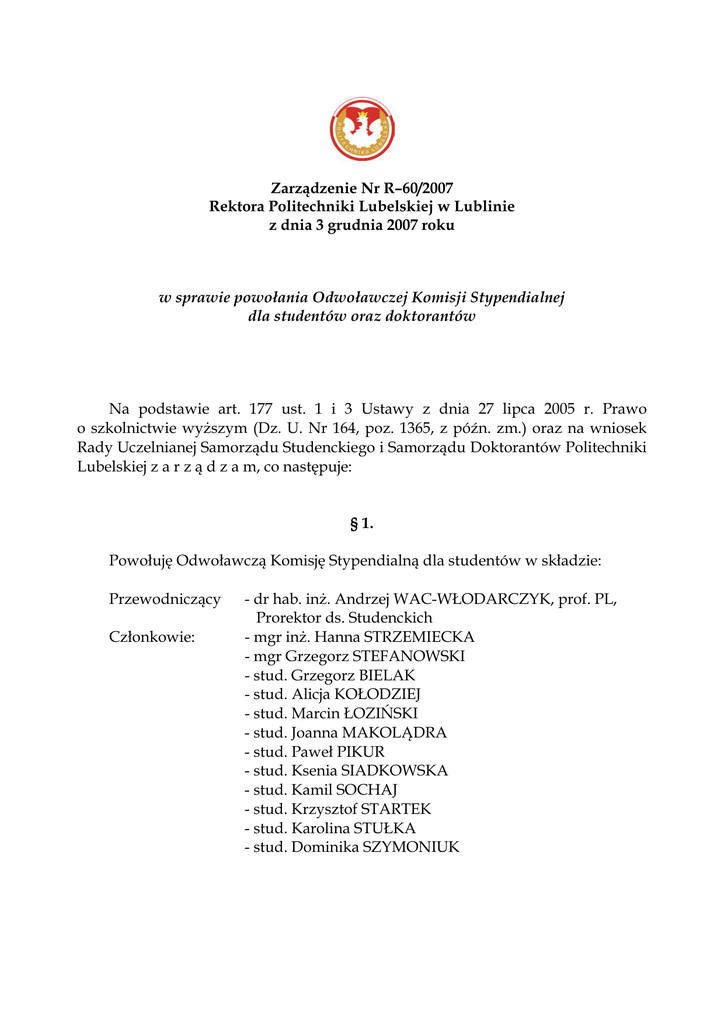 Zarządzenie Nr R–60/2007 Rektora Politechniki Lubelskiej w Lublinie z dnia 3 grudnia 2007 roku w sprawie powołania Odwoławczej Komisji Stypendialnej dla studentów oraz doktorantów Na podstawie art. 177 ust. 1 i 3 Ustawy z dnia 27 lipca 2005 r. Prawo o szkolnictwie wyższym (Dz. U. Nr 164, poz. 1365, z późn. zm.) oraz na wniosek Rady Uczelnianej Samorządu Studenckiego i Samorządu Doktorantów Politechniki Lubelskiej z a r z ą d z a m, co następuje: § 1. Powołuję Odwoławczą Komisję Stypendialną dla studentów w składzie: Przewodniczący Członkowie: - dr hab. inż. Andrzej WAC-WŁODARCZYK, prof. PL, Prorektor ds. Studenckich - mgr inż. Hanna STRZEMIECKA - mgr Grzegorz STEFANOWSKI - stud. Grzegorz BIELAK - stud. Alicja KOŁODZIEJ - stud. Marcin ŁOZIŃSKI - stud. Joanna MAKOLĄDRA - stud. Paweł PIKUR - stud. Ksenia SIADKOWSKA - stud. Kamil SOCHAJ - stud. Krzysztof STARTEK - stud. Karolina STUŁKA - stud. Dominika SZYMONIUK § 2. Powołuję Odwoławczą Komisję Stypendialną dla doktorantów w składzie: Przewodniczący Członkowie: - dr hab. inż. Andrzej WAC-WŁODARCZYK, prof. PL, Prorektor ds. Studenckich - dr hab. inż. Wojciech JARZYNA, prof. PL - mgr inż. Paweł PIEŚKO - mgr inż. Jakub SZABELSKI - mgr inż. Arkadiusz GOLA § 3. Komisje w składzie powołanym w § 1 i § 2 działają w roku akademickim 2007/2008. § 4. Traci moc Zarządzenie Nr R-37/2006 Rektora Politechniki Lubelskiej w Lublinie z dnia 30 października 2006 r. w sprawie powołania Odwoławczej Komisji Stypendialnej. § 5. Zarządzenie wchodzi w życie z dniem podpisania. Rektor Dr hab. inż. Józef Kuczmaszewski, prof. PL