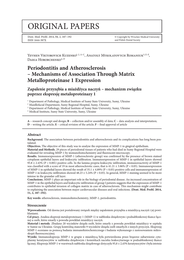 ORIGINAL PAPERs Dent. Med. Probl. 2014, 51, 2, 187–192 ISSN 1644-387X © Copyright by Wroclaw Medical University and Polish Dental Society Yevhen Viktorovich Kuzenko1, 2, A–C, Anatoly Mykolayovych Romaniuk3, E–F, Daria Horobchenko4, D Periodontitis and Atherosclerosis – Mechanisms of Association Through Matrix Metalloproteinase 1 Expression Zapalenie przyzębia a miażdżyca naczyń – mechanizm związku poprzez ekspresję metaloproteinazy 1 Department of Pathology, Medical Institute of Sumy State University, Sumy, Ukraine Maxillofacial Department, Sumy Regional Hospital, Sumy, Ukraine 3 Department of Pathology, Medical Institute of Sumy State University, Sumy, Ukraine 4 Medical Institute, Sumy State University, Sumy, Ukraine 1 2 A – research concept and design; B – collection and/or assembly of data; C – data analysis and interpretation; D – writing the article; E – critical revision of the article; F – final approval of article Abstract Background. The association between periodontitis and atherosclerosis and its complications has long been postulated. Objectives. The objective of this study was to analyze the expression of MMP-1 in gingival epithelium. Material and Methods. 29 pieces of periodontal tissues of patients who had died in Sumy Regional Hospital were evaluated for revealing MMP-1 by immunohistochemistry and fluorescent microscopy. Results. Immunoexpression of MMP-1 (atherosclerotic group) was confirmed by the presence of brown stained cytoplasm epithelial layers and leukocytic infiltration. Immunoexpression of MMP-1 in epithelial layers showed 95.8 ± 2.43% (P < 0.001) positive cells. In the lamina propria leukocytic infiltration, immunoreactivity of MMP-1 was classified with a score of 19 in most atherosclerotic cases, that is 41.21 ± 3.86% (P < 0.05). Immunoexpression of MMP-1 in epithelial layers showed the result of 35.1 ± 4.89% (P < 0.05) positive cells and immunoexpression of MMP-1 in leukocytic infiltration showed 48.23 ± 5.24% (P < 0.05). In general, MMP-1 staining seemed to be more intense in the granular cell layer. Conclusions. MMP-1 plays an important role in the biology of periodontal disease. An increased concentration of MMP-1 in the epithelial layers and leukocytic infiltration of group I patients suggests that the expression of MMP-1 contributes to epithelial invasion of collagen matrix in case of atherosclerosis. This mechanism might contribute to explaining the association between major cardiovascular diseases and oral infections. (Dent. Med. Probl. 2014, 51, 2, 187–192). Key words: atherosclerosis, immunohistochemistry, MMP-1, periodontitis. Streszczenie Wprowadzenie. Od dawna jest postulowany związek między zapaleniem przyzębia a miażdżycą naczyń i jej powikłaniami. Cel pracy. Analiza ekspresji metaloproteinazy 1 (MMP-1) w nabłonku dziąsłowym i podnabłonkowej tkance łącznej u osób, które zmarły z powodu powikłań miażdżycy naczyń. Materiał i metody. Zbadano 20 wycinków dziąsła osób, które zmarły z powodu powikłań miażdżycy w szpitalu w Sumie na Ukrainie. Grupę kontrolną stanowiło 9 wycinków dziąsła osób zmarłych z innych przyczyn. Ekspresję MMP-1 oceniano za pomocą badania immunohistochemicznego i badania wykonanego z zastosowaniem mikroskopii fluorescencyjnej. Wyniki. Immunoekspresja MMP-1 w grupie z miażdżycą była potwierdzona przez brązowe zabarwienie cytoplazmy keratynocytów w nabłonku dziąsłowym i komórkach nacieku leukocytarnego w podnabłonkowej tkance łącznej. Ekspresja MMP-1 w warstwach nabłonka dziąsłowego dotyczyła 95,8 ± 2,43% keratynocytów i była istotnie 188 Y.V. Kuzenko, A.M. Romaniuk, D. Horobchenko większa niż w grupie kontrolnej (p < 0,001). Ekspresja MMP-1 na komórkach nacieku leukocytarnego w tkance łącznej była klasyfikowana w 19 przypadkach i wynosiła 41,21 ± 3,86%. W grupie kontrolnej ekspresja MMP-1 w warstwach nabłonka dziąsłowego dotyczyła 35,1 ± 4,89% keratynocytów oraz 48,23 ± 5,24% komórek nacieku leukocytarnego. Ogólnie ekspresja MMP-1 była największa w warstwie ziarnistej nabłonka. Wnioski. Metaloproteinaza 1 odgrywa istotną rolę w etiologii chorób przyzębia. Nasilona ekspresja MMP-1 w warstwach nabłonka i nacieku leukocytarnego w grupie badanej sugeruje, że ekspresja MMP-1 przyczynia się do inwazji nabłonkowej macierzy kolagenowej w przypadku miażdżycy naczyń. Mechanizm ten mógłby tłumaczyć związek między chorobami sercowo-naczyniowymi a zapaleniem przyzębia. (Dent. Med. Probl. 2014, 51, 2, 187–192). Słowa kluczowe: miażdżyca naczyń, zapalenie przyzębia, immunohistochemia, MMP-1. Periodontal disease involves inflammation of the periodontium and is accompanied by apical migration of junctional epithelium, leading to the destruction of connective tissue attachment and alveolar bone loss [1]. Colonization of endogenous gram-positive and gram-negative periodontal bacteria, including Porphyromonas gingivalis, Aggregatibacter actinomycetem comitans, Tannerella forsythia and Treponema denticola, appears to be the primary initiator of the disease [2]. These products include endotoxins, cytokines and protein toxins [3]. These molecules penetrate the gingival epithelium and initiate a host response that eventually results in the development of periodontal disease. As the biofilm continues to proliferate, soluble compounds penetrate the sulcular epithelium. This, in turn, signals the gingival epithelium to produce chemical mediators including interleukins, prostaglandins, and tumor necrosis factor [4]. Bacterial factors either result in degradation of host tissues or cause the release of MMPs from epithelial tissue cells leading to collagen destruction. Matrix metalloproteinases (MMPs) secreted by cervical and ovarian cancer, especially MMP-2 and MMP-9, play crucial roles in tumor invasion and metastasizing. Among the MMPs, type I collagenase (MMP-1 or interstitial collagenase) degrades the fibrillar co