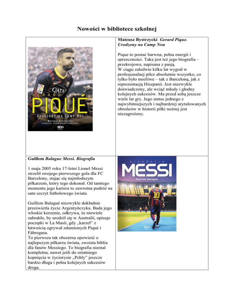 Nowości w bibliotece szkolnej Mateusz Bystrzycki Gerard Pique. Urodzony na Camp Nou Pique to postać barwna, pełna energii i sprzeczności. Taka jest też jego biografia – przekrojowa, napisana z pasją. W ciągu zaledwie kilku lat wygrał w profesjonalnej piłce absolutnie wszystko, co tylko było możliwe – tak z Barceloną, jak z reprezentacją Hiszpanii. Jest niezwykle doświadczony, ale wciąż młody i głodny kolejnych sukcesów. Ma przed sobą jeszcze wiele lat gry. Jego status jednego z najwybitniejszych i najbardziej utytułowanych obrońców w historii piłki nożnej jest niezagrożony. Guillem Balague Messi. Biografia 1 maja 2005 roku 17-letni Lionel Messi strzelił swojego pierwszego gola dla FC Barcelony, stając się najmłodszym piłkarzem, który tego dokonał. Od tamtego momentu jego kariera to zawrotna podróż na sam szczyt futbolowego świata. Guillem Balagué niezwykle dokładnie prześwietla życie Argentyńczyka. Bada jego włoskie korzenie, odkrywa, że niewiele zabrakło, by urodził się w Australii, opisuje początki w La Masíi, gdy „karzeł” z łatwością ogrywał zdumionych Piqué i Fàbregasa. To pierwsza tak obszerna opowieść o najlepszym piłkarzu świata, swoista biblia dla fanów Messiego. To biografia niemal kompletna, nawet jeśli do ostatniego kopnięcia w życiorysie „Pchły” jeszcze bardzo długa i pełna kolejnych sukcesów droga. Paweł Wilkowicz Nienasycony. Robert Lewandowski Po półfinale z Realem usiadł w szatni i zaczął się śmiać sam do siebie. "Czy to się zdarzyło naprawdę? Strzeliłem cztery gole w półfinale Ligi Mistrzów?" Gdy strzelał pięć Wolfsburgowi, był w swoim świecie, widział tylko miny obrońców i chciał więcej. Zdziwił się potem, że to wszystko rozegrało się w ledwie dziewięć minut. Podczas Euro 2016 minie 10 lat, od kiedy w Legii orzekli, że nie ma zdrowia do wielkiego futbolu. Jak to się stało, że Robert Lewandowski wygrał z przeznaczeniem? Jak największy chuderlak w dziecięcych drużynach stał się gladiatorem? "Nienasycony" to książka o obsesji strzelania goli, o sukcesie i jego cenie. O napastniku, który nie chciał przyjąć do wiadomości, że historia taka jak jego nie może się wydarzyć w polskim futbolu. Jacek Podsiadło Czerwona kartka dla Sprężyny Marzenia Daniela mają szansę się spełnić. Został zauważony przez świetnego trenera piłki nożnej i rozpoczął treningi z prawdziwego zdarzenia. Nowi koledzy ze szkółki piłkarskiej, do której trafił, to wyjątkowe oryginały... Łączy ich jedno – miłość do piłki i zapał do gry. Nieubłaganie jednak zbliża się godzina prawdy, czyli pierwsze poważne rozgrywki w Złotej Lidze Juniorów. Tytuł mistrza Warszawy drużyn amatorskich musi być ich! Chłopcy ze wszystkich sił i wszelkimi środkami będą dążyć do zwycięstwa. Otrzymają przy tym niezłą szkołę życia... Niezapomniane piłkarskie emocje gwarantowane! Przyszłość należy do tych, którzy wierzą w piękno swoich marzeń. Eleanor Roosevelt Przeczytaj książki o sportowcach, którzy nie zrezygnowali ze swoich marzeń i pracowali nad tym, by je zrealizować.