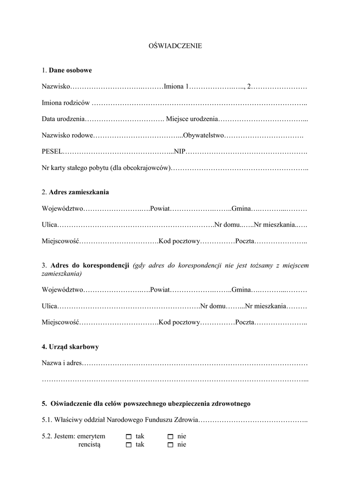 OŚWIADCZENIE 1. Dane osobowe Nazwisko………………………….………Imiona 1……………….….., 2…………………… Imiona rodziców ……………………………………………………………………………….. Data urodzenia……………………………. Miejsce urodzenia………………………………... Nazwisko rodowe………………………………...Obywatelstwo……………………………. PESEL………………………………………...NIP……………………………………………. Nr karty stałego pobytu (dla obcokrajowców)………………………………………………….. 2. Adres zamieszkania Województwo…………………….….Powiat……………….……..Gmina….………...……… Ulica………………………………………………………….Nr domu..…..Nr mieszkania..…. Miejscowość…………………………….Kod pocztowy……………Poczta………………….. 3. Adres do korespondencji (gdy adres do korespondencji nie jest tożsamy z miejscem zamieszkania) Województwo…………………….….Powiat……………….……..Gmina….………...……… Ulica…………………………………………………….Nr domu……...Nr mieszkania……… Miejscowość…………………………….Kod pocztowy……………Poczta………………….. 4. Urząd skarbowy Nazwa i adres…………………………………………………………………………………… …………………………………………………………………………………………………... 5. Oświadczenie dla celów powszechnego ubezpieczenia zdrowotnego 5.1. Właściwy oddział Narodowego Funduszu Zdrowia……………………………………….. 5.2. Jestem: emerytem rencistą tak tak nie nie Nr emerytury lub renty………………………………………………………………………….. 5.3. Posiadam orzeczenie o stopniu niepełnosprawności tak nie Jeśli wpisano TAK, określić orzeczony stopień niepełnosprawności………………………… …………………………………………………………………………………………………... 6. Oświadczenie dla celów powszechnego ubezpieczenia społecznego 6.1 DOTYCZY/NIE DOTYCZY (niewłaściwe przekreślić, jeśli DOTYCZY, wypełnić poniżej) Oświadczam, iż jestem objęty/a ubezpieczeniem emerytalnym i rentownym z tytułu (właściwe zakreślić znakiem X) stosunku pracy członkowstwa w spółdzielni produkcyjnej lub kółek rolniczych stosunku służby w WP, Policji, ABW, SG, PSW, SW, S.C wykonywania umowy zlecenia na rzecz innego zleceniodawcy prowadzenia pozarolniczej działalności gospodarczej na własne nazwisko wykonywania pracy nakładczej z innego tytułu (określić tytuł)……………………………………………………………... …………………………………………………………………………………………………... Równocześnie oświadczam, iż podstawa wymiaru składek na ubezpieczenie społeczne emerytalne i rentowe z określonego przeze mnie tytułu w przeliczeniu na okres miesiąca jest………………………………od kwoty wynagrodzenia minimalnego. (wpisać odpowiednie: niższa, równa, wyższa) 6.2. DOTYCZY/NIE DOTYCZY (niewłaściwe przekreślić, jeśli DOTYCZY, wypełnić poniżej) Oświadczam, iż jestem studentem/uczniem szkoły ponadpodstawowej i nie ukończyłem 26 lat. 6.3. DOTYCZY/NIE DOTYCZY (niewłaściwe przekreślić, jeśli DOTYCZY, wypełnić poniżej) Oświadczam, iż nie jestem objęty/a ubezpieczeniem emerytalnym i rentowym z żadnego tytułu. 7. Oświadczenie dla powiatowego urzędu pracy Oświadczam, iż POZOSTAJĘ/NIE POZOSTAJĘ (nie właściwe przekreślić) w rejestrze bezrobotnych prowadzonym przez Powiatowy Urząd Pracy w………………………………… 8. Oświadczenie dla celów dobrowolnego ubezpieczenia społecznego/chorobowego WNOSZĘ/NIE WNOSZĘ (nie właściwe przekreślić) o objęcie mnie dobrowolnym ubezpieczeniem emerytalnym i rentowym/chorobowym. Oświadczam, iż wszystkie informacje są zgodne ze stanem faktycznym i prawnym, a odpowiedzialność karna za podanie informacji niezgodnych z prawdą lub ich zatajenie jest mi znana. Zobowiązuje się do niezwłocznego poinformowania Zleceniodawcy o wszelkich zmianach dotyczących treści niniejszego oświadczenia oraz przejmuję odpowiedzialność z tytułu niedotrzymania powyższego zobowiązania. Upoważniam Zleceniodawcę do dokonania w moim zgłoszeniu do ubezpieczenia zdrowotnego i/lub społecznego, o ile wykonywanie przeze mnie umowy zlecenia podlegać będzie tym ubezpieczeniom zgodnie z obowiązującymi przepisami …………………………………… Podpis Zleceniobiorcy tel. kontaktowy ………………… Numer rachunku bankowego…………………………………………………………………… ……………………………………. Nazwisko i Imię ………...…….……………. Data ……………………………………. PESEL ……………………………………. Ulica ……………………………………. Kod pocztowy i Miejscowość Akuna Polska Sp. z o.o. ul. 11 Listopada 11 40-387 Katowice OŚWIADCZENIE Oświadczam, że dla sporządzenia informacji o uzyskanych w 2013 roku dochodach i pobranych zaliczkach na podatek dochodowy moim identyfikatorem podatkowym jest: - PESEL………………………..* - NIP……………………………** ………………………….. Podpis * Jeżeli są Państwo tylko Zleceniobiorcą (nie prowadzą działalności gospodarczej) muszą Państwo wpisać tylko PESEL. ** Jeżeli Państwo są jednocześnie Zleceniobiorcą i Przedsiębiorcą muszą Państwo wpisać tylko NIP.