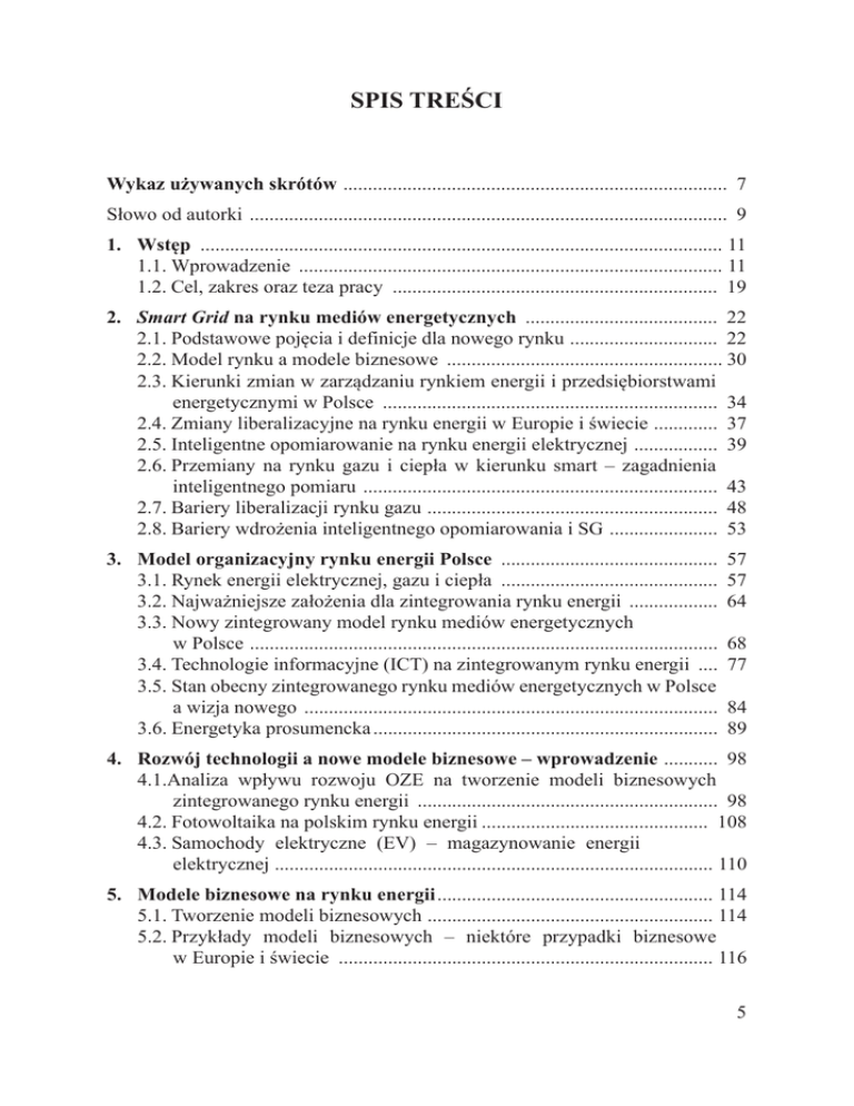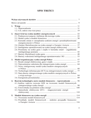 SPIS TREŚCI Wykaz używanych skrótów ............................................................................... 7 Słowo od autorki .................................................................................................. 9 1. Wstęp ........................................................................................................... 11 1.1.Wprowadzenie ....................................................................................... 11 1.2.Cel, zakres oraz teza pracy ................................................................... 19 2. Smart Grid na rynku mediów energetycznych ........................................ 22 2.1.Podstawowe pojęcia i definicje dla nowego rynku ............................... 22 2.2.Model rynku a modele biznesowe ......................................................... 30 2.3.Kierunki zmian w zarządzaniu rynkiem energii i przedsiębiorstwami energetycznymi w Polsce ..................................................................... 34 2.4.Zmiany liberalizacyjne na rynku energii w Europie i świecie .............. 37 2.5.Inteligentne opomiarowanie na rynku energii elektrycznej .................. 39 2.6.Przemiany na rynku gazu i ciepła w kierunku smart – zagadnienia inteligentnego pomiaru ......................................................................... 43 2.7.Bariery liberalizacji rynku gazu ............................................................ 48 2.8.Bariery wdrożenia inteligentnego opomiarowania i SG ....................... 53 3. Model organizacyjny rynku energii Polsce ............................................. 57 3.1.Rynek energii elektrycznej, gazu i ciepła ............................................. 57 3.2.Najważniejsze założenia dla zintegrowania rynku energii ................... 64 3.3.Nowy zintegrowany model rynku mediów energetycznych w Polsce ................................................................................................ 68 3.4.Technologie informacyjne (ICT) na zintegrowanym rynku energii ..... 77 3.5.Stan obecny zintegrowanego rynku mediów energetycznych w Polsce a wizja nowego ..................................................................................... 84 3.6.Energetyka prosumencka....................................................................... 89 4. Rozwój technologii a nowe modele biznesowe – wprowadzenie ............ 98 4.1.Analiza wpływu rozwoju OZE na tworzenie modeli biznesowych zintegrowanego rynku energii .............................................................. 98 4.2.Fotowoltaika na polskim rynku energii............................................... 108 4.3.Samochody elektryczne (EV) – magazynowanie energii elektrycznej .......................................................................................... 110 5. Modele biznesowe na rynku energii......................................................... 114 5.1.Tworzenie modeli biznesowych ........................................................... 114 5.2.Przykłady modeli biznesowych – niektóre przypadki biznesowe w Europie i świecie ............................................................................. 116 5 5.3.Modele biznesowe dla zastosowania PV w Polsce ............................. 120 5.3.1. Zagadnienia wstępne ............................................................... 120 5.3.2. Model biznesowy prosumenta/klienta ..................................... 123 5.3.3. Model biznesowy przedsiębiorstwa typu ESCO ..................... 135 5.3.4. Model biznesowy wytwórcy ................................................... 145 5.3.5. Model biznesowy agregatora rynku ........................................ 152 5.3.6. Model biznesowy użytkowników samochodów elektrycznych na rynku energii ....................................................................... 161 5.4.Dalsze kierunki rozwoju modeli biznesowych dla PV ....................... 170 6. Podsumowanie .......................................................................................... 176 Załącznik 1 ...................................................................................................... 182 Załącznik 2 ...................................................................................................... 187 Bibliografia ..................................................................................................... 189 Spis rysunków ................................................................................................ 205 Spis tabel ......................................................................................................... 206 Od redakcji ...................................................................................................... 207