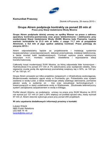 Komunikat Prasowy Złotniki k/Poznania, 29 marca 2010 r. Grupa Atrem podpisuje kontrakty za ponad 20 mln zł Prace przy Stacji Uzdatniania Wody Mosina Grupa Atrem podpisała dzisiaj umowy ze spółką Wamar na prace z zakresu aparatury kontrolno-pomiarowej oraz prace teletechniczne i elektryczne przy modernizacji Stacji Uzdatniania Wody (SUW) Mosina koło Poznania. Łączna wartość kontraktów to 21,5 mln zł netto, z czego 11,7 mln zł przypadnie Atremowi, a 9,8 mln zł jego spółce zależnej Contrast. Prace potrwają do sierpnia 2015 r. Atrem odpowiedzialny będzie za projektowanie i instalację systemów bezpieczeństwa i przeciwpożarowych, telewizji przemysłowej, instalacji telefonicznej, a także montaż kabli światłowodowych. Contrast wykona prace elektryczne dotyczące m.in.: montażu rozdzielni, oświetlenia i wyposażenia stacji transformatorowej. Całkowity koszt modernizacji SUW Mosina, za którą odpowiada lider konsorcjum Hydrobudowa 9 to ponad 217 mln zł. Po zakończeniu prac wydajność obiektu, który zapewnia czystą wodę dla aglomeracji poznańskiej zwiększy się o 50%, ze 100 tys. m3 do 150 tys. m3. Grupa Atrem prowadzi już kilka projektów związanych z infrastrukturą wodociągową. Modernizowała niedawno ujęcie wody w Promienku gm. Pobiedziska oraz system zasilania w wodę Łodzi, a także modernizuje układy zdalnego sterowania, pomiarów jakości wody w systemie on - line oraz wizualizacji technologicznych i towarzyszących w stacji uzdatniania wody w Wieliszewie. Zbudowała telemetryczny system zarządzania zaopatrzeniem w wodę w Elblągu. Portfel zleceń Atremu, po podpisaniu umowy na prace przy SUW Mosina na 2010 rok wynosi już 127 mln zł i jest o 29% większy od portfela sprzed roku, kiedy wynosił 97 mln zł. Atrem obecnie wykonuje prace przy ponad 200 projektach. W celu uzyskania dodatkowych informacji prosimy o kontakt: Łukasz Wójcik NBS Public Relations (22) 826 74 18 [email protected] ATREM oferuje kompleksowe usługi w zakresie szeroko rozumianego zaplecza inżynieryjnego dużych projektów infrastrukturalnych i budowlanych, tj. automatyki przemysłowej, elektroenergetyki oraz klimatyzacji. Do głównych klientów Spółki należą przede wszystkim firmy gazownicze i budowlane jak Polskie Górnictwo Naftowe i Gazownictwo, Gaz - System oraz Grupa PBG. Spółka przy tworzeniu swoich rozwiązań wykorzystuje najnowocześniejsze technologie. Dysponuje wieloma certyfikatami i uprawnieniami branżowymi. Wśród partnerów ATREM są takie międzynarodowe firmy jak: m.in.: Schneider Electric, GE FANUC, IBM, Microsoft, czy polskie Plum i Common. Przewagą konkurencyjną Spółki jest konsekwentnie stosowany model biznesowy, pozwalający na kompleksową obsługę całego łańcucha czynności, począwszy od projektu, poprzez wykonawstwo, na eksploatacji i serwisie wykonanych instalacji kończąc. Od 2007 roku ATREM tworzy Grupę Kapitałową ze spółką CONTRAST (ATREM ma w niej 75% udziałów), która zajmuje się projektowaniem i wykonawstwem sieci i instalacji elektroenergetycznych. Do Grupy w 2008 roku dołączyła spółka ELEKTRO-SYSTEM zajmująca się projektowaniem oraz wykonawstwem sieci i instalacji elektrycznych oraz DOM-MAR, specjalizująca się przede wszystkim w wykonawstwie nowoczesnych systemów klimatyzacyjnych i grzewczych. Celem strategicznym Grupy jest systematyczna rozbudowa oferty, dzięki czemu coraz bardziej kompleksowo będzie mogła realizować złożone projekty w ramach dużych obiektów budowlanych o charakterze infrastrukturalnym, przemysłowym i użyteczności publicznej. Przychody ze sprzedaży Grupy Atrem wyniosły w 2009 r. 137,2 mln zł i były o ponad 21% wyższe niż rok wcześniej. Zysk netto wyniósł 10,7 mln zł co oznacza wzrost o niemal 23% w porównaniu do 2008 r. Rentowność na poziomie brutto w ubiegłym roku wyniosła 9,8%, a netto 7,8%.
