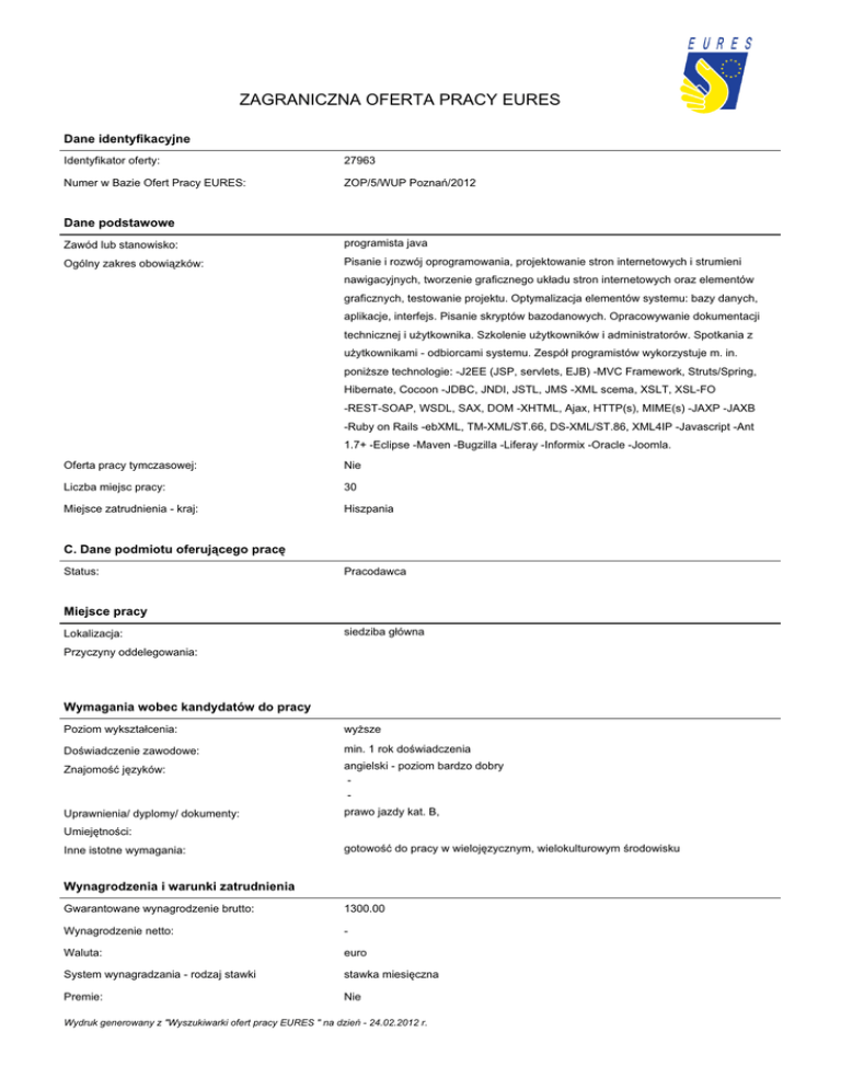ZAGRANICZNA OFERTA PRACY EURES Dane identyfikacyjne Identyfikator oferty: 27963 Numer w Bazie Ofert Pracy EURES: ZOP/5/WUP Poznań/2012 Dane podstawowe Zawód lub stanowisko: programista java Ogólny zakres obowiązków: Pisanie i rozwój oprogramowania, projektowanie stron internetowych i strumieni nawigacyjnych, tworzenie graficznego układu stron internetowych oraz elementów graficznych, testowanie projektu. Optymalizacja elementów systemu: bazy danych, aplikacje, interfejs. Pisanie skryptów bazodanowych. Opracowywanie dokumentacji technicznej i użytkownika. Szkolenie użytkowników i administratorów. Spotkania z użytkownikami - odbiorcami systemu. Zespół programistów wykorzystuje m. in. poniższe technologie: -J2EE (JSP, servlets, EJB) -MVC Framework, Struts/Spring, Hibernate, Cocoon -JDBC, JNDI, JSTL, JMS -XML scema, XSLT, XSL-FO -REST-SOAP, WSDL, SAX, DOM -XHTML, Ajax, HTTP(s), MIME(s) -JAXP -JAXB -Ruby on Rails -ebXML, TM-XML/ST.66, DS-XML/ST.86, XML4IP -Javascript -Ant 1.7+ -Eclipse -Maven -Bugzilla -Liferay -Informix -Oracle -Joomla. Oferta pracy tymczasowej: Nie Liczba miejsc pracy: 30 Miejsce zatrudnienia - kraj: Hiszpania C. Dane podmiotu oferującego pracę Status: Pracodawca Miejsce pracy Lokalizacja: siedziba główna Przyczyny oddelegowania: Wymagania wobec kandydatów do pracy Poziom wykształcenia: wyższe Doświadczenie zawodowe: min. 1 rok doświadczenia Znajomość języków: angielski - poziom bardzo dobry - Uprawnienia/ dyplomy/ dokumenty: prawo jazdy kat. B, Umiejętności: Inne istotne wymagania: gotowość do pracy w wielojęzycznym, wielokulturowym środowisku Wynagrodzenia i warunki zatrudnienia Gwarantowane wynagrodzenie brutto: 1300.00 Wynagrodzenie netto: - Waluta: euro System wynagradzania - rodzaj stawki stawka miesięczna Premie: Nie Wydruk generowany z "Wyszukiwarki ofert pracy EURES " na dzień - 24.02.2012 r. Dodatkowe świadczenia: zakwaterowanie - pomoc pracodawcy;inne do uzgodnienia z pracodawcą Rodzaj umowy: umowa o pracę Wymiar czasu pracy: praca na pełen etat Okres zatrudnienia - czas trwania umowy: określony Data wygaśnięcia umowy: 2015-03-03 Rozkład czasu pracy - liczba godzin tygodniowo: - System czasu pracy - zmiany i praca w dni wolne: Data rozpoczęcia pracy: 2012-03-15 Inne informacje: 1300 - 1600 EUR brutto miesięcznie Sposób składania aplikacji Wymagane dokumenty: CV, list motywacyjny Język składania dokumentów: angielski Do kogo należy wysłać dokumenty: do doradcy EURES z WUP Gdzie należy wysłać dokumenty: [email protected] Dane teleadresowe: [email protected], tel. 618463807 Dodatkowe informacje Data publikacji: 2012-02-21 Data ważności oferty: 2012-06-15 Uprzejmie informujemy, że skontaktujemy się wyłącznie z wybranymi kandydatami. Uwaga: 1. Umowa z zagranicznym pracodawcą jest zawierana, co do zasady, zgodnie z prawem kraju zatrudnienia. Oznacza to, że wszystkie roszczenia odnośnie do warunków, które obejmuje umowa, można kierować wyłącznie do odpowiedniego sądu w kraju zatrudnienia. Publiczne służby zatrudnienia (EURES) nie mogą pośredniczyć ani reprezentować pracownika w sądzie kraju zatrudnienia w przypadku sporu z pracodawcą. 2. Publiczne służby zatrudnienia (EURES) dokładają wszelkich starań, aby zapewnić rzetelność i wiarygodność ofert pracy zgłoszonych w lokalnym urzędzie pracy. Należy wyjaśnić, że oferta pracy została zgłoszona przez stronę trzecią i EURES nie odpowiada za ewentualne rozbieżności między warunkami pracy określonymi w ofercie pracy i warunkami oferowanymi przez potencjalnego pracodawcę. 3. Publiczne służby zatrudnienia (EURES) informują, że będą zbierać, przetwarzać i przekazywać potencjalnym pracodawcom zgodnie z przepisami dotyczącymi ochrony danych osobowych wszystkie dane osobowe dostarczone przez osoby poszukujące pracy. Wydruk generowany z "Wyszukiwarki ofert pracy EURES " na dzień - 24.02.2012 r.