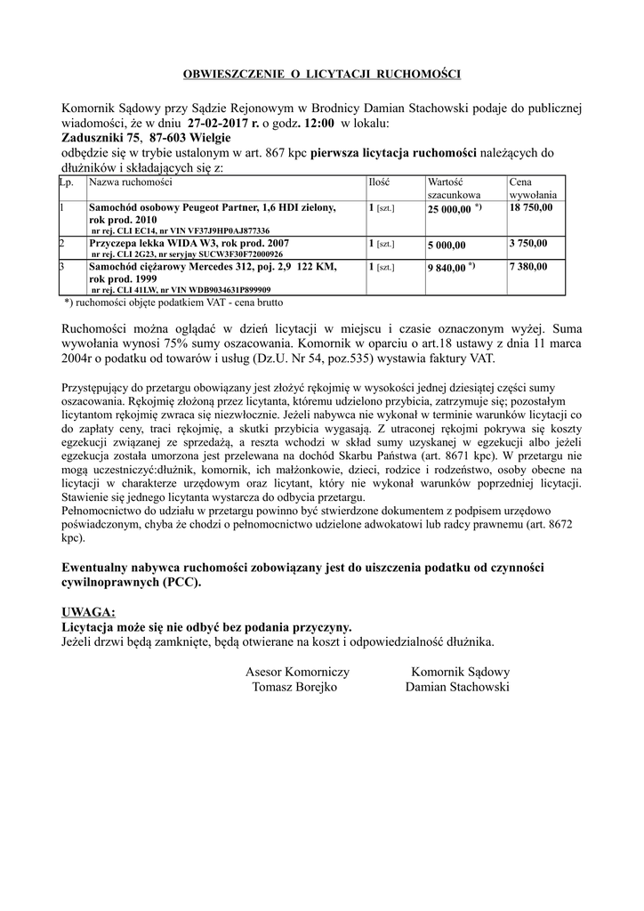 OBWIESZCZENIE O LICYTACJI RUCHOMOŚCI Komornik Sądowy przy Sądzie Rejonowym w Brodnicy Damian Stachowski podaje do publicznej wiadomości, że w dniu 27-02-2017 r. o godz. 12:00 w lokalu: Zaduszniki 75, 87-603 Wielgie odbędzie się w trybie ustalonym w art. 867 kpc pierwsza licytacja ruchomości należących do dłużników i składających się z: Lp. Nazwa ruchomości Ilość 1 [szt.] Wartość szacunkowa 25 000,00 *) Cena wywołania 18 750,00 1 Samochód osobowy Peugeot Partner, 1,6 HDI zielony, rok prod. 2010 1 [szt.] 5 000,00 3 750,00 1 [szt.] 9 840,00 *) 7 380,00 .nr rej. CLI EC14, nr VIN VF37J9HP0AJ877336 2 Przyczepa lekka WIDA W3, rok prod. 2007 .nr rej. CLI 2G23, nr seryjny SUCW3F30F72000926 3 Samochód ciężarowy Mercedes 312, poj. 2,9 122 KM, rok prod. 1999 .nr rej. CLI 41LW, nr VIN WDB9034631P899909 *) ruchomości objęte podatkiem VAT - cena brutto Ruchomości można oglądać w dzień licytacji w miejscu i czasie oznaczonym wyżej. Suma wywołania wynosi 75% sumy oszacowania. Komornik w oparciu o art.18 ustawy z dnia 11 marca 2004r o podatku od towarów i usług (Dz.U. Nr 54, poz.535) wystawia faktury VAT. Przystępujący do przetargu obowiązany jest złożyć rękojmię w wysokości jednej dziesiątej części sumy oszacowania. Rękojmię złożoną przez licytanta, któremu udzielono przybicia, zatrzymuje się; pozostałym licytantom rękojmię zwraca się niezwłocznie. Jeżeli nabywca nie wykonał w terminie warunków licytacji co do zapłaty ceny, traci rękojmię, a skutki przybicia wygasają. Z utraconej rękojmi pokrywa się koszty egzekucji związanej ze sprzedażą, a reszta wchodzi w skład sumy uzyskanej w egzekucji albo jeżeli egzekucja została umorzona jest przelewana na dochód Skarbu Państwa (art. 8671 kpc). W przetargu nie mogą uczestniczyć:dłużnik, komornik, ich małżonkowie, dzieci, rodzice i rodzeństwo, osoby obecne na licytacji w charakterze urzędowym oraz licytant, który nie wykonał warunków poprzedniej licytacji. Stawienie się jednego licytanta wystarcza do odbycia przetargu. Pełnomocnictwo do udziału w przetargu powinno być stwierdzone dokumentem z podpisem urzędowo poświadczonym, chyba że chodzi o pełnomocnictwo udzielone adwokatowi lub radcy prawnemu (art. 8672 kpc). Ewentualny nabywca ruchomości zobowiązany jest do uiszczenia podatku od czynności cywilnoprawnych (PCC). UWAGA: Licytacja może się nie odbyć bez podania przyczyny. Jeżeli drzwi będą zamknięte, będą otwierane na koszt i odpowiedzialność dłużnika. Asesor Komorniczy Tomasz Borejko Komornik Sądowy Damian Stachowski