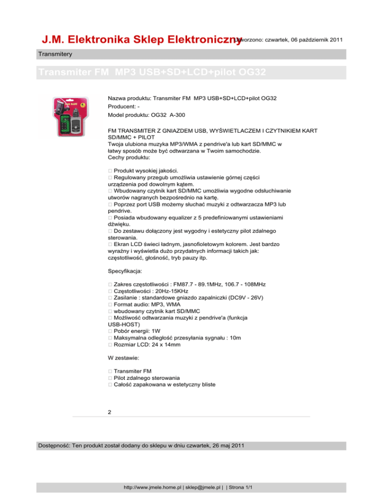 Utworzono: czwartek, 06 październik 2011 J.M. Elektronika Sklep Elektroniczny Transmitery Transmiter FM MP3 USB+SD+LCD+pilot OG32 Nazwa produktu: Transmiter FM MP3 USB+SD+LCD+pilot OG32 Producent: Model produktu: OG32 A-300 FM TRANSMITER Z GNIAZDEM USB, WYŚWIETLACZEM I CZYTNIKIEM KART SD/MMC + PILOT Twoja ulubiona muzyka MP3/WMA z pendrive'a lub kart SD/MMC w łatwy sposób może być odtwarzana w Twoim samochodzie. Cechy produktu: Produkt wysokiej jakości. Regulowany przegub umożliwia ustawienie górnej części urządzenia pod dowolnym kątem. Wbudowany czytnik kart SD/MMC umożliwia wygodne odsłuchiwanie utworów nagranych bezpośrednio na kartę. Poprzez port USB możemy słuchać muzyki z odtwarzacza MP3 lub pendrive. Posiada wbudowany equalizer z 5 predefiniowanymi ustawieniami dźwięku. Do zestawu dołączony jest wygodny i estetyczny pilot zdalnego sterowania. Ekran LCD świeci ładnym, jasnofioletowym kolorem. Jest bardzo wyraźny i wyświetla dużo przydatnych informacji takich jak: częstotliwość, głośność, tryb pauzy itp. Specyfikacja: Zakres częstotliwości : FM87.7 - 89.1MHz, 106.7 - 108MHz Częstotliwości : 20Hz-15KHz Zasilanie : standardowe gniazdo zapalniczki (DC9V - 26V) Format audio: MP3, WMA wbudowany czytnik kart SD/MMC Możliwość odtwarzania muzyki z pendrive'a (funkcja USB-HOST) Pobór energii: 1W Maksymalna odległość przesyłania sygnału : 10m Rozmiar LCD: 24 x 14mm W zestawie: Transmiter FM Pilot zdalnego sterowania Całość zapakowana w estetyczny bliste 2 Dostępność: Ten produkt został dodany do sklepu w dniu czwartek, 26 maj 2011 http://www.jmele.home.pl | [email protected] | | Strona 1/1