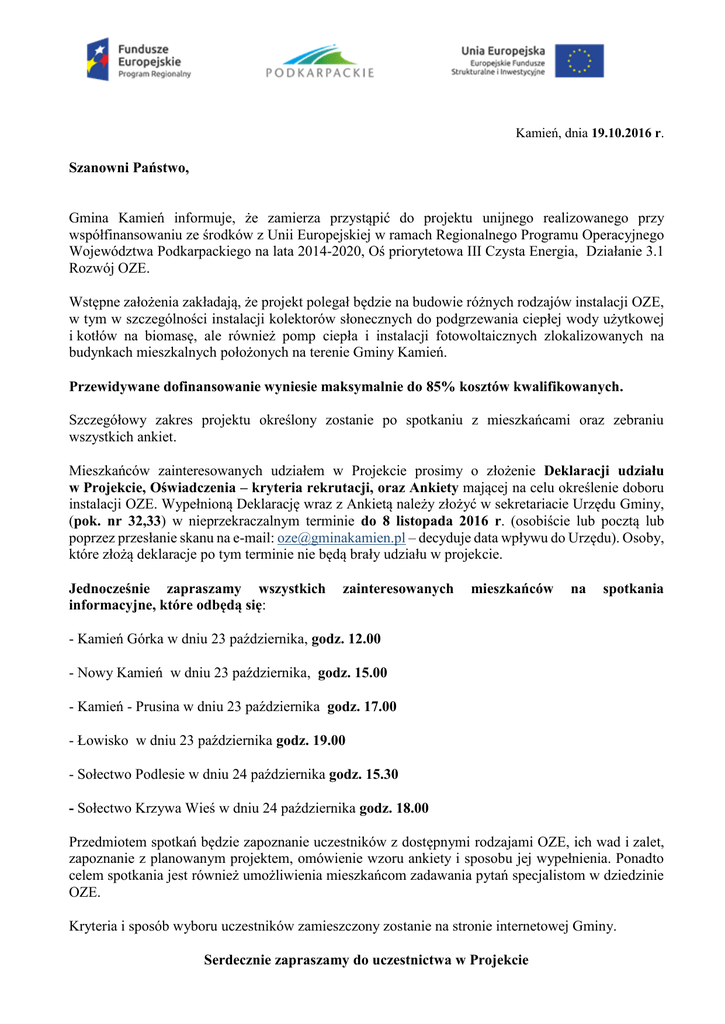 Kamień, dnia 19.10.2016 r. Szanowni Państwo, Gmina Kamień informuje, że zamierza przystąpić do projektu unijnego realizowanego przy współfinansowaniu ze środków z Unii Europejskiej w ramach Regionalnego Programu Operacyjnego Województwa Podkarpackiego na lata 2014-2020, Oś priorytetowa III Czysta Energia, Działanie 3.1 Rozwój OZE. Wstępne założenia zakładają, że projekt polegał będzie na budowie różnych rodzajów instalacji OZE, w tym w szczególności instalacji kolektorów słonecznych do podgrzewania ciepłej wody użytkowej i kotłów na biomasę, ale również pomp ciepła i instalacji fotowoltaicznych zlokalizowanych na budynkach mieszkalnych położonych na terenie Gminy Kamień. Przewidywane dofinansowanie wyniesie maksymalnie do 85% kosztów kwalifikowanych. Szczegółowy zakres projektu określony zostanie po spotkaniu z mieszkańcami oraz zebraniu wszystkich ankiet. Mieszkańców zainteresowanych udziałem w Projekcie prosimy o złożenie Deklaracji udziału w Projekcie, Oświadczenia – kryteria rekrutacji, oraz Ankiety mającej na celu określenie doboru instalacji OZE. Wypełnioną Deklarację wraz z Ankietą należy złożyć w sekretariacie Urzędu Gminy, (pok. nr 32,33) w nieprzekraczalnym terminie do 8 listopada 2016 r. (osobiście lub pocztą lub poprzez przesłanie skanu na e-mail: [email protected] – decyduje data wpływu do Urzędu). Osoby, które złożą deklaracje po tym terminie nie będą brały udziału w projekcie. Jednocześnie zapraszamy wszystkich informacyjne, które odbędą się: zainteresowanych mieszkańców na spotkania - Kamień Górka w dniu 23 października, godz. 12.00 - Nowy Kamień w dniu 23 października, godz. 15.00 - Kamień - Prusina w dniu 23 października godz. 17.00 - Łowisko w dniu 23 października godz. 19.00 - Sołectwo Podlesie w dniu 24 października godz. 15.30 - Sołectwo Krzywa Wieś w dniu 24 października godz. 18.00 Przedmiotem spotkań będzie zapoznanie uczestników z dostępnymi rodzajami OZE, ich wad i zalet, zapoznanie z planowanym projektem, omówienie wzoru ankiety i sposobu jej wypełnienia. Ponadto celem spotkania jest również umożliwienia mieszkańcom zadawania pytań specjalistom w dziedzinie OZE. Kryteria i sposób wyboru uczestników zamieszczony zostanie na stronie internetowej Gminy. Serdecznie zapraszamy do uczestnictwa w Projekcie