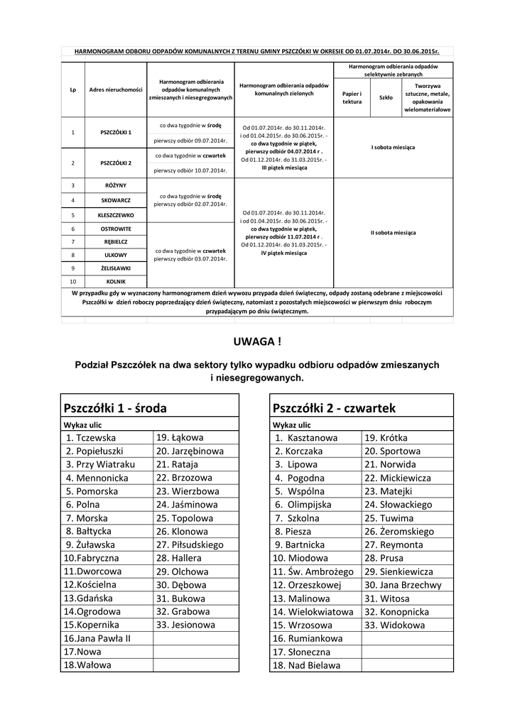 HARMONOGRAM ODBORU ODPADÓW KOMUNALNYCH Z TERENU GMINY PSZCZÓŁKI W OKRESIE OD 01.07.2014r. DO 30.06.2015r. Harmonogram odbierania odpadów selektywnie zebranych Lp Adres nieruchomości Harmonogram odbierania odpadów komunalnych zmieszanych i niesegregowanych co dwa tygodnie w środę 1 PSZCZÓŁKI 1 pierwszy odbiór 09.07.2014r. co dwa tygodnie w czwartek 2 PSZCZÓŁKI 2 pierwszy odbiór 10.07.2014r. 3 RÓŻYNY 4 SKOWARCZ 5 KLESZCZEWKO 6 OSTROWITE 7 RĘBIELCZ 8 ULKOWY 9 ŻELISŁAWKI 10 KOLNIK Harmonogram odbierania odpadów komunalnych zielonych Papier i tektura Szkło Tworzywa sztuczne, metale, opakowania wielomateriałowe Od 01.07.2014r. do 30.11.2014r. i od 01.04.2015r. do 30.06.2015r. co dwa tygodnie w piątek, pierwszy odbiór 04.07.2014 r . Od 01.12.2014r. do 31.03.2015r. III piątek miesiąca I sobota miesiąca Od 01.07.2014r. do 30.11.2014r. i od 01.04.2015r. do 30.06.2015r. co dwa tygodnie w piątek, pierwszy odbiór 11.07.2014 r . Od 01.12.2014r. do 31.03.2015r. IV piątek miesiąca II sobota miesiąca co dwa tygodnie w środę pierwszy odbiór 02.07.2014r. co dwa tygodnie w czwartek pierwszy odbiór 03.07.2014r. W przypadku gdy w wyznaczony harmonogramem dzień wywozu przypada dzień świąteczny, odpady zostaną odebrane z miejscowości Pszczółki w dzień roboczy poprzedzający dzień świąteczny, natomiast z pozostałych miejscowości w pierwszym dniu roboczym przypadającym po dniu świątecznym. UWAGA ! Podział Pszczółek na dwa sektory tylko wypadku odbioru odpadów zmieszanych i niesegregowanych. Pszczółki 1 - środa Pszczółki 2 - czwartek Wykaz ulic Wykaz ulic 1. Tczewska 2. Popiełuszki 3. Przy Wiatraku 4. Mennonicka 5. Pomorska 6. Polna 7. Morska 8. Bałtycka 9. Żuławska 10.Fabryczna 11.Dworcowa 12.Kościelna 13.Gdańska 14.Ogrodowa 15.Kopernika 16.Jana Pawła II 17.Nowa 18.Wałowa 19. Łąkowa 20. Jarzębinowa 21. Rataja 22. Brzozowa 23. Wierzbowa 24. Jaśminowa 25. Topolowa 26. Klonowa 27. Piłsudskiego 28. Hallera 29. Olchowa 30. Dębowa 31. Bukowa 32. Grabowa 33. Jesionowa 1. Kasztanowa 2. Korczaka 3. Lipowa 4. Pogodna 5. Wspólna 6. Olimpijska 7. Szkolna 8. Piesza 9. Bartnicka 10. Miodowa 11. Św. Ambrożego 12. Orzeszkowej 13. Malinowa 14. Wielokwiatowa 15. Wrzosowa 16. Rumiankowa 17. Słoneczna 18. Nad Bielawa 19. Krótka 20. Sportowa 21. Norwida 22. Mickiewicza 23. Matejki 24. Słowackiego 25. Tuwima 26. Żeromskiego 27. Reymonta 28. Prusa 29. Sienkiewicza 30. Jana Brzechwy 31. Witosa 32. Konopnicka 33. Widokowa
