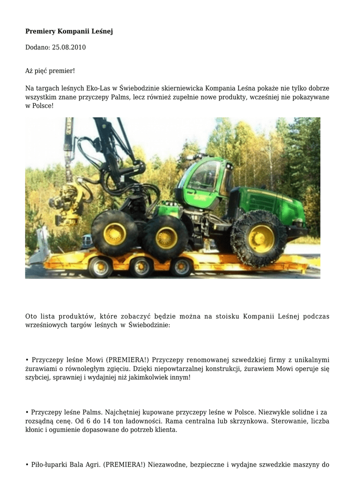 Premiery Kompanii Leśnej Dodano: 25.08.2010 Aż pięć premier! Na targach leśnych Eko-Las w Świebodzinie skierniewicka Kompania Leśna pokaże nie tylko dobrze wszystkim znane przyczepy Palms, lecz również zupełnie nowe produkty, wcześniej nie pokazywane w Polsce! Oto lista produktów, które zobaczyć będzie można na stoisku Kompanii Leśnej podczas wrześniowych targów leśnych w Świebodzinie: • Przyczepy leśne Mowi (PREMIERA!) Przyczepy renomowanej szwedzkiej firmy z unikalnymi żurawiami o równoległym zgięciu. Dzięki niepowtarzalnej konstrukcji, żurawiem Mowi operuje się szybciej, sprawniej i wydajniej niż jakimkolwiek innym! • Przyczepy leśne Palms. Najchętniej kupowane przyczepy leśne w Polsce. Niezwykle solidne i za rozsądną cenę. Od 6 do 14 ton ładowności. Rama centralna lub skrzynkowa. Sterowanie, liczba kłonic i ogumienie dopasowane do potrzeb klienta. • Piło-łuparki Bala Agri. (PREMIERA!) Niezawodne, bezpieczne i wydajne szwedzkie maszyny do przygotowywania drewna opałowego. Model Vedkombi 320, wprowadzony na polski rynek zaledwie pół roku temu, już zdobył uznanie klientów dzięki pomysłowej konstrukcji i atrakcyjnej cenie. • Ciągniki MTZ w zabudowie leśnej. Doskonale wszystkim znane, niezniszczalne białoruskie ciągniki, w specjalnie skonstruowanej na potrzeby polskiego przedsiębiorcy zabudowie. Zabudowa obejmuje osłonę maski, wału, i kabiny oraz obrotowe siedzenie, powiększoną podłogę i tylną szybę przerobioną do pracy z przyczepą. • Niskopodwoziówki Chieftain (PREMIERA!) Przyczepy do przewozu maszyn leśnych, budowlanych i innych. Jedyne niskopodwoziówki na rynku przeznaczone do pracy ze zwykłym ciągnikiem rolniczym. Nie trzeba już wynajmować ciężarówki do transportu harwestera pomiędzy powierzchniami! • Opony leśne Tianli. Opracowane w Szwecji, a mimo to najtańsze na rynku opony do harwesterów i forwarderów. Szesnasto- lub dwudziestowarstwowe. Wzmacniane stalą lub kevlarem. • Głowice nożowe Naarva-Grip (PREMIERA!) Głowice ścinkowe do montowania bez konieczności użycia dodatkowej instalacji hydraulicznej. Średnica ścinki od 23 do 40 cm. Polecane do pracy z żurawiami Mowi. • Miniprzyczepki Vahva-Jussi. Mogą być ciągnione przez quady oraz minitraktory, samochody a nawet konie. Posiadają własny silnik spalinowy napędzający hydraulikę żurawia. Ładowność 1,5 tony. Bogata lista akcesoriów dodatkowych. • Wykaszarki Ilsbo (PREMIERA!) Maszyny do czyszczenia poboczy dróg leśnych. Elementem tnącym nie jest nóż lecz łańcuch, dzięki czemu praca nimi jest bezpieczna i wydajna, a ścięte drzewka nie odrastają. Kandydat do Złotego Medalu Targów! • Maszyny używane. Kompania Leśna sprowadza i serwisuje używane harwestery i forwardery. W Świebodzinie zobaczyć będzie można przy pracy m.in. mały i zwrotny harwester trzebieżowy Rottne 2004 oraz forwarder Timberjack 810. Komentarze (0) Nie dodano jeszcze żadnego komentarza.