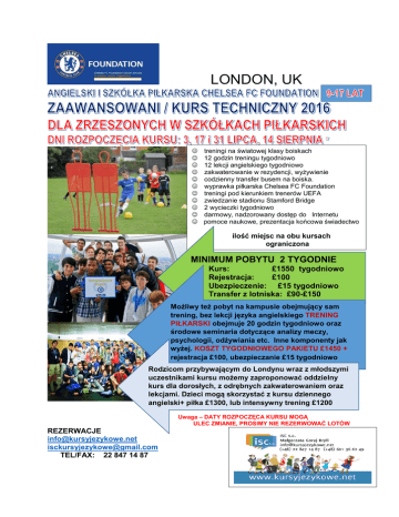 LONDON, UK treningi na światowej klasy boiskach 12 godzin treningu tygodniowo 12 lekcji angielskiego tygodniowo zakwaterowanie w rezydencji, wyżywienie codzienny transfer busem na boiska. wyprawka piłkarska Chelsea FC Foundation treningi pod kierunkiem trenerów UEFA zwiedzanie stadionu Stamford Bridge 2 wycieczki tygodniowo darmowy, nadzorowany dostęp do Internetu pomoce naukowe, prezentacja końcowa świadectwo ilość miejsc na obu kursach ograniczona MINIMUM POBYTU 2 TYGODNIE Kurs: £1550 tygodniowo Rejestracja: £100 Ubezpieczenie: £15 tygodniowo Transfer z lotniska: £90-£150 Możliwy też pobyt na kampusie obejmujący sam trening, bez lekcji języka angielskiego TRENING PIŁKARSKI obejmuje 20 godzin tygodniowo oraz środowe seminaria dotyczące analizy meczy, psychologii, odżywiania etc. Inne komponenty jak wyżej. KOSZT TYGODNIOWEGO PAKIETU £1450 + rejestracja £100, ubezpieczanie £15 tygodniowo Rodzicom przybywającym do Londynu wraz z młodszymi uczestnikami kursu możemy zaproponować oddzielny kurs dla dorosłych, z odrębnych zakwaterowaniem oraz lekcjami. Dzieci mogą skorzystać z kursu dziennego angielski+ piłka £1300, lub intensywny trening £1200 bzakwaterowania Uwaga – DATY ROZPOCZĘCA KURSU MOGĄ ULEC ZMIANIE, PROSIMY NIE REZERWOWAĆ LOTÓW REZERWACJE [email protected] [email protected] TEL/FAX: 22 847 14 87