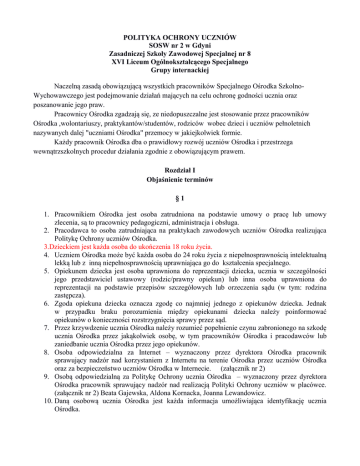 POLITYKA OCHRONY UCZNIÓW SOSW nr 2 w Gdyni Zasadniczej Szkoły Zawodowej Specjalnej nr 8 XVI Liceum Ogólnokształcącego Specjalnego Grupy internackiej Naczelną zasadą obowiązującą wszystkich pracowników Specjalnego Ośrodka SzkolnoWychowawczego jest podejmowanie działań mających na celu ochronę godności ucznia oraz poszanowanie jego praw. Pracownicy Ośrodka zgadzają się, ze niedopuszczalne jest stosowanie przez pracowników Ośrodka ,wolontariuszy, praktykantów/studentów, rodziców wobec dzieci i uczniów pełnoletnich nazywanych dalej "uczniami Ośrodka" przemocy w jakiejkolwiek formie. Każdy pracownik Ośrodka dba o prawidłowy rozwój uczniów Ośrodka i przestrzega wewnątrzszkolnych procedur działania zgodnie z obowiązującym prawem. Rozdział I Objaśnienie terminów §1 1. Pracownikiem Ośrodka jest osoba zatrudniona na podstawie umowy o pracę lub umowy zlecenia, są to pracownicy pedagogiczni, administracja i obsługa. 2. Pracodawca to osoba zatrudniająca na praktykach zawodowych uczniów Ośrodka realizująca Politykę Ochrony uczniów Ośrodka. 3.Dzieckiem jest każda osoba do ukończenia 18 roku życia. 4. Uczniem Ośrodka może być każda osoba do 24 roku życia z niepełnosprawnością intelektualną lekką lub z inną niepełnosprawnością uprawniająca go do kształcenia specjalnego. 5. Opiekunem dziecka jest osoba uprawniona do reprezentacji dziecka, ucznia w szczególności jego przedstawiciel ustawowy (rodzic/prawny opiekun) lub inna osoba uprawniona do reprezentacji na podstawie przepisów szczegółowych lub orzeczenia sądu (w tym: rodzina zastępcza). 6. Zgoda opiekuna dziecka oznacza zgodę co najmniej jednego z opiekunów dziecka. Jednak w przypadku braku porozumienia między opiekunami dziecka należy poinformować opiekunów o konieczności rozstrzygnięcia sprawy przez sąd. 7. Przez krzywdzenie ucznia Ośrodka należy rozumieć popełnienie czynu zabronionego na szkodę ucznia Ośrodka przez jakąkolwiek osobę, w tym pracowników Ośrodka i pracodawców lub zaniedbanie ucznia Ośrodka przez jego opiekunów. 8. Osoba odpowiedzialna za Internet – wyznaczony przez dyrektora Ośrodka pracownik sprawujący nadzór nad korzystaniem z Internetu na terenie Ośrodka przez uczniów Ośrodka oraz za bezpieczeństwo uczniów Ośrodka w Internecie. (załącznik nr 2) 9. Osobą odpowiedzialną za Politykę Ochrony ucznia Ośrodka – wyznaczony przez dyrektora Ośrodka pracownik sprawujący nadzór nad realizacją Polityki Ochrony uczniów w placówce. (załącznik nr 2) Beata Gajewska, Aldona Kornacka, Joanna Lewandowicz. 10. Daną osobową ucznia Ośrodka jest każda informacja umożliwiająca identyfikację ucznia Ośrodka. Rozdział II Procedury interwencji w przypadku krzywdzenia ucznia Ośrodka §2 W przypadku uzyskania przez pracownika Ośrodka i pracodawcę informacji, że dziecko jest krzywdzone, pracownik i pracodawca ma obowiązek sporządzenia notatki służbowej i przekazania uzyskanej informacji koordynatorom wdrażania POD lub dyrektorowi Ośrodka. §3 1. Koordynator lub dyrektor Ośrodka wzywa opiekunów ucznia Ośrodka, którego krzywdzenie podejrzewają oraz informują ich o podejrzeniach. 2. Koordynator lub dyrektor Ośrodka powinien sporządzić opis sytuacji szkolnej i rodzinnej ucznia Ośrodka na podstawie rozmów z uczniem, nauczycielami, wychowawcą i rodzicami oraz plan pomocy uczniowi. 3. Plan pomocy uczniowi Ośrodka powinien zawierać wskazania dotyczące: a. podjęcia przez Ośrodek działań w celu zapewnienia uczniowi Ośrodka bezpieczeństwa, w tym zgłoszenie podejrzenia krzywdzenia do odpowiedniej instytucji; b. wsparcia, jakie Ośrodek zaoferuje uczniowi Ośrodka; c. skierowania ucznia Ośrodka do specjalistycznej placówki, jeśli istnieje taka potrzeba. §4 1. W przypadkach bardziej skomplikowanych dyrektor Ośrodka zwołuje zespół wychowawczy/ interwencyjny , w skład którego mogą wejść: pedagog, psycholog, wychowawca ucznia, dyrektor, inni pracownicy mający wiedzę o krzywdzeniu ucznia Ośrodka lub o uczniu. 2. Zespół wychowawczy/interwencyjny sporządza plan interwencji i pomocy uczniowi Ośrodka, spełniający wymogi określone w § 3 pkt 3 Polityki, na podstawie opisu sporządzonego przez koordynatora lub dyrektora Ośrodka oraz innych, uzyskanych przez członków zespołu, informacji. 3. W przypadku gdy podejrzenie krzywdzenia zgłosili opiekunowie ucznia, zwołanie zespołu jest obligatoryjne. Zespół wychowawczy/interwencyjny wzywa opiekunów ucznia na spotkanie wyjaśniające, podczas którego można zaproponować opiekunom zdiagnozowanie zgłaszanego podejrzenia w zewnętrznej, bezstronnej instytucji. Ze spotkania sporządza się protokół. §5 1. Plan pomocy uczniowi Ośrodka jest przedstawiany przez koordynatora lub dyrektora Ośrodka rodzicom/opiekunom z zaleceniem współpracy przy jego realizacji. 2. Koordynator lub dyrektor szkoły informuje rodziców/opiekunów o obowiązku Ośrodka zgłoszenia podejrzenia krzywdzenia ucznia do odpowiedniej instytucji (prokuratura/policja lub sąd, MOPS, procedura „Niebieskiej Karty”). 3. Po poinformowaniu rodziców przez koordynatora lub dyrektora Ośrodka – zgodnie z punktem poprzedzającym – dyrektor Ośrodka składa zawiadomienie o podejrzeniu przestępstwa do prokuratury/policji lub wniosek o wgląd w sytuację rodziny do Sądu Rejonowego, Wydziału Rodzinny i Nieletnich, lub przesyła formularz „Niebieska Karta-A” do przewodniczącego zespołu wychowawczego/interwencyjnego. 4. Dalszy tok postępowania leży w kompetencji wskazanych w punkcie poprzedzającym instytucji. 5. W przypadku gdy podejrzenia krzywdzenia zgłosili opiekunowie ucznia, a podejrzenie to nie zostało potwierdzone, należy o tym poinformować opiekunów ucznia Ośrodka na piśmie. §6 1. Z przebiegu interwencji sporządza się kartę interwencji, której wzór stanowi załącznik nr 1 do niniejszej Polityki. Kartę załącza się do akt osobowych ucznia Ośrodka