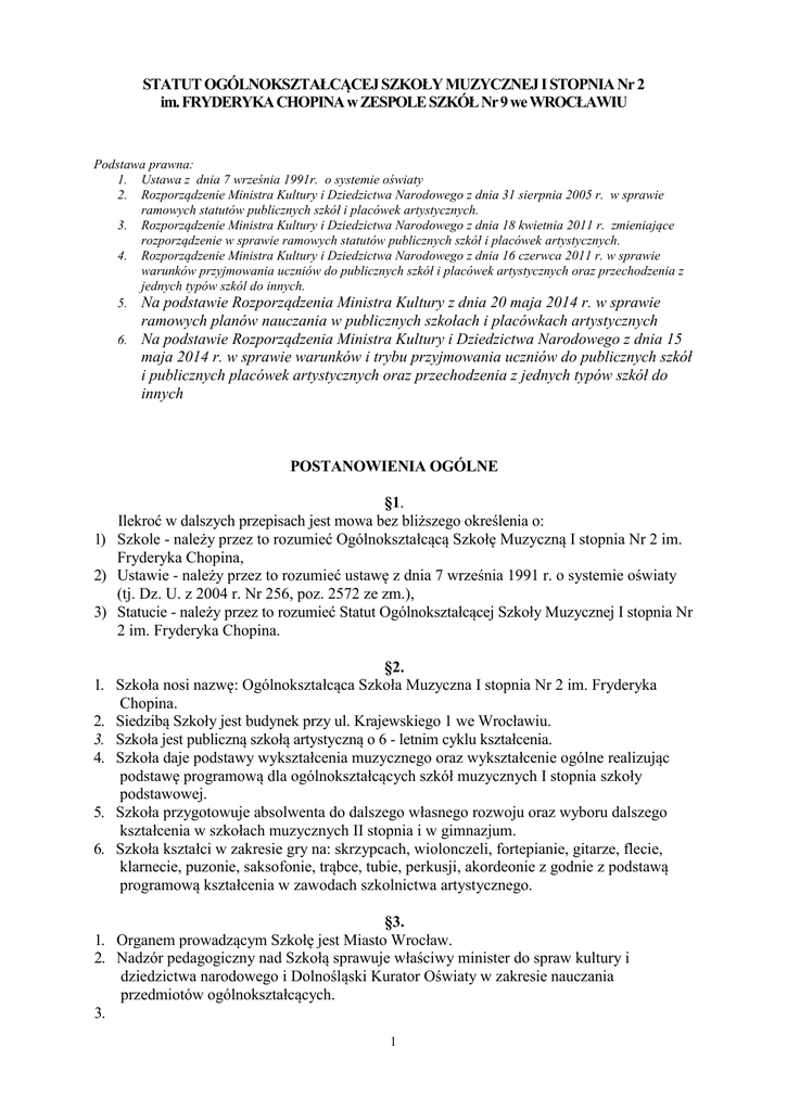 STATUT OGÓLNOKSZTAŁCĄCEJ SZKOŁY MUZYCZNEJ I STOPNIA Nr 2 im. FRYDERYKA CHOPINA w ZESPOLE SZKÓŁ Nr 9 we WROCŁAWIU Podstawa prawna: 1. Ustawa z dnia 7 września 1991r. o systemie oświaty 2. Rozporządzenie Ministra Kultury i Dziedzictwa Narodowego z dnia 31 sierpnia 2005 r. w sprawie ramowych statutów publicznych szkół i placówek artystycznych. 3. Rozporządzenie Ministra Kultury i Dziedzictwa Narodowego z dnia 18 kwietnia 2011 r. zmieniające rozporządzenie w sprawie ramowych statutów publicznych szkół i placówek artystycznych. 4. Rozporządzenie Ministra Kultury i Dziedzictwa Narodowego z dnia 16 czerwca 2011 r. w sprawie warunków przyjmowania uczniów do publicznych szkół i placówek artystycznych oraz przechodzenia z jednych typów szkól do innych. 5. Na podstawie Rozporządzenia Ministra Kultury z dnia 20 maja 2014 r. w sprawie ramowych planów nauczania w publicznych szkołach i placówkach artystycznych 6. Na podstawie Rozporządzenia Ministra Kultury i Dziedzictwa Narodowego z dnia 15 maja 2014 r. w sprawie warunków i trybu przyjmowania uczniów do publicznych szkół i publicznych placówek artystycznych oraz przechodzenia z jednych typów szkół do innych POSTANOWIENIA OGÓLNE §1. Ilekroć w dalszych przepisach jest mowa bez bliższego określenia o: 1) Szkole - należy przez to rozumieć Ogólnokształcącą Szkołę Muzyczną I stopnia Nr 2 im. Fryderyka Chopina, 2) Ustawie - należy przez to rozumieć ustawę z dnia 7 września 1991 r. o systemie oświaty (tj. Dz. U. z 2004 r. Nr 256, poz. 2572 ze zm.), 3) Statucie - należy przez to rozumieć Statut Ogólnokształcącej Szkoły Muzycznej I stopnia Nr 2 im. Fryderyka Chopina. §2. 1. Szkoła nosi nazwę: Ogólnokształcąca Szkoła Muzyczna I stopnia Nr 2 im. Fryderyka Chopina. 2. Siedzibą Szkoły jest budynek przy ul. Krajewskiego 1 we Wrocławiu. 3. Szkoła jest publiczną szkołą artystyczną o 6 - letnim cyklu kształcenia. 4. Szkoła daje podstawy wykształcenia muzycznego oraz wykształcenie ogólne realizując podstawę programową dla ogólnokształcących szkół muzycznych I stopnia szkoły podstawowej. 5. Szkoła przygotowuje absolwenta do dalszego własnego rozwoju oraz wyboru dalszego kształcenia w szkołach muzycznych II stopnia i w gimnazjum. 6. Szkoła kształci w zakresie gry na: skrzypcach, wiolonczeli, fortepianie, gitarze, flecie, klarnecie, puzonie, saksofonie, trąbce, tubie, perkusji, akordeonie z godnie z podstawą programową kształcenia w zawodach szkolnictwa artystycznego. §3. 1. Organem prowadzącym Szkołę jest Miasto Wrocław. 2. Nadzór pedagogiczny nad Szkołą sprawuje właściwy minister do spraw kultury i dziedzictwa narodowego i Dolnośląski Kurator Oświaty w zakresie nauczania przedmiotów ogólnokształcących. 3. 1 CELE I ZADANIA SZKOŁY 1) 2) 3) 4) 5) 6) §4. Szkoła realizuje cele i zadania określone w ustawie koncentrując się na prowadzeniu działalności dydaktycznej, wychowawczej i opiekuńczej. Szkoła kształtuje postawy uczniów w zakresie upowszechniania wartości i norm moralnych takich jak: 1) przestrzeganie prawa i norm społecznego współżycia, 2) poczucie godności narodowej, 3) szacunek do innych narodów, 4) tolerancja rozumiana jako umiejętność szanowania cudzych postaw, opinii i przekonań, 5) upowszechnianie zasad kulturalnego zachowania, 6) kształtowanie wrażliwości estetycznej, aktywności kulturalnej, tradycji, 7) rozwijanie własnych uzdolnień i zamiłowań. Kształcenie i wychowanie w Szkole w szczególności ma na celu: 1) rozbudzanie i rozwijanie podstawowych zdolności muzycznych, 2) umuzykalnienie i przygotowanie wrażliwych i świadomych odbiorców muzyki, 3) przygotowanie podstawy do dalszego kształcenia zawodowego w szkole muzycznej II stopnia oraz do kształcenia w gimnazjum, 4) wychowanie osób oddziaływujących na otoczenie w sferze kultury. Szkoła zapewnia w szczególności: 1) realizację prawa do kształcenia się oraz prawa dzieci i młodzieży do wychowania i opieki, 2) wspomaganie wychowawczej roli rodziny, 3) systematyczne diagnozowanie i modelowanie zachowań uczniów, 4) dostosowanie treści, metod i organizacji nauczania do możliwości psychofizycznych uczniów, 5) rozwijanie uzdolnień uczniów i umożliwianie im realizowania indywidualnych programów nauczania, 6) opiekę i pomoc dla uczniów szczególnie uzdolnionych, 7) bezpieczne i higieniczne warunki nauki, wychowania i opieki, 8) nauczycieli posiadających kwalifikacje zawodowe określone w odrębnych przepisach, 9) przestrzeganie ustalonych przez ministra właściwego do spraw kultury i ochrony dziedzictwa narodowego oraz ministra właściwego do spraw oświaty i wychowania przepisów dotyczących oceniania, klasyfikowania i promowania uczniów oraz przeprowadzania egzaminów. Szkoła realizuje cele, o których mowa w ust. 1, poprzez: 1) prowadzenie zajęć praktycznych i teoretycznych w zakresie przedmiotów muzycznych, 2) naukę w zakresie przedmiotów ogólnokształcących, 3) organizowanie koncertów prezentujących osiągnięcia uczniów przynajmniej raz w roku, 4) organizowanie konkursów szkolnych i międzyszkolnych, 5) uczestniczenie w konkursach organizowanych przez inne szkoły, placówki oświatowe i kulturalne, 6) udział w przesłuchaniach i festiwalach regionalnych, ogólnopolskich i międzynarodowych, 7) wymianę doświadczeń ze szkołami w kraju i za granicą. Szkoła współdziała z jednostkami samorządu terytorialnego i działa na rzecz środowiska poprzez: 1) organizowanie koncertów i popisów, 2 2) organizowanie konkursów upowszechniających działalność kulturalną, 3) udział w formach działalności na rzecz kultury organizowanych przez środowisko. 7) Organizuje i świadczy pomoc psychologiczno-pedagogiczną. 1) pomoc pedagogiczno-psychologiczna polega na: a) rozpoznawaniu i zaspokajaniu indywidualnych potrzeb rozwojowych i edukacyjnych ucznia, b) rozpoznawaniu indywidualnych możliwości psychofizycznych uczn