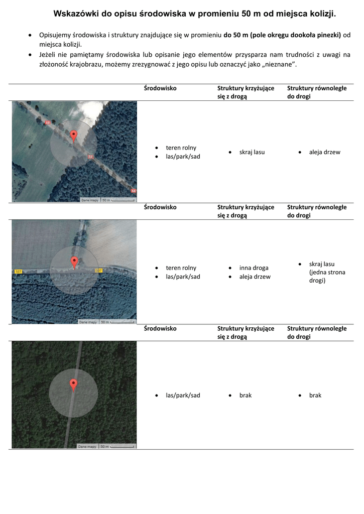 Wskazówki do opisu środowiska w promieniu 50 m od miejsca kolizji. Opisujemy środowiska i struktury znajdujące się w promieniu do 50 m (pole okręgu dookoła pinezki) od miejsca kolizji. Jeżeli nie pamiętamy środowiska lub opisanie jego elementów przysparza nam trudności z uwagi na złożoność krajobrazu, możemy zrezygnować z jego opisu lub oznaczyć jako „nieznane”. Środowisko teren rolny las/park/sad Środowisko teren rolny las/park/sad Środowisko las/park/sad Struktury krzyżujące się z drogą skraj lasu Struktury krzyżujące się z drogą inna droga aleja drzew Struktury krzyżujące się z drogą brak Struktury równoległe do drogi aleja drzew Struktury równoległe do drogi skraj lasu (jedna strona drogi) Struktury równoległe do drogi brak Środowisko teren rolny teren zabudowany las/park/sad Środowisko teren rolny teren zabudowany las/park/sad Struktury krzyżujące się z drogą skraj lasu ogrodzenie Struktury krzyżujące się z drogą Struktury równoległe do drogi żywopłot skraj lasu (jedna strona drogi) ogrodzenie rów Struktury równoległe do drogi skraj lasu aleja drzew żywopłot skraj lasu (jedna strona drogi) rów Teren zabudowany nie oznacza w tym przypadku obszaru zabudowanego w myśl przepisów o ruchu drogowym. Oznacza strukturę środowiska, niekoniecznie zwartą zabudowę, wystarczy jeden budynek. Środowisko teren zabudowany las/park/sad Środowisko teren rolny las/park/sad Struktury krzyżujące się z drogą inna droga ogrodzenie Struktury krzyżujące się z drogą inna droga aleja drzew skraj lasu Struktury równoległe do drogi skraj lasu (jedna strona drogi) ogrodzenie Struktury równoległe do drogi aleja drzew skraj lasu (jedna strona drogi) Środowisko teren rolny las/park/sad Struktury krzyżujące się z drogą żywopłot ogrodzenie Struktury równoległe do drogi aleja drzew żywopłot skraj lasu (jedna strona drogi) ogrodzenie W lewej górnej ćwiartce znajduje się sad. Sady i ogrody porośnięte drzewami umieszczamy w kategorii „las/park/sad”. Środowisko las/park/sad zbiornik wodny Środowisko zbiornik wodny rzeka teren podmokły Środowisko inne Struktury krzyżujące się z drogą inna droga Struktury krzyżujące się z drogą rzeka Struktury krzyżujące się z drogą brak Struktury równoległe do drogi brak Struktury równoległe do drogi brak Struktury równoległe do drogi ogrodzenie rów Do kategorii „inne” przypisujemy wszystkie pozostałe siedliska niepasujące do wymienionych powyżej. Będą to siedliska bezdrzewne, otwarte takie jak tereny ruderalne, ugory, obszary trawiaste nieużytkowane rolniczo (np. trawniki miejskie, tereny trawiaste w obrębie zjazdów i pętli drogowych).