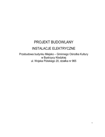 PROJEKT BUDOWLANY INSTALACJE ELEKTRYCZNE Przebudowa budynku Miejsko – Gminnego Ośrodka Kultury w Bystrzycy Kłodzkiej ul. Wojska Polskiego 20, działka nr 965 1 ZAWARTOŚĆ OPRACOWANIA 1. SPIS ZAWARTOŚCI 2. OPIS TECHNICZNY 3. RYSUNKI Lp. Numer Nazwa rysunku Skala 1. IE-01 Rzut Piwnicy. Instalacje elektryczne 1:75 IE-02 Rzut Parteru. Instalacje elektryczne 1:75 IE-03 Rzut 1 Piętra. Instalacje elektryczne 1:75 IE-04 Rzut 2 Piętra. Instalacje elektryczne 1:75 IE-05 Rzut Strychu. Instalacje elektryczne 1:75 IE-06 Rzut Dachu. Instalacje elektryczne 1:75 IE-07 Schemat zasilania obiektu - IE-08 Rozdzielnica RGnn - IE-09 Istn. Rozdzielnica RE1 - Przebudowa - IE-10 Istn. Rozdzielnica RE2 - Rozbudowa - IE-11 Rozdzielnica RE2a - IE-12 Istn. Rozdzielnica RE5 - Rozbudowa - 2. 3. 4. 5. 6. 7. 8. 9. 10. 11. 12. 2 13. IE-13 Rozdzielnica RE6 - IE-14 Rozdzielnica RE7 - IE-15 Rozdzielnica RE8 - IE-16 Rozdzielnica RE9 - IE-17 Rozdzielnica RE10 - IE-18 Rozdzielnica RE12 - IE-19 Rozdzielnica REW - IE-20 Zestaw zasilający RET - IE-21 Schemat systemów oddymiania - 14. 15. 16. 17. 18. 19. 20. 21. 22. 3 OPIS TECHNICZNY 1. Informacje ogólne 1.1 Przedmiot i zakres opracowania Przedmiotem opracowania jest projekt budowlany instalacji elektrycznych dla inwestycji „Przebudowa budynku Miejsko – Gminnego Ośrodka Kultury w Bystrzycy Kłodzkiej” przy ul. Wojska Polskiego 20, na działce nr 965, w miejscowości Bystrzyca Kłodzka. Projekt obejmuje: − rozdział energii elektrycznej, − instalacja oświetlenia, − instalacja oświetlenia ewakuacyjnego, − instalacja oświetlenia kierunków ewakuacji, − instalacja gniazd wtykowych, − instalacja zasilania odbiorów siłowych, − instalacja zasilania urządzeń wentylacyjnych, − instalacja ochrony przetężeniowej i przeciwporażeniowej, − instalacja ochrony przeciwprzepięciowej, − instalacje oddymiania klatek schodowych, Projekt nie obejmuje: − instalacji teletechnicznych, − SSWiN, − − − − 1.2 Podstawa opracowania zlecenie wykonania projektu, podkłady architektoniczne, uzgodnienia międzybranżowe, obowiązujące przepisy i normy. 2. Instalacje elektryczne 2.1 Zasilanie obiektu w energię elektryczną 2.1.1 Stan istniejący Istniejący budynek Miejsko – Gminnego Ośrodka Kultury zasilany jest prądem przemiennym 3 – fazowym, w układzie 4 – przewodowym, na napięcie 230V/400V, 50Hz z istniejącej sieci Tauron Dystrybucja S.A., istniejącym przyłączem kablowym nn. Przyłącze wprowadzone jest do istniejącej rozdzielnicy głównej budynku, oznaczonej, jako RGL-DK, na zaciski wejściowe istniejącego rozłącznika kompaktowego. Moc przyłączeniowa wynosi 40 kW. 2.1.2 Układ projektowany W związku z projektowaną przebudową i rozbudową obiektu moc przyłączeniowa zostanie zwiększona do 170kW. Budowa nowego przyłącza energetycznego jest przedmiotem odrębnego opracowania. Obiekt zasilany będzie, tak jak dotychczas, prądem przemiennym 3 – fazowym, w układzie 4 – przewodowym, na napięcie 230V/400V, 50Hz z istniejącej sieci Tauron Dystrybucja S.A., nowym przyłączem kablowym nn, wybudowanym, zgodnie z odpowiednim opracowaniem przyłącza. 4 Należy wybudować nową rozdzielnię główną obiektu, zlokalizowaną, zgodnie z rzutem Parteru, w wydzielonym pomieszczeniu. Rozdzielnia zasilana będzie nowym przyłączem kablowym nn. Rozdzielnia RGnn przejmie wszystkie funkcje istniejącej rozdzielnicy RG-DK, którą należy zdemontować i unieczynnić, wraz z istniejącym przyłączem kablowym. 2.1.3 Wyłącznik pożarowy Funkcję wyłącznika pożarowego pełnić będzie rozłącznik izolacyjny 400A, zabudowany za układem pomiarowym w rozdzielnicy RGnn. Rozłącznik wyposażony ma być w cewkę wyzwalającą 230V, uruchamianą przyciskami sterującymi, zabudowanymi przy wejściach do budynku. Przyciski wyłącznika pożarowego umiejscowione mają być obudowach IP55. Połączenia przycisków z wyłącznikiem pożarowym mają być wykonane przewodami o podwyższonej odporności ogniowej. 2.2 Rozdział energii Wszystkie rozdzielnice w obiekcie mają być zasilane z rozdzielni głównej RGnn. Istniejącą rozdzielnicę RE1 należy zasilić nową linią kablową K1 z RGnn. Zasilanie istniejących rozdzielnic RE2, RE3, RE4, RE5, rozdzielnicy przedszkola z rozdzielnicy RE1 pozostaje bez zmian. Istniejącą rozdzielnicę RE6 należy zdemontować i zainstalować nową rozdzielnicę RE6, wyposażoną zgodnie ze schematem, w miejscu nowej lokalizacji, zgodnie z rzutem. Zasilanie należy wykonać nową linią kablową K6 z rozdzielnicy głównej RGnn. Dotychczasowe zasilanie z rozdzielnicy RE1 należy unieczynnić. Projektowaną rozdzielnicę RE7 należy zasilić z rozdzielni głównej RGnn linią kablową K7. Istniejącą rozdzielnicę RWC (poprzez wyłącznik główny kotłowni), należy zasilić nową linią kablową K13. Projektowane rozdzielnice RE8 i RE9 i istniejącą rozdzielnicę RE11 (zasilania systemów antyoblodzeniowych) należy zasilić odpowiednio projektowanymi liniami kablowymi K8, K9 i K11 z rozdzielnicy RE7. Rozdzielnicę RE10 Reżyserki należy zasilić z rozdzielnicy głównej RGnn linią kablową K10. Projektowaną rozdzielnicę RE2a zaplecza Sali konsumpcyjnej należy zasilić istniejącą linią kablową K2a z rozdzielnicy RE2. Projektowaną rozdzielnicę RE12 w Piwnicy należy zasilić projektowaną linią kablową K12 z istniejącej rozdzielnicy RE5. Projektowaną rozdzielnicę REW dla zasilania urządzeń wentylacyjno – klimatyzacyjnych należy zasilić linia kablową K19 z RGnn. Istniejącą centralę CKD1 klap oddymiających klatki schodowej D należy zasilić nową linią kablową K14, wyprowadzoną z sekcji pożarowej, przed wyłącznikiem pożarowym, w rozdzielnicy RGnn. Istniejącą centralę CKD2 klap oddymiających bocznej, lewej, klatki schodowej E należy zasilić nową linią kablową K15, wyprowadzoną z sekcji pożarowej, przed wyłącznikiem pożarowym, w rozdzielnicy RGnn, poprowadzoną
