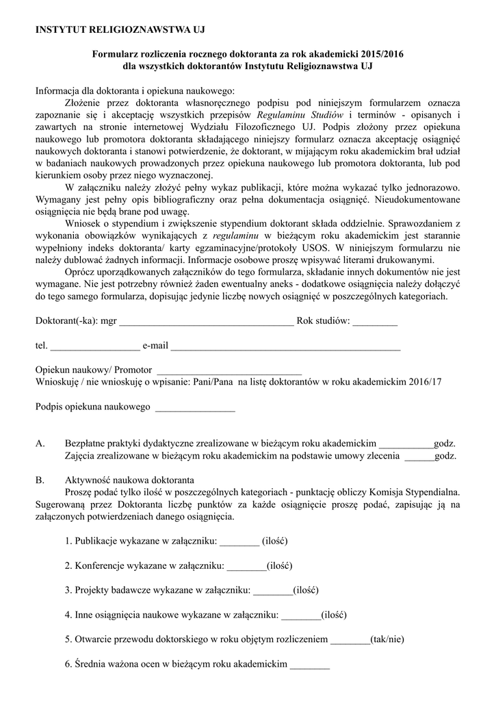 INSTYTUT RELIGIOZNAWSTWA UJ Formularz rozliczenia rocznego doktoranta za rok akademicki 2015/2016 dla wszystkich doktorantów Instytutu Religioznawstwa UJ Informacja dla doktoranta i opiekuna naukowego: Złożenie przez doktoranta własnoręcznego podpisu pod niniejszym formularzem oznacza zapoznanie się i akceptację wszystkich przepisów Regulaminu Studiów i terminów - opisanych i zawartych na stronie internetowej Wydziału Filozoficznego UJ. Podpis złożony przez opiekuna naukowego lub promotora doktoranta składającego niniejszy formularz oznacza akceptację osiągnięć naukowych doktoranta i stanowi potwierdzenie, że doktorant, w mijającym roku akademickim brał udział w badaniach naukowych prowadzonych przez opiekuna naukowego lub promotora doktoranta, lub pod kierunkiem osoby przez niego wyznaczonej. W załączniku należy złożyć pełny wykaz publikacji, które można wykazać tylko jednorazowo. Wymagany jest pełny opis bibliograficzny oraz pełna dokumentacja osiągnięć. Nieudokumentowane osiągnięcia nie będą brane pod uwagę. Wniosek o stypendium i zwiększenie stypendium doktorant składa oddzielnie. Sprawozdaniem z wykonania obowiązków wynikających z regulaminu w bieżącym roku akademickim jest starannie wypełniony indeks doktoranta/ karty egzaminacyjne/protokoły USOS. W niniejszym formularzu nie należy dublować żadnych informacji. Informacje osobowe proszę wpisywać literami drukowanymi. Oprócz uporządkowanych załączników do tego formularza, składanie innych dokumentów nie jest wymagane. Nie jest potrzebny również żaden ewentualny aneks - dodatkowe osiągnięcia należy dołączyć do tego samego formularza, dopisując jedynie liczbę nowych osiągnięć w poszczególnych kategoriach. Doktorant(-ka): mgr ___________________________________ Rok studiów: _________ tel. __________________ e-mail ______________________________________________ Opiekun naukowy/ Promotor _____________________________ Wnioskuję / nie wnioskuję o wpisanie: Pani/Pana na listę doktorantów w roku akademickim 2016/17 Podpis opiekuna naukowego ________________ A. Bezpłatne praktyki dydaktyczne zrealizowane w bieżącym roku akademickim ___________godz. Zajęcia zrealizowane w bieżącym roku akademickim na podstawie umowy zlecenia ______godz. B. Aktywność naukowa doktoranta Proszę podać tylko ilość w poszczególnych kategoriach - punktację obliczy Komisja Stypendialna. Sugerowaną przez Doktoranta liczbę punktów za każde osiągnięcie proszę podać, zapisując ją na załączonych potwierdzeniach danego osiągnięcia. 1. Publikacje wykazane w załączniku: ________ (ilość) 2. Konferencje wykazane w załączniku: ________(ilość) 3. Projekty badawcze wykazane w załączniku: ________(ilość) 4. Inne osiągnięcia naukowe wykazane w załączniku: ________(ilość) 5. Otwarcie przewodu doktorskiego w roku objętym rozliczeniem ________(tak/nie) 6. Średnia ważona ocen w bieżącym roku akademickim ________ Data i podpis doktoranta ___________________________________________________