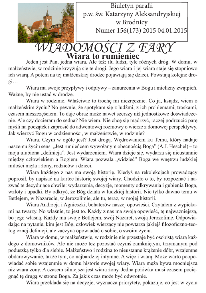 Biuletyn parafii p.w. św. Katarzyny Aleksandryjskiej w Brodnicy Numer 156(173) 2015 04.01.2015 WIADOMOŚCI Z FARY Wiara to rumieniec Jeden jest Pan, jedna wiara. Ale też: ilu ludzi, tyle różnych dróg. W domu, w małżeństwie, w rodzinie krzyżują się te drogi. Jego wiara i jej wiara staje się stopniowo ich wiarą. A potem na tej małżeńskiej drodze pojawiają się dzieci. Powstają kolejne drogi… Wiara ma swoje przypływy i odpływy – zanurzenia w Bogu i mielizny zwątpień. Ważne, by nie ustać w drodze. Wiara w rodzinie. Właściwie to trochę mi niezręcznie. Co ja, ksiądz, wiem o małżeńskim życiu? No pewnie, że spotykam się z ludźmi, z ich problemami, troskami, czasem nieszczęściem. To daje obraz może nawet szerszy niż jednostkowe doświadczenie. Ale czy docieram do sedna? Nie wiem. Nie chcę się mądrzyć, raczej podrzucić parę myśli na początek i zaprosić do adwentowej rozmowy o wierze z domowej perspektywy. Jak wierzyć Bogu w codzienności, w małżeństwie, w rodzinie? Wiara. Czym w ogóle jest? Jest drogą. Wędrowaniem ku Temu, który nadaje naszemu życiu sens. „Jest rumieńcem wywołanym obecnością Boga” (A.J. Heschel) – to moja ulubiona „definicja”. Jest wydarzeniem. Wiara dzieje się, wydarza się nieustannie między człowiekiem a Bogiem. Wiara pozwala „widzieć” Boga we wnętrzu ludzkiej miłości męża i żony, rodziców i dzieci. Wiara każdego z nas ma swoją historię. Kiedyś na rekolekcjach prowadzący poprosił, by napisać na kartce historię swojej wiary. Chodziło o to, by rozpoznać i nazwać te decydujące chwile: wydarzenia, decyzje, momenty odkrywania i gubienia Boga, wzloty i upadki. By odkryć, że Bóg działa w ludzkiej historii. Nie tylko dawno temu w Betlejem, w Nazarecie, w Jerozolimie, ale tu, teraz, w mojej historii. Wiara Andrzeja i Agnieszki, bohaterów naszej opowieści. Czytałem z wypiekami na twarzy. No właśnie, to jest to. Każdy z nas ma swoją opowieść, tę najważniejszą, bo jego własną. Każdy ma swoje Betlejem, swój Nazaret, swoją Jerozolimę. Odpowiadając na pytanie, kim jest Bóg, człowiek wierzący nie powtarza jakiejś filozoficzno-teologicznej definicji, ale zaczyna opowiadać o sobie, o swoim życiu. Wiara w domu, w małżeństwie, w rodzinie nie przestaje być osobistą wiarą każdego z domowników. Ale nie może też pozostać czymś zamkniętym, trzymanym pod poduszką tylko dla siebie. Małżeństwo i rodzina to nieustanne krążenie dóbr, wzajemne obdarowywanie, także tym, co najbardziej intymne. A więc i wiarą. Może warto poopowiadać sobie wzajemnie w domu historie swojej wiary. Wiara męża bywa mocniejsza niż wiara żony. A czasem silniejsza jest wiara żony. Jedna połówka musi czasem pociągnąć tę drugą w stronę Boga. Za jakiś czas może być odwrotnie. Wiara przekłada się na decyzje, wyznacza priorytety, pokazuje, co jest w życiu najważniejsze, a co mniej ważne lub w ogóle nieistotne. We dwoje nie zawsze łatwo jest ustalać wspólne stanowisko, wybierać wspólną drogę… Ale jeśli on i ona pytają Boga, to czy On może udzielić im różnych odpowiedzi? Im bliżej Boga, tym bliżej siebie. Czy nie tak? Wiara to okulary, które pomagają widzieć rzeczy w prawdzie. Przez okulary patrzy się na wszystko. Tak samo przez wiarę trzeba patrzeć na wszystko. Wiara nadaje sens prozie życia, nawet cierpieniu. My sami nie wymyślamy tego sensu. Sens przychodzi do nas, można go tylko przyjąć lub odrzucić. Nie da się przebierać w prawdach wiary czy moralności, tak jak się przebiera między towarami czy ciuchami na zakupach. To mi pasuje, a to nie; z tym się zgadzam, a to niech Kościół zmieni. Wiara jest zbudowana na autorytecie Boga: albo On jest dla mnie Bogiem, albo nie. Albo przyznaję Mu rację, albo uważam się za mądrzejszego. Czy Bóg może chcieć od nas czegoś, co byłoby dla nas złe? Wiara ma swoją cenę. Musi nas kosztować. Towarzyszy jej nieraz pokusa zwątpienia, rezygnacji, pójścia na skróty, bo coś mi się przecież od życia należy. Wiara w małżeństwie, w rodzinie też ma swoje próby. Może najtrudniejsze są te, gdy jedna „połówka” zaczyna kwestionować wiarę drugiej „połówki”. Próba jest ważna. Dowiadujemy się wtedy, czy Bóg coś dla nas naprawdę znaczy. Wiara to ciągłe wracanie na właściwą drogę. Czasem to tylko lekkie korekty kursu, czasem konieczność radykalnego zawrócenia z błędnej drogi. Wiara to wierność Bogu, nawet wtedy, gdy dopada nas ciemność. Wiara jest zawsze zagrożona rutyną, znudzeniem. Bóg nie jest nudny, ale nasze modlitwy, kazania, nabożeństwa nieraz tak, i to bardzo. Jak napisał Roman Brandstaetter: „chcąc naprawdę wierzyć w Ciebie, Boże, musimy zostać artystami wiary. I nieustannie tę wiarę zdobywać”. Wiara jest łaską. Trzeba o nią prosić Boga: dla siebie, dla żony, dla męża, dla dziecka. W ciszy, w chwilach samotności lub wspólnie. Jedno „Ojcze nasz”, wypowiedziane razem głośno, czyni obecność Boga w domu czymś bardziej widzialnym i słyszalnym. Wiara rodziców jest fundamentem wiary dzieci. Nikt nie zastąpi ojca i matki w roli domowych apostołów. Katecheza bez wierzących rodziców nie ma prawie żadnych szans. Wiara ma kształt adwentowy. To znaczy nigdy nie jest gotowa, skończona, doskonała. Wiara jest wciąż w drodze. „Teraz widzimy jakby w zwierciadle, niejasno… teraz poznaję po części” – pisze św. Paweł. Tak, Bóg nam wszystkiego nie wyjaśnia. Wiara nie jest postawą pewniaka, ale zgodą na tajemnicę, na zaskoczenie. Nie da się wszystkiego zaplanować i przewidzieć. Wiara jest ufnością, pokornym zawierzeniem. A nieraz jest bezradnością i bezsilnością…, ale oddaną Bogu. „Panie, Ty masz słowa życia wiecznego”. Ty wiesz… prowadź. Wiara to… ks. Tomasz Jaklewicz OGŁOSZENIA PARAFIALNE II Niedziela po Narodzeniu Pańskim 4. stycznia 2015 1. We wtorek 6. stycznia Uroczys