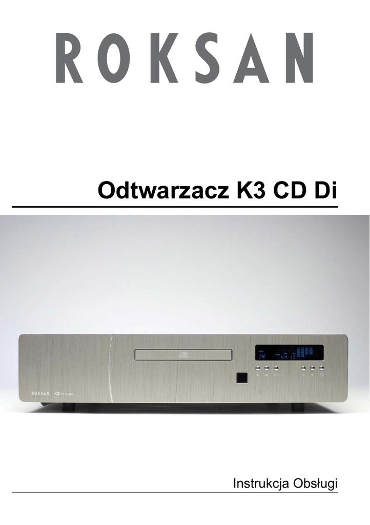 Odtwarzacz K3 CD Di Instrukcja Obsługi Spis treści Instrukcje dot. bezpieczeństwa 3 Wstęp 4 Rozpakowanie 5 Zasilanie 5 Interferencje6 Rozmieszczenie 6 Panel przedni 7 Panel tylny 8 Konfiguracja 9 Obsługa 10 Obsługacyfrowego wejścia 11 Rozwiązywanie problemów 12 2 Instrukcje dot. bezpieczeństwa WAŻNE PRZECZYTAJ DOKŁADNIE SEKCJĘ PRZED OBSŁUGĄ! UWAGA: ABY UNIKNĄĆ RYZYKA POŻARU LUB PORAŻENIA ELEKTRYCZNEGO NIE NARAŻAJ URZĄDZENIA NA DZIAŁANIE DESZCZU LUB WILGOCI. NIGDY NIE ZDEJMUJ POKRYWY (LUB TYLNEJ OBUDOWY). W ŚRODKU NIE MA CZĘŚCI WYMAGAJĄCYCH SERWISU UŻYTKOWNIKA. POZOSTAW SERWISOWANIE WYKWALIFIKOWANYM PRACOWNIKOM SERWISU. Symbol trójkąta z błyskawicą w środku ostrzega użytkownika przed możliwością wystąpienia nieizolowanych niebezpiecznych napięć wewnątrz obudowy urządzenia, które mogą powodować porażenie elektryczne człowieka. Symbol trójkąta z wykrzyknikiem w środku ostrzega użytkownika o występowaniu ważnych instrukcji obsługi i serwisowania w literaturze dołączonej do urządzenia. ŚRODKI BEZPIECZEŃSTWA I OSTROŻNOŚCI Pozostaw miejsce dookoła urządzenia w celu prawidłowej wentylacji. Unikaj instalacji: w gorących, chłodnych, nasłonecznionych miejscach, trzymaj urządzenie z daleka od źródeł ciepła. Chroń urządzenie przed: wilgocią, wodą i kurzem. Nie stawiaj ciężkich przedmiotów na obudowie. Nie zasłaniaj przewodów wentylacyjnych gazetami, obrusami, zasłonami, itp. Unikaj otwartego ognia (np. zapalonych świec, itp.) w pobliżu urządzenia. Zachowaj odpowiednie procedury utylizacji starych baterii. Nie wolno dopuścić, aby cokolwiek kapało lub zostało wylane na urządzenie. Nie stawiaj na urządzeniu pojemników z płynami (takich jak dzbanki, wazony, itp.). Nie pozwól na kontakt ze środkami owadobójczymi, takimi jak np. benzen. Nigdy nie rozkręcaj urządzenia lub modyfikuj go w dowolny sposób. Uwagi na temat przewodu i gniazda zasilającego. Dla zapewnienia maksymalnego bezpieczeństwa, oryginalny przewód zasilający musi zostać podłączony do prawidłowo uziemionego gniazda instalacji elektrycznej. Przewód zasilający musi być wykonany z trzech żył i zapewniać prawidłowe uziemienie urządzenia. Nieprawidłowe przewody zasilające są główną przyczyną uszkodzeń. Fakt, że urządzenie działa w sposób zadowalający nie świadczy o prawidłowym uziemieniu i bezpiecznej instalacji. Dla własnego bezpieczeństwa, jeżeli masz jakiekolwiek wątpliwości co do prawidłowości podłączenia i uziemienia skontaktuj się z w tej sprawie ze specjalistą w dziedzinie instalacji elektrycznych. Ogólnoeuropejskie zunifikowane napięcie zasilające. Wszystkie urządzenia dostosowane są do zasilania prądem zmiennym o napięciu 220-240V. Urządzenie jest podłączone do sieci zasilającej tak długo, jak przewód zasilający umieszczony jest w gnieździe, nawet, jeśli pewne jego funkcje są niedostępne. Aby całkowicie odłączyć urządzenie od sieci zasilającej, musisz wyjąć wtyczkę z gniazda sieciowego. Przed konfiguracją urządzenia, upewnij się, że gniazdo zasilające jest łatwo dostępne. Wyjmij przewód zasilający z gniazda, jeśli nie będziesz dłuższy czas korzystał z urządzenia. 3 Wstęp Gratulujemy zakupu odtwarzacza Roksan K3 CD Di. Został on stworzony i wyprodukowany zgodnie z najwyższymi wymaganiami dotyczącymi specyfikacji, oraz rygorystycznie przetestowany, aby zapewnić lata przyjemnych odsłuchów. Odtwarzacz K3 jest integralną częścią systemu dźwięku. Jego poprawna konfiguracja i obsługa będą miały znaczący wpływ na jakość brzmienia całości instalacji hi-fi. Prosimy zapoznać się z niniejszą instrukcją obsługi. Pomoże to w lepszym zrozumieniu za co odpowiadają poszczególne komponenty systemu hi-fi, oraz co za tym idzie zwiększenie przyjemności odsłuchów. 4 Rozpakowanie W opakowaniu odtwarzacza K3 CD Di znajdziesz: • Główne urządzenie oznaczone odpowiednią naklejką z informacją na temat wymaganego napięcia zasilania. • Pilot zdalnej kontroli Roksan R7. Po odłączeniu odtwarzacza K3 CD Di od zasilania, obudowa może być wyczyszczona miękką suchą ściereczką. Unikaj używania silnych środków czyszczących. Zasilanie Roksan K3 CD Di jest przystosowany do zasilania odpowiedniego dla danego kraju dystrybucji. Naklejkę ze stosowną informacją znajdziesz na swoim urządzeniu. Prosimy o sprawdzenie typu zasilania przed podłączeniem urządzenia. Urządzenia 230V: Urządzenia 115V: Urządzenia 100V: Zakres napięcia: 220V - 240V Zakres napięcia: 110V - 120V Zakres napięcia: 90V - 110V Kabel zasilania dostarczany z urządzeniem wyposażony jest we wtyczkę IEC, którą należy podłączyć do odpowiedniego gniazda na tylnym panelu odtwarzacza K3 CD Di. Drugi koniec podłącz do gniazda zasilania. Kabel ten nie powinien być odłączany od wejścia. Jeśli zostanie uszkodzony, zalecamy zakup odpowiednika u autoryzowanego sprzedawcy Roksan. Główne bezpieczniki odtwarzacza CD są umieszczone na jego tylnym panelu obok wejścia zasilania. Mogą zostać wymienione wyłącznie na bezpieczniki tego samego typu i z zakresu opisanego na naklejce umieszczonej na tylnym panelu urządzenia. Jeżeli urządzenie nie będzie używane przez dłuższy czas, odłącz je od gniazda zasilania. 5 Interferencje Poprawne ustawienie urządzenia powinno wyeliminować możliwość występowania zakłóceń sygnałów radiowych. Nie ma jednak gwarancji całkowitego braku takich interferencji. Jeśli się pojawią (możesz sprawdzić czy odtwarzacz jest ich przyczyną poprzez wyłączenie i włączenie go) spróbuj zastosować jedną z poniższych rad: • Zmień ustawienie anteny odbiorczej. • Zwiększ odległość między odtwarzaczem a amplitunerem (lub innym urządzeniem komunikującym się drogą radiową). • Podłącz odtwarzacz CD do innego obwodu prądu niż urządzenie radiowe. Rozmieszczenie Odtwarzacz K3 CD Di powinien być ustawiony w 