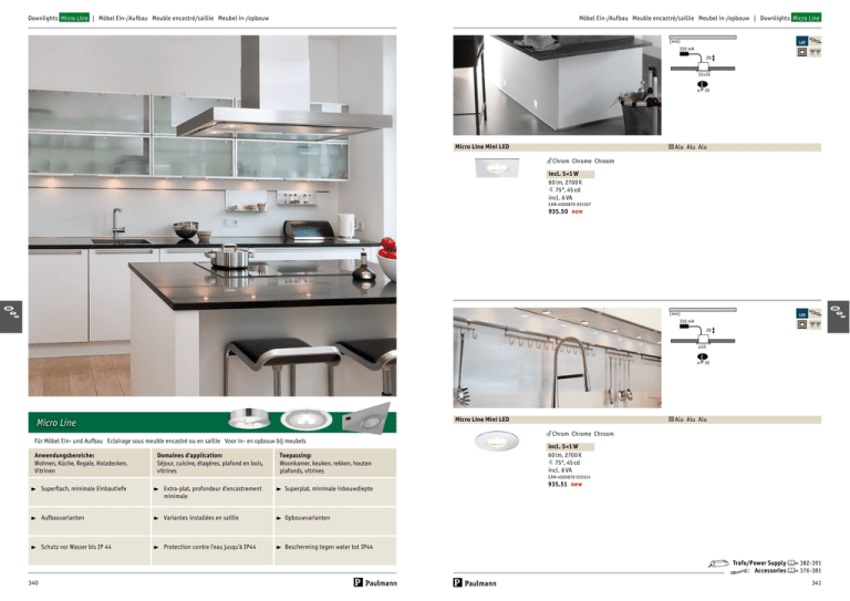 Möbel Ein-/Aufbau Meuble encastré/saillie Meubel in-/opbouw | Downlights Micro Line Downlights Micro Line | Möbel Ein-/Aufbau Meuble encastré/saillie Meubel in-/opbouw (mm) LED 350 mA 20 35×35 ⌀ 30 Micro Line Mini LED m Alu Alu Alu f Chrom Chrome Chroom incl. 5×1 W 60 lm, 2700 K 5 75°, 45 cd incl. 6 VA EAN 4000870 935507 935.50 new (mm) LED 350 mA 20 ⌀35 ⌀ 30 Micro Line Mini LED Micro Line Für Möbel Ein- und Aufbau Eclairage sous meuble encastré ou en saillie Voor in- en opbouw bij meubels Anwendungsbereiche: Wohnen, Küche, Regale, Holzdecken, Vitrinen Domaines d'application: Séjour, cuisine, étagères, plafond en bois, vitrines Toepassing: Woonkamer, keuken, rekken, houten plafonds, vitrines Superflach, minimale Einbautiefe Extra-plat, profondeur d’encastrement minimale Superplat, minimale inbouwdiepte Aufbauvarianten Variantes installées en saillie Opbouwvarianten Schutz vor Wasser bis IP 44 Protection contre l'eau jusqu'à IP44 Bescherming tegen water tot IP44 m Alu Alu Alu f Chrom Chrome Chroom incl. 5×1 W 60 lm, 2700 K 5 75°, 45 cd incl. 6 VA EAN 4000870 935514 935.51 new Trafo/Power Supply 6= 382-391 Accessories 6= 376-381 340 341
