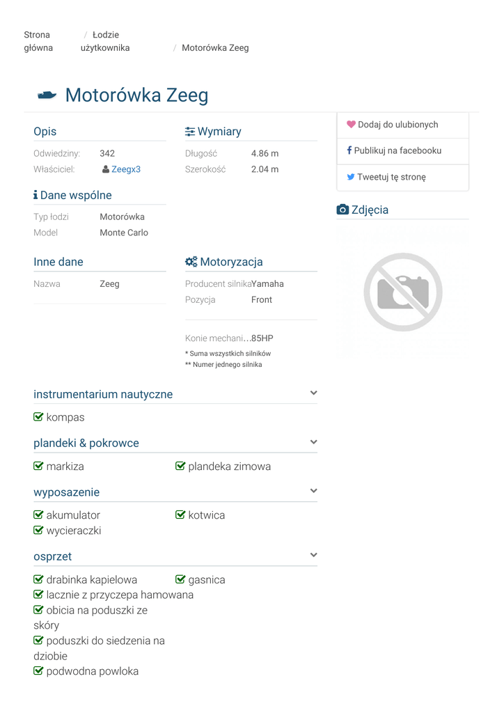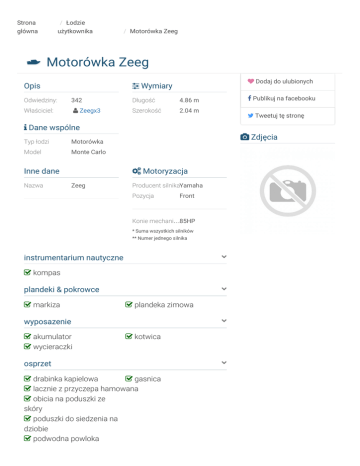Strona główna / Łodzie użytkownika / Motorówka Zeeg Motorówka Zeeg Opis Dodaj do ulubionych Wymiary Odwiedziny: 342 Długość 4.86 m Właściciel: Zeegx3 Szerokość 2.04 m Publikuj na facebooku Tweetuj tę stronę Dane wspólne Typ łodzi Motorówka Model Monte Carlo Inne dane Nazwa Zdjęcia Motoryzacja Zeeg Producent silnikaYamaha Pozycja Front Konie mechani…85HP * Suma wszystkich silników ** Numer jednego silnika instrumentarium nautyczne kompas plandeki & pokrowce markiza plandeka zimowa wyposazenie akumulator wycieraczki kotwica osprzet drabinka kapielowa gasnica lacznie z przyczepa hamowana obicia na poduszki ze skóry poduszki do siedzenia na dziobie podwodna powloka malarska pompa zenzowa mechaniczna cy Go rą cy Go rą cy rą Go Go rą cy Podobne łodzie Barbabo POLMOS… Randy Ibiscoxy Molly VEGA499 Ragnarök