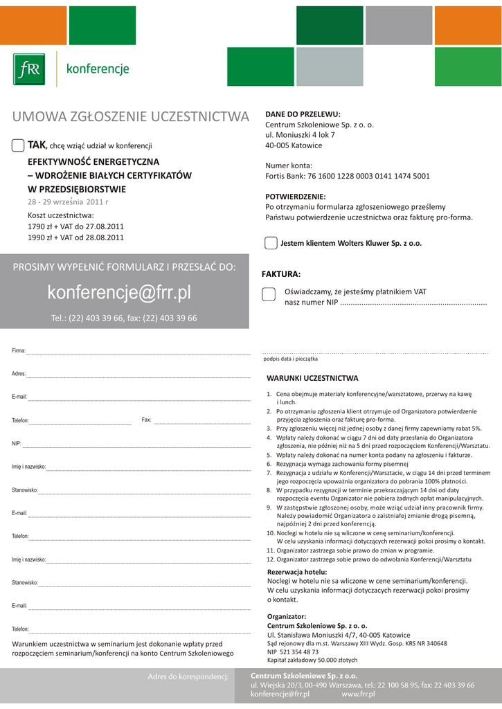 UMOWA ZG£OSZENIE UCZESTNICTWA TAK, chcê wzi¹æ udzia³ w konferencji EFEKTYWNOŒÆ ENERGETYCZNA – WDRO¯ENIE BIA£YCH CERTYFIKATÓW W PRZEDSIÊBIORSTWIE , 28 - 29 wrzesnia 2011 r Koszt uczestnictwa: 1790 z³ + VAT do 27.08.2011 1990 z³ + VAT od 28.08.2011 DANE DO PRZELEWU: Centrum Szkoleniowe Sp. z o. o. ul. Moniuszki 4 lok 7 40-005 Katowice Numer konta: Fortis Bank: 76 1600 1228 0003 0141 1474 5001 POTWIERDZENIE: Po otrzymaniu formularza zg³oszeniowego przeœlemy Pañstwu potwierdzenie uczestnictwa oraz fakturê pro-forma. Jestem klientem Wolters Kluwer Sp. z o.o. PROSIMY WYPE£NIÆ FORMULARZ I PRZES£AÆ DO: [email protected] Tel.: (22) 403 39 66, fax: (22) 403 39 66 Oœwiadczamy, ¿e jesteœmy p³atnikiem VAT nasz numer NIP ..................................................................... i upowa¿niamy Centrum Szkoleniowe Sp. z o.o. do wystawienia faktury bez naszego podpisu. Firma: podpis data i piecz¹tka Adres: WARUNKI UCZESTNICTWA E-mail: Telefon: Fax: NIP: Imiê i nazwisko: Stanowisko: E-mail: Telefon: Imiê i nazwisko: 1. Cena obejmuje materia³y konferencyjne/warsztatowe, przerwy na kawê i lunch. 2. Po otrzymaniu zg³oszenia klient otrzymuje od Organizatora potwierdzenie przyjêcia zg³oszenia oraz fakturê pro-forma. 3. Przy zg³oszeniu wiêcej ni¿ jednej osoby z danej firmy zapewniamy rabat 5%. 4. Wp³aty nale¿y dokonaæ w ci¹gu 7 dni od daty przes³ania do Organizatora zg³oszenia, nie póŸniej ni¿ na 5 dni przed rozpoczêciem Konferencji/Warsztatu. 5. Wp³aty nale¿y dokonaæ na numer konta podany na zg³oszeniu i fakturze. 6. Rezygnacja wymaga zachowania formy pisemnej 7. Rezygnacja z udzia³u w Konferencji/Warsztacie, w ci¹gu 14 dni przed terminem jego rozpoczêcia upowa¿nia organizatora do pobrania 100% p³atnoœci. 8. W przypadku rezygnacji w terminie przekraczaj¹cym 14 dni od daty rozpoczêcia eventu Organizator nie pobiera ¿adnych op³at manipulacyjnych. 9. W zastêpstwie zg³oszonej osoby, mo¿e wzi¹æ udzia³ inny pracownik firmy. Nale¿y powiadomiæ Organizatora o zaistnia³ej zmianie drog¹ pisemn¹, najpóŸniej 2 dni przed konferencj¹. 10. Noclegi w hotelu nie s¹ wliczone w cenê seminarium/konferencji. W celu uzyskania informacji dotycz¹cych rezerwacji pokoi prosimy o kontakt. 11. Organizator zastrzega sobie prawo do zmian w programie. 12. Organizator zastrzega sobie prawo do odwo³ania Konferencji/Warsztatu Rezerwacja hotelu: Noclegi w hotelu nie sa wliczone w cene seminarium/konferencji. W celu uzyskania informacji dotyczacych rezerwacji pokoi prosimy o kontakt. Stanowisko: E-mail: Organizator: Centrum Szkoleniowe Sp. z o. o. Ul. Stanis³awa Moniuszki 4/7, 40-005 Katowice Telefon: Warunkiem uczestnictwa w seminarium jest dokonanie wp³aty przed rozpoczêciem seminarium/konferencji na konto Centrum Szkoleniowego Adres do korespondencj: S¹d rejonowy dla m.st. Warszawy XIII Wydz. Gosp. KRS NR 340648 NIP 521 354 48 73 Kapita³ zak³adowy 50.000 z³otych Centrum Szkoleniowe Sp. z o.o. ul. Wiejska 20/3, 00-490 Warszawa, tel.: 22 100 58 95, fax: 22 403 39 66 [email protected] www.frr.pl
