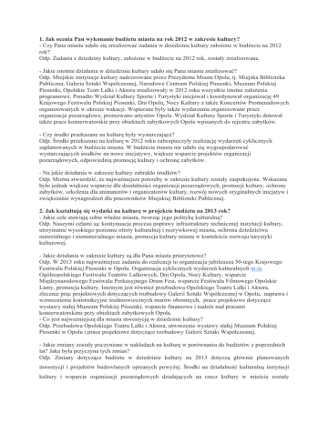 1. Jak ocenia Pan wykonanie budżetu miasta na rok 2012 w zakresie kultury? - Czy Pana miastu udało się zrealizować zadania w dziedzinie kultury założone w budżecie na 2012 rok? Odp. Zadania z dziedziny kultury, założone w budżecie na 2012 rok, zostały zrealizowane. - Jakie istotnie działania w dziedzinie kultury udało się Pana miastu zrealizować? Odp. Miejskie instytucje kultury nadzorowane przez Prezydenta Miasta Opola, tj. Miejska Biblioteka Publiczna, Galeria Sztuki Współczesnej, Narodowe Centrum Polskiej Piosenki, Muzeum Polskiej Piosenki, Opolskie Teatr Lalki i Aktora zrealizowały w 2012 roku wszystkie istotne założenia programowe. Ponadto Wydział Kultury Sportu i Turystyki inicjował i koordynował organizację 49 Krajowego Festiwalu Polskiej Piosenki, Dni Opola, Nocy Kultury a także Koncertów Promenadowych organizowanych w okresie wakacji. Wspierane były także wydarzenia organizowane przez organizacje pozarządowe, promowano artystów Opola. Wydział Kultury Sportu i Turystyki dotował także prace konserwatorskie przy obiektach zabytkowych Opola wpisanych do rejestru zabytków. - Czy środki przekazane na kulturę były wystarczające? Odp. Środki przekazane na kulturę w 2012 roku zabezpieczyły realizację wydarzeń cyklicznych zaplanowanych w budżecie miasta. W budżecie miasta nie udało się wygospodarować wystarczających środków na nowe inicjatywy, większe wsparcie projektów organizacji pozarządowych, odpowiednią promocję kultury i ochronę zabytków. - Na jakie działania w zakresie kultury zabrakło środków? Odp. Można stwierdzić, że najważniejsze potrzeby w zakresie kultury zostały zaspokojone. Wskazane było jednak większe wsparcie dla działalności organizacji pozarządowych, promocji kultury, ochrony zabytków, szkolenia dla animatorów i organizatorów kultury, rozwój nowych oryginalnych inicjatyw i zwiększenie wynagrodzeń dla pracowników Miejskiej Biblioteki Publicznej. 2. Jak kształtują się wydatki na kulturę w projekcie budżetu na 2013 rok? - Jakie cele stawiają sobie władze miasta, tworząc jego politykę kulturalną? Odp. Naszymi celami są: kontynuacja procesu poprawy infrastruktury technicznej instytucji kultury, utrzymanie wysokiego poziomu oferty kulturalnej i rozrywkowej miasta, ochrona dziedzictwa materialnego i niematerialnego miasta, promocja kultury miasta w kontekście rozwoju turystyki kulturowej. - Jakie działania w zakresie kultury są dla Pana miasta priorytetowe? Odp. W 2013 roku najważniejsze zadania do realizacji to organizacja jubileuszu 50-tego Krajowego Festiwalu Polskiej Piosenki w Opolu. Organizacja cyklicznych wydarzeń kulturalnych m.in. Ogólnopolskiego Festiwalu Teatrów Lalkowych, Dni Opola, Nocy Kultury, wsparcie Międzynarodowego Festiwalu Perkusyjnego Drum Fest, wsparcie Festiwalu Filmowego Opolskie Lamy, promocja kultury. Istotnym jest również przebudowa Opolskiego Teatru Lalki i Aktora, zlecenie prac projektowych dotyczących rozbudowy Galerii Sztuki Współczesnej w Opolu, naprawa i wzmocnienie konstrukcyjne średniowiecznych murów obronnych, prace projektowe dotyczące wystawy stałej Muzeum Polskiej Piosenki, wsparcie finansowe i nadzór nad pracami konserwatorskimi przy obiektach zabytkowych Opola. - Co jest najważniejszą dla miasta inwestycją w dziedzinie kultury? Odp. Przebudowa Opolskiego Teatru Lalki i Aktora, utworzenie wystawy stałej Muzeum Polskiej Piosenki w Opolu i prace projektowe dotyczące rozbudowy Galerii Sztuki Współczesnej. - Jakie zmiany zostały poczynione w nakładach na kulturę w porównaniu do budżetów z poprzednich lat? Jaka była przyczyna tych zmian? Odp. Zmiany dotyczące budżetu w dziedzinie kultury na 2013 dotyczą głównie planowanych inwestycji i projektów budowlanych opisanych powyżej. Środki na działalność kulturalną instytucji kultury i wsparcie organizacji pozarządowych działających na rzecz kultury w mieście zostały utrzymane na poziomie ubiegłego roku. Zwiększono natomiast środki na organizację jubileuszowego Krajowego Festiwalu Polskiej Piosenki i imprez towarzyszących. Dorota Michniewicz-Witkowska Naczelnik Wydziału Kultury Sportu i Turystyki Urzędu Miejskiego w Opolu