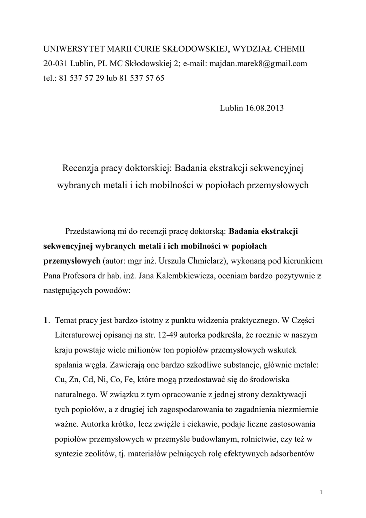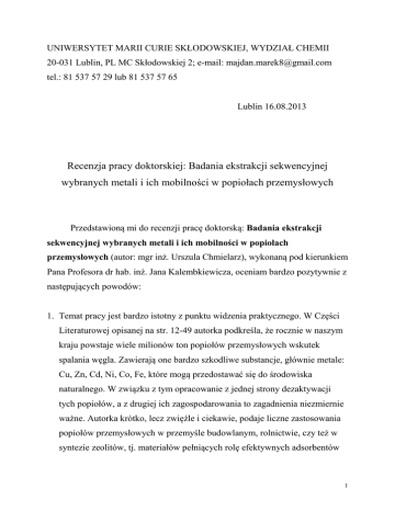 UNIWERSYTET MARII CURIE SKŁODOWSKIEJ, WYDZIAŁ CHEMII 20-031 Lublin, PL MC Skłodowskiej 2; e-mail: [email protected] tel.: 81 537 57 29 lub 81 537 57 65 Lublin 16.08.2013 Recenzja pracy doktorskiej: Badania ekstrakcji sekwencyjnej wybranych metali i ich mobilności w popiołach przemysłowych Przedstawioną mi do recenzji pracę doktorską: Badania ekstrakcji sekwencyjnej wybranych metali i ich mobilności w popiołach przemysłowych (autor: mgr inż. Urszula Chmielarz), wykonaną pod kierunkiem Pana Profesora dr hab. inż. Jana Kalembkiewicza, oceniam bardzo pozytywnie z następujących powodów: 1. Temat pracy jest bardzo istotny z punktu widzenia praktycznego. W Części Literaturowej opisanej na str. 12-49 autorka podkreśla, że rocznie w naszym kraju powstaje wiele milionów ton popiołów przemysłowych wskutek spalania węgla. Zawierają one bardzo szkodliwe substancje, głównie metale: Cu, Zn, Cd, Ni, Co, Fe, które mogą przedostawać się do środowiska naturalnego. W związku z tym opracowanie z jednej strony dezaktywacji tych popiołów, a z drugiej ich zagospodarowania to zagadnienia niezmiernie ważne. Autorka krótko, lecz zwięźle i ciekawie, podaje liczne zastosowania popiołów przemysłowych w przemyśle budowlanym, rolnictwie, czy też w syntezie zeolitów, tj. materiałów pełniących rolę efektywnych adsorbentów 1 w oczyszczaniu ścieków lub też służących jako katalizatory procesie przerobu ropy naftowej, w tzw. krakingu. 2. Cel badań (str. 10-11) został opisany bardzo precyzyjnie i składają się nań takie elementy jak: ocena właściwości fizycznych i fizykochemicznych popiołów, ocena składu popiołów, ekstrakcja sekwencyjna, specjacja chemiczna chromu, dezaktywacja chemiczna popiołów metodą ekstrakcji sekwencyjnej. 3. Metodyka Badań (str. 58-68) została zaplanowana w sposób logiczny i konsekwentny z następującymi punktami do realizacji w ramach charakterystyki parametrów fizycznych i fizykochemicznych: oznaczanie wilgotności próbek, odczynu popiołów, straty podczas prażenia, gęstości nasypowej, aktywności pucolanowej, składu granulometrycznego, rozpuszczalności popiołów w roztworach wodnych., rozpuszczalności i roztwarzania popiołów. Pozostałe punkty do realizacji to: analiza specjacyjna chlorków i oznaczanie krzemionki, oznaczanie zawartości całkowitej i „zbliżonej do ogólnej” metali, ekstrakcja sekwencyjna, oznaczanie metali w eluatach poekstrakcyjnych, analiza specjacyjna chromu, oznaczenia Cr(VI) w roztworach, dezaktywacja chemiczna popiołów. 4. Wyniki badań (str. 70-142) przedstawione w tabelach: 14-41 i na rysunkach: 12-45 świadczą o dużej staranności, sumienności i benedyktyńskiej wręcz pracowitości autorki. Wszystkie wyniki są dopracowane statystycznie z podaniem przedziałów ufności mierzonych wielkości. Rysunki są czytelne i opatrzone bardzo dokładnymi legendami. Taki sposób przedstawienia wyników należy uznać za wzorowy! Autorka wykonała bardzo dużą ilość pomiarów różnych wielkości, a o tym niech świadczą tytuły podrozdziałów, które wymieniam w kolejności: Własności Fizyczne i Fizykochemiczne Popiołów (Skład granulometryczny, Wilgotność, Odczyn, Straty prażenia, Gęstość nasypowa, Aktywność pucolanowa, Rozpuszczalnośc w roztworach 2 wodnych, Rozpuszczalność i roztwarzalność), Skład Chemiczny Popiołów (zawartość chlorków i krzemionki, zawartość całkowita i „zbliżona do ogólnej metali” ), Ekstrakcja Sekwencyjna i Frakcje Metali ( Frakcje chemiczne metali, Frakcje mobilne metali, Ekstrakcja sekwencyjna i specjacja chemiczna Cr), Dezaktywacja Chemiczna Popiołów Metodą Ekstrakcji Sekwencyjnej (Wpływ dezaktywacji na specjację funkcjonalną i mobilność metali w popiołach, Wpływ dezaktywowanego popiołu na właściwości fizykochemiczne gleby powierzchniowej, Wpływ dezaktywowanego popiołu na specjację funkcjonalną i mobilność metali w glebie powierzchniowej). 5. Wnioski końcowe (str.180-182) ujęto w siedmiu punktach i są one bardzo istotne zarówno z punktu widzenia chemii i fizykochemii popiołów, jak i potencjalnych ich zastosowań. Autorka opracowała oryginalną metodę izolacji Cr(VI) z frakcji tlenkowej popiołów i jego analizy (układ woda (10% obj.)-metanol(90% obj.), ekstrahent 0.04 M. NH2OH-HCl w 25% CH3COOH, T=25 C, czas procesu 40-100 min., pH samorzutnie ustalające się). Autorka podaje, że wyznaczyła parametr dezaktywacji popiołu (d) uwzględniający mobilność poszczególnych frakcji metali w popiele w stosunku do jego rozpuszczalności masowej, jako narzędzie do progozowania procesu dezaktywacji popiołu. Dezaktywacja popiołu niezależnie od jego rodzaju pozwala na efektywną eliminację metali z popiołów (d>1) zawartych w frakcji F1: Na, K, Mg, Ca, Fe, Co; w frakcji F2: Na, Pb; w frakcji F3: Mn; oraz w frakcji F5:Cr. 6. Autorka interpretuje swoje dane eksperymentalne w oparciu o nowe pozycje literaturowe, większość z nich jest z okresu po 2000 r. , co świadczy o tym że tematyka pracy doktorskiej mieści się w nurcie współczesnych zagadnień z zakresu chemii odpadów przemysłowych i ich dezaktywacji. 3 7. Autorka ma na swoim koncie 6 publikacji i 8 doniesień konferencyjnych (7 konferencji krajowych, 1 zagraniczna), których tematyka jest związana z przedstawioną do oceny pracą doktorską. 8. Pani mgr. inż. Urszula Chmielarz dwukrotnie podczas studiów doktoranckich otrzymywała stypendia ze środków Unii Europejskiej, które wspierały Jej badania. Pod adresem pracy doktorskiej mam kilka uwag krytycznych, które wymieniam w kolejności: Gdy mowa o oznaczaniu chromu, należało wspomnieć o metodach analitycznego odróżniania Cr(VI) od Cr(III) (metody spektrofotometryczne). Poza tym na str. 108 autorka podaje prawdopodobne reakcje chemiczne pomiędzy jonami Cr2O72- a hydroksyloaminą. Wydaje mi się, że nie jest to obraz kompletny. Należało wziąć również pod uwagę jony H