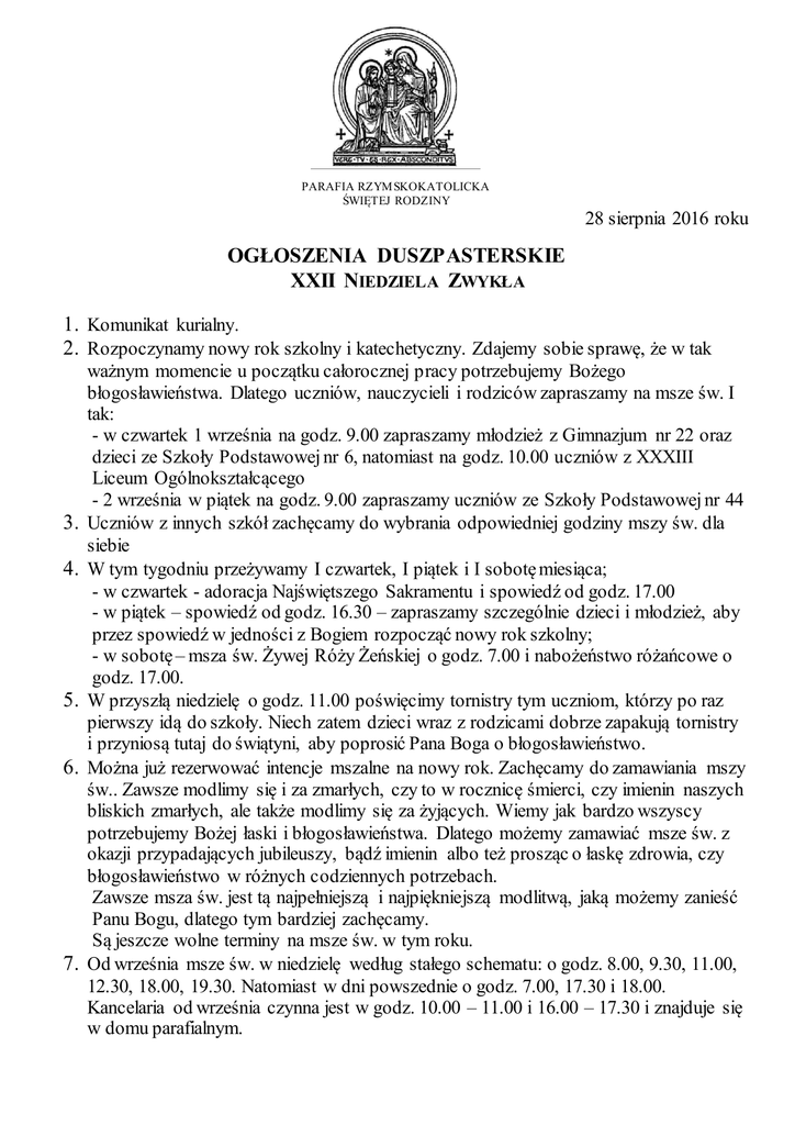 PARAFIA RZYM SKOKATOLICKA ŚWIĘTEJ RODZINY 28 sierpnia 2016 roku OGŁOSZENIA DUSZPASTERSKIE XXII NIEDZIELA ZWYKŁA 1. Komunikat kurialny. 2. Rozpoczynamy nowy rok szkolny i katechetyczny. Zdajemy sobie sprawę, że w tak 3. 4. 5. 6. 7. ważnym momencie u początku całorocznej pracy potrzebujemy Bożego błogosławieństwa. Dlatego uczniów, nauczycieli i rodziców zapraszamy na msze św. I tak: - w czwartek 1 września na godz. 9.00 zapraszamy młodzież z Gimnazjum nr 22 oraz dzieci ze Szkoły Podstawowej nr 6, natomiast na godz. 10.00 uczniów z XXXIII Liceum Ogólnokształcącego - 2 września w piątek na godz. 9.00 zapraszamy uczniów ze Szkoły Podstawowej nr 44 Uczniów z innych szkół zachęcamy do wybrania odpowiedniej godziny mszy św. dla siebie W tym tygodniu przeżywamy I czwartek, I piątek i I sobotę miesiąca; - w czwartek - adoracja Najświętszego Sakramentu i spowiedź od godz. 17.00 - w piątek – spowiedź od godz. 16.30 – zapraszamy szczególnie dzieci i młodzież, aby przez spowiedź w jedności z Bogiem rozpocząć nowy rok szkolny; - w sobotę – msza św. Żywej Róży Żeńskiej o godz. 7.00 i nabożeństwo różańcowe o godz. 17.00. W przyszłą niedzielę o godz. 11.00 poświęcimy tornistry tym uczniom, którzy po raz pierwszy idą do szkoły. Niech zatem dzieci wraz z rodzicami dobrze zapakują tornistry i przyniosą tutaj do świątyni, aby poprosić Pana Boga o błogosławieństwo. Można już rezerwować intencje mszalne na nowy rok. Zachęcamy do zamawiania mszy św.. Zawsze modlimy się i za zmarłych, czy to w rocznicę śmierci, czy imienin naszych bliskich zmarłych, ale także modlimy się za żyjących. Wiemy jak bardzo wszyscy potrzebujemy Bożej łaski i błogosławieństwa. Dlatego możemy zamawiać msze św. z okazji przypadających jubileuszy, bądź imienin albo też prosząc o łaskę zdrowia, czy błogosławieństwo w różnych codziennych potrzebach. Zawsze msza św. jest tą najpełniejszą i najpiękniejszą modlitwą, jaką możemy zanieść Panu Bogu, dlatego tym bardziej zachęcamy. Są jeszcze wolne terminy na msze św. w tym roku. Od września msze św. w niedzielę według stałego schematu: o godz. 8.00, 9.30, 11.00, 12.30, 18.00, 19.30. Natomiast w dni powszednie o godz. 7.00, 17.30 i 18.00. Kancelaria od września czynna jest w godz. 10.00 – 11.00 i 16.00 – 17.30 i znajduje się w domu parafialnym. 8. Z naszej parafii organizowana jest pielgrzymka na Cypr – śladami św. Pawła w dniach 3 – 10 października 2016 r. Więcej informacji w kancelarii lub zakrystii. 9. Przypominamy o akcji parafialnej Caritas, która chce w miarę możliwości pomóc dzieciom z mniej zamożnych rodzin starając się zaopatrzyć je w przybory szkolne. Jeśli ktoś chciałby włączyć się w tę akcję, to prosimy o podarowanie przyborów szkolnych, zeszytów, i innych potrzebnych uczniom artykułów, które będziemy później mogli potrzebującym przekazać. Te przybory można przynosić do zakrystii lub kancelarii, a także składać do pudełka przed obrazem Jezusa Miłosiernego. 10. 25 września chcemy w naszej parafii zorganizować piknik podczas którego będzie można oddać honorowo krew. Ponieważ musimy zgłosić prawdopodobną liczbę uczestników dlatego zapraszamy już dzisiaj osoby, które chciałby oddać krew, aby zapisywały się na listę deklarując swoja gotowość oddania krwi. 11. Prace budowlane trwają. Są to prace skomplikowane dlatego trwają dłużej, ale posuwają się naprzód. Modlimy się o błogosławieństwo przy budowie. 12. W trosce o bezpieczeństwo mieszkańców naszej dzielnicy planowane jest uruchomienie przez policję narzędzia informatycznego pod nazwą „Krajowa Mapa Zagrożeń bezpieczeństwa”. Będzie to narzędzie tworzone razem z mieszkańcami. Na tablicy ogłoszeń znajdziemy więcej informacji, a także adres strony internetowej. 13. Jest dostępna prasa katolicka: - „Idziemy” – art. „Drogowskaz papieża Franciszka”; - „Gość Niedzielny”: art. „Kazanie o piekle”; - „Niedziela” – art. „Krzyk ciszy”. Zapraszamy do parafialnego kiosku. 11. Wszystkim, życzymy dobrej niedzieli, błogosławionego tygodnia. Niech Dobry Bóg wszystkim błogosławi. 12. Módlmy się za zmarłych parafian: Wieczny odpoczynek racz im dać Panie... i za naszą Ojczyznę.