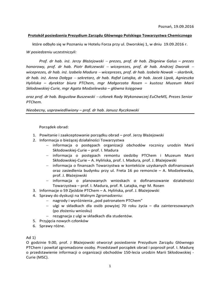 Poznań, 19.09.2016 Protokół posiedzenia Prezydium Zarządu Głównego Polskiego Towarzystwa Chemicznego które odbyło się w Poznaniu w Hotelu Forza przy ul. Dworskiej 1, w dniu 19.09.2016 r. W posiedzeniu uczestniczyli: Prof. dr hab. inż. Jerzy Błażejowski − prezes, prof. dr hab. Zbigniew Galus – prezes honorowy, prof. dr hab. Piotr Bałczewski − wiceprezes, prof. dr hab. Andrzej Dworak − wiceprezes, dr hab. inż. Izabela Madura − wiceprezes, prof. dr hab. Izabela Nowak − skarbnik, dr hab. inż. Anna Dołęga − sekretarz, dr hab. Rafał Latajka, dr hab. Jacek Lipok, Agnieszka Hylińska – dyrektor biura PTChem, mgr Małgorzata Rosen – kustosz Muzeum Marii Skłodowskiej-Curie, mgr Agata Modzelewska – główna księgowa oraz prof. dr hab. Bogusław Buszewski − członek Rady Wykonawczej EuCheMS, Prezes Senior PTChem. Nieobecny, usprawiedliwiony – prof. dr hab. Janusz Ryczkowski Porządek obrad: 1. Powitanie i zaakceptowanie porządku obrad – prof. Jerzy Błażejowski 2. Informacja o bieżącej działalności Towarzystwa − informacja o postępach organizacji obchodów rocznicy urodzin Marii Skłodowskiej-Curie – prof. I. Madura − informacja o postępach remontu siedziby PTChem i Muzeum Marii Skłodowskiej-Curie – A. Hylińska, prof. I. Madura, prof. J. Błażejowski − informacja o finansach Towarzystwa w kontekście uzyskanych dofinansowań oraz zasiedlenia budynku przy ul. Freta 16 po remoncie – A. Modzelewska, prof. J. Błażejowski − informacja o planowanych wnioskach o dofinansowanie działalności Towarzystwa – prof. I. Madura, prof. R. Latajka, mgr M. Rosen 3. Informacje o 59 Zjeździe PTChem – A. Hylińska, prof. J. Błażejowski 4. Sprawy do dyskusji na Walnym Zgromadzeniu: − nagrody i wyróżnienia „pod patronatem PTChem” − ulgi w składkach dla osób powyżej 70 roku życia – dla zainteresowanych (po złożeniu wniosku) − rezygnacja z ulgi w składkach dla studentów. 5. Przyjęcia nowych członków 6. Sprawy różne. Ad 1) O godzinie 9.00, prof. J Błażejowski otworzył posiedzenie Prezydium Zarządu Głównego PTChem i powitał zgromadzone osoby. Przedstawił porządek obrad i poprosił prof. I. Madurę o przedstawienie informacji o organizacji obchodów 150-lecia urodzin Marii Skłodowskiej Curie (MSC). 1 Ad 2) Prof. I. Madura przedstawiła przebieg spotkania z przedstawicielami władz miasta stołecznego Warszawy. Ze strony PTChem w spotkaniu udział wzięli: prof. Z. Galus, prof. I. Madura, mgr M. Rosen, zaś miasto Warszawę reprezentowali Wiceprezydent Miasta, Wicedyrektor Biura Turystyki oraz Doradca Prezydenta. Omawiano następujące, zarysowane poniżej sprawy: − Wysokość opłaty czynszowej; ze strony władz miasta nie ma możliwości obniżenia czynszu, istnieje jedynie możliwość odroczenia naliczania opłaty czynszowej od momentu uruchomienia Muzeum. − Przedstawiciele Władz Miejskich proponowali założenie Stowarzyszenia Przyjaciół Muzeum i pozyskiwanie w ten sposób środków na jego utrzymanie. Sugerowano uruchomienie Laboratorium Chemicznego w Muzeum i nawiązanie współpracy z Centrum Nauki Kopernik, które ma duże możliwości pozyskiwania grantów. − Miasto weźmie udział w organizacji obchodów 150-lecia urodzin MSC. W związku z organizacją obchodów przedstawiciele władz miejskich poinformowali o możliwości składania wniosków o dofinansowanie działań upowszechniających naukę przez uczelnie. Informacja o konkursach zostanie podana w październiku. Przedstawiciele Prezydenta Miasta sugerowali, iż organizacja obchodów jest jednym ze sposobów pozyskania środków finansowych na wyposażenie wystawy w Muzeum MSC. Prezydent poprosił o utworzenie Komitetu Organizacji Obchodów w celu prowadzenia dalszych działań. Prof. I. Madura poinformowała o swojej wizycie w Polish Cultural Institute w Nowym Jorku, USA. Jest to jednostka podległa MSZ. Instytucja ta może opłacić przyjazd amerykańskiego naukowca na obchody 150-lecia MSC oraz przyjazd reprezentanta Polski do USA. W październiku 2017 odbędzie się w Bostonie lub Waszyngtonie Europejski Festiwal Nauki i Polska może prezentować podczas tego wydarzenia informacje dotyczące 150 rocznicy urodzin MSC. Instytut opłaci przyjazd dwóch osób z Muzeum MSC, które mogłyby organizować odpowiednie zajęcia i prezentacje. Prof. I. Madura przeprowadziła rozmowy z Attaché Ambasady Amerykańskiej, który zainteresował się pomysłem zorganizowania wystawy pod hasłem „Maria i świat” w związku z obchodami 150 rocznicy urodzin MSC w Warszawie. Zadeklarował finansowanie wystawy. Prof. I. Madura zaproponowała, iż może zająć się koordynacją obchodów w Warszawie oraz zasugerowała przeprowadzenie imprez pod hasłem MSC w Oddziałach PTChem. Następnie prof. I. Madura poinformowała o rozmowach z Rektorami trzech warszawskich uczelni, dotyczących głównej imprezy obchodów czyli trzydniowej konferencji, która ma się odbyć w Warszawie pod hasłem „Medicine Science Culture”. Uzyskała wstępne deklaracje Rektorów dotyczące pokrycia części kosztów Konferencji. Prof. R. Latajka poinformował o pokazach multimedialnych dotyczących MSC organizowanych przy okazji 60 Zjazdu PTChem we Wrocławiu. Prawdopodobnie możliwe jest pozyskanie sponsora, który wsparłby zorganizowanie takich pokazów w innych miastach Polski. Prof. Z. Galus spotkał się z prof. P. Rowińskim, wiceprezesem PAN oraz z Dyrektor Biura Promocji, którzy zadeklarowali wsparcie - również finansowe. 2 Prof. I. Madura wspomniała o pomyśle zorganizowania Parady Rowerów Miejskich. Mgr M. Rosen zapytała czy został ustalony Komitet Honorowy oraz Komitet Organizacyjny Obchodów ponieważ o te informacje proszą współpracujące instytucje i prasa. Prof. J. Błażejowski wyraził pogląd, że plany obchodów powinny być ograniczone do imprez dla których można uzyskać finansowanie. Prof. A. Dworak stwierdził, iż zaprezentowany program