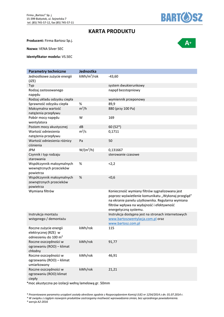 Firma „Bartosz” Sp. j 15-399 Białystok, ul. Sejneńska 7 tel. (85) 745-57-12, fax (85) 745-57-11 KARTA PRODUKTU Producent: Firma Bartosz Sp.j. Nazwa: VENA Silver 5EC Identyfikator modelu: VS.5EC Parametry techniczne Jednostka Jednostkowe zużycie energii (JZE) Typ Rodzaj zastosowanego napędu Rodzaj układu odzysku ciepła Sprawność odzysku ciepła Maksymalna wartość natężenia przepływu Pobór mocy napędu wentylatora Poziom mocy akustycznej Wartość odniesienia natężenia przepływu Wartość odniesienia różnicy ciśnienia JPM Czynnik i typ rodzaju starowania Współczynnik maksymalnych wewnętrznych przecieków powietrza Współczynnik maksymalnych zewnętrznych przecieków powietrza Wymiana filtrów kWh/m2/rok Instrukcja montażu wstępnego / demontażu -43,60 system dwukierunkowy napęd bezstopniowy % m3/h wymiennik przeponowy 89,9 880 (przy 100 Pa) W 169 dB m3/s 60 (52*) 0,1711 Pa 50 W/(m3/h) 0,131667 sterowanie czasowe % ˂2,2 % ˂0,6 Konieczność wymiany filtrów sygnalizowana jest poprzez wyświetlenie komunikatu „Wykonaj przegląd” na ekranie panelu użytkownika. Regularna wymiana filtrów wpływa na wydajność i efektywność energetyczną systemu. Instrukcja dostępna jest na stronach internetowych www.bartoszwentylacja.com.pl oraz www.bartosz.com.pl 115 Roczne zużycie energii kWh/rok elektrycznej (RZE) w odniesieniu do 100 m2 Roczne oszczędności w kWh/rok 91,77 ogrzewaniu (ROO) – klimat chłodny Roczne oszczędności w kWh/rok 46,91 ogrzewaniu (ROO) – klimat umiarkowany Roczne oszczędności w kWh/rok 21,21 ogrzewaniu (ROO) klimat ciepły *moc akustyczna po izolacji wełną lamelową gr. 50mm * Prezentowane parametry urządzeń zostały określone zgodnie z Rozporządzeniem Komisji (UE) nr 1254/2014 z dn. 01.07.2014 r. * W związku z ciągłym rozwojem produktów zastrzegamy możliwość wprowadzania zmian, bez uprzedniego powiadomienia. * wersja A2-2016 Firma „Bartosz” Sp. j 15-399 Białystok, ul. Sejneńska 7 tel. (85) 745-57-12, fax (85) 745-57-11 * Prezentowane parametry urządzeń zostały określone zgodnie z Rozporządzeniem Komisji (UE) nr 1254/2014 z dn. 01.07.2014 r. * W związku z ciągłym rozwojem produktów zastrzegamy możliwość wprowadzania zmian, bez uprzedniego powiadomienia. * wersja A2-2016