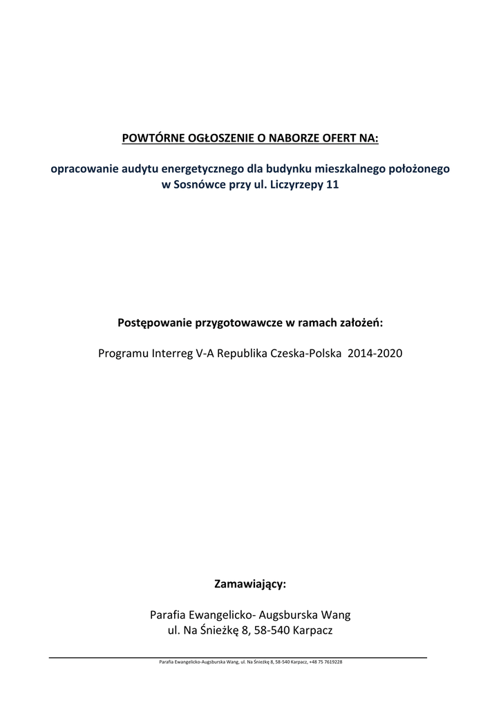 POWTÓRNE OGŁOSZENIE O NABORZE OFERT NA: opracowanie audytu energetycznego dla budynku mieszkalnego położonego w Sosnówce przy ul. Liczyrzepy 11 Postępowanie przygotowawcze w ramach założeń: Programu Interreg V-A Republika Czeska-Polska 2014-2020 Zamawiający: Parafia Ewangelicko- Augsburska Wang ul. Na Śnieżkę 8, 58-540 Karpacz Parafia Ewangelicko-Augsburska Wang, ul. Na Śnieżkę 8, 58-540 Karpacz, +48 75 7619228 CZĘŚĆ I Informacje ogólne 1. Zamawiający Parafia Ewangelicko-Augsburska WANG ul. Na Śnieżkę 8, 58-540 Karpacz tel. Fax: +48 75 76 19 228 +48 75 75 28 293 Osobą upoważnioną do kontaktów z oferentami jest ks. Edwin Pech – Proboszcz Parafii 2. Opis przedmiotu zamówienia: Przedmiotem zamówienia jest opracowanie: audytu energetycznego dla budynku mieszkalnego położonego w Sosnówce przy ul. Liczyrzepy 11 dla prac, które będą prowadzone przez Zamawiającego w ramach realizacji zadania głównego pn. „Ekumenia w praktyce” Termin wykonania zadania: 31.01.2016 r. 3. Warunki dopuszczające W postępowaniu mogą wziąć udział (złożyć ofertę) oferenci nie wykluczeni na podstawie art. 24 ustawy Prawo zamówień publicznych oraz spełniający warunki zawarte w art. 22 ust. 1 tejże ustawy. Potwierdzeniem spełnienia tych warunków jest złożenie pisemnego oświadczenia stanowiącego załącznik do Formularza ofertowego oraz spełnienie następujących warunków: 3.1. Posiadanie aktualnych i obowiązujących uprawnień do wykonywania określonej działalności lub czynności, jeżeli ustawy nakładają obowiązek posiadania takich uprawnień; 3.2. Posiadanie niezbędnej wiedzy i doświadczenia do wykonania zamówienia; 3.3. Znajdowanie się w sytuacji ekonomicznej i finansowej zapewniającej wykonanie zamówienia; 3.4. Przeprowadzenie wizji z udziałem Zamawiającego, podczas której Wykonawca zapozna się z zakresem oraz charakterem prac oraz pobierze dodatkowe materiały niezbędne do przygotowania oferty. Dodatkowe wymogi w sprawie oświadczeń i dokumentów, jakie mają dostarczyć wykonawcy w celu potwierdzenia spełniania warunków udziału w postępowaniu: Oświadczenie, że Wykonawca spełnia warunki udziału w postępowaniu, określone w art. 22 ust. 1 ustawy; (załącznik) Zamawiający przy wyborze oferty będzie się kierował regułą: spełnia albo nie spełnia, analizując treść złożonej oferty, w szczególności uwzględniając m.in. zgodność załączonych do oferty dokumentów. Nie spełnienie chociażby jednego z wyżej wymienionych warunków skutkować będzie wykluczeniem Wykonawcy z postępowania. 4. Kryteria oceny złożonych ofert: Cena oraz dodatkowe kryteria i ich znaczenie. Oferty będą oceniane na podstawie następujących kryteriów: 100 % - cena ryczałtowa. Parafia Ewangelicko-Augsburska Wang, ul. Na Śnieżkę 8, 58-540 Karpacz, +48 75 7619228 CZĘŚĆ II Informacje dotyczące składania ofert 1. Postać oferty Sporządzona oferta musi spełniać następujące warunki: 1.1. musi być napisana w języku polskim pismem maszynowym lub technicznym drukowanym niezmywalnym atramentem, 1.2. wszystkie podpisy muszą być czytelne lub opisane pieczątkami imiennymi, złożone przez osobę lub osoby uprawnione do występowania w obrocie prawnym w imieniu wykonawcy, bądź przez upoważnionego przedstawiciela wykonawcy (w tym przypadku upoważnienie do podpisania dokumentów musi być dołączone do oferty), 1.3. wszystkie dokumenty, składające się na ofertę, muszą być przedstawione w formie oryginałów lub kserokopii poświadczonych „Za zgodność z oryginałem” przez upoważnionego przedstawiciela wykonawcy, 1.4. musi zawierać kopie dokumentów potwierdzających uprawnienia do sporządzania audytu energetycznego, 1.5. oferta pod rygorem jej odrzucenia i wykluczenia wykonawcy z postępowania musi zawierać następujące dokumenty: zaświadczenie REGON i NIP, wypis z rejestru firm. 2. Termin i miejsce składania ofert Oferty należy dostarczyć do siedziby Parafii Ewangelicko-Augsburskiej WANG w Karpaczu. Oferty wniesione po terminie nie będą rozpatrywane. Dla ofert przesłanych pocztą, przesyłką kurierską, faksem lub mailem liczy się data i godzina ich fizycznego dostarczenia do siedziby Parafii Ewangelicko-Augsburskiej Wang w Karpaczu. Oferty należy dostarczyć do 11.12.2015 r. godzina 1200 do kancelarii Parafii Ewangelicko-Augsburskiej WANG w Karpaczu przy ul. Na Śnieżkę 8, 58-540 Karpacz lub na fax nr: +48 75 75 28 293 lub na adres e-mail [email protected] Oferty mailowe należy potwierdzić w formie papierowej wysłanej na adres Zamawiającego w dniu wysłania e-maila z ofertą. 3. Wybór oferenta Zamawiający wystawi zlecenie Wykonawcy, który przedłoży ofertę najkorzystniejszą z punktu widzenia kryteriów przyjętych w niniejszym postępowaniu, 4. Informacje dotyczące umowy Termin związania ofertą – 30 dni. 5. OGŁOSZENIE wyników 5.1. OGŁOSZENIE o wyborze oferty zostanie zamieszczone na tablicy ogłoszeń w siedzibie Zamawiającego. Niezależnie od tego, wszyscy wykonawcy zostaną niezwłocznie powiadomieni drogą elektroniczną o wyborze oferty. Zawiadomienie będzie zawierać nazwę i siedzibę wykonawcy, którego ofertę wybrano oraz cenę realizacji zamówienia. 5.2. Zamawiający informuje, iż zgodnie z art. 96 ust 3 ustawy Prawo zamówień publicznych oferty składane w postępowaniu o zamówienie publiczne są jawne i podlegają udostępnieniu od chwili ich otwarcia, z wyjątkiem informacji stanowiących tajemnicę przedsiębiorstwa w rozumieniu przepisów o zwalczaniu nieuczciwej konkurencji, jeśli Wykonawca, nie później niż w terminie składania ofert, zastrzeże, że nie mogą one być udostępniane. 5.3. Udostępnieniu podlega protokół Komisji Przetargowej wraz z załącznikami. Załączniki do protokołu mogą być udostępnione po dokonaniu przez Zamawiającego wyboru najkorzystniejszej oferty lub unieważnieniu postępowania. 5.4. Udostępnienie protokołu oraz z