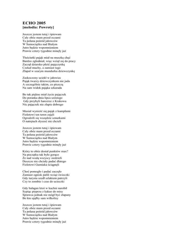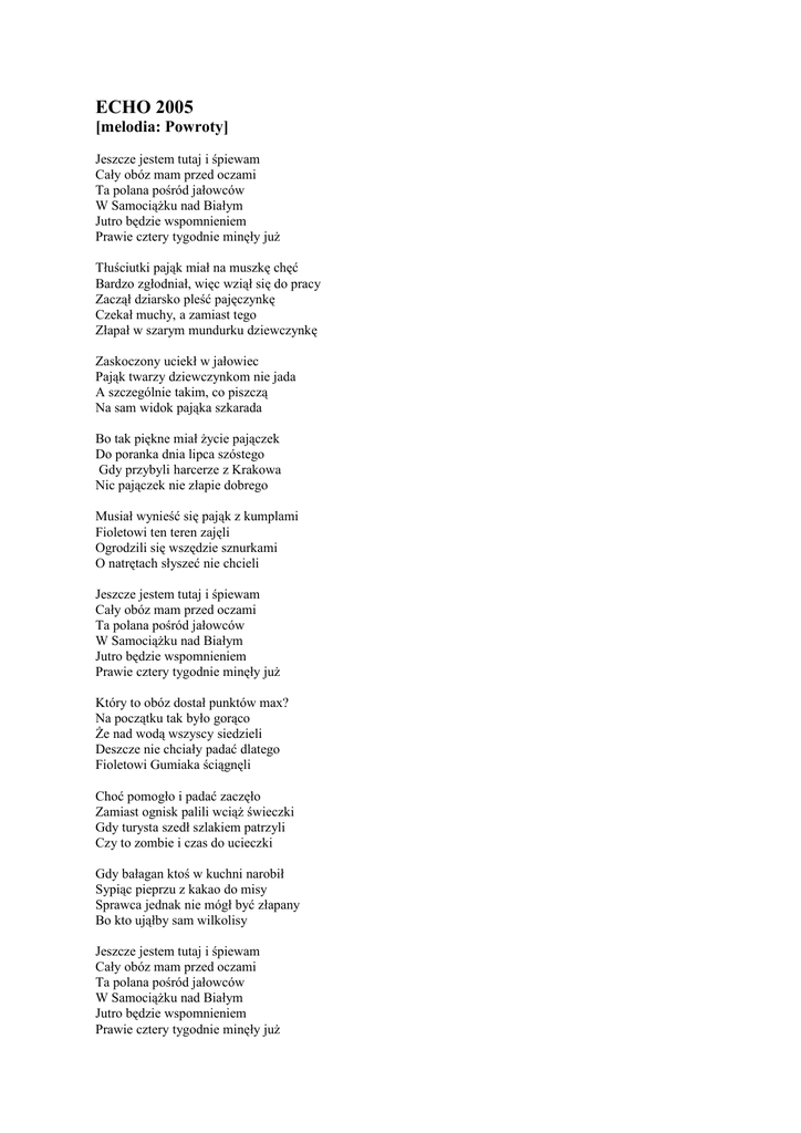 ECHO 2005 [melodia: Powroty] Jeszcze jestem tutaj i śpiewam Cały obóz mam przed oczami Ta polana pośród jałowców W Samociążku nad Białym Jutro będzie wspomnieniem Prawie cztery tygodnie minęły już Tłuściutki pająk miał na muszkę chęć Bardzo zgłodniał, więc wziął się do pracy Zaczął dziarsko pleść pajęczynkę Czekał muchy, a zamiast tego Złapał w szarym mundurku dziewczynkę Zaskoczony uciekł w jałowiec Pająk twarzy dziewczynkom nie jada A szczególnie takim, co piszczą Na sam widok pająka szkarada Bo tak piękne miał życie pajączek Do poranka dnia lipca szóstego Gdy przybyli harcerze z Krakowa Nic pajączek nie złapie dobrego Musiał wynieść się pająk z kumplami Fioletowi ten teren zajęli Ogrodzili się wszędzie sznurkami O natrętach słyszeć nie chcieli Jeszcze jestem tutaj i śpiewam Cały obóz mam przed oczami Ta polana pośród jałowców W Samociążku nad Białym Jutro będzie wspomnieniem Prawie cztery tygodnie minęły już Który to obóz dostał punktów max? Na początku tak było gorąco Że nad wodą wszyscy siedzieli Deszcze nie chciały padać dlatego Fioletowi Gumiaka ściągnęli Choć pomogło i padać zaczęło Zamiast ognisk palili wciąż świeczki Gdy turysta szedł szlakiem patrzyli Czy to zombie i czas do ucieczki Gdy bałagan ktoś w kuchni narobił Sypiąc pieprzu z kakao do misy Sprawca jednak nie mógł być złapany Bo kto ująłby sam wilkolisy Jeszcze jestem tutaj i śpiewam Cały obóz mam przed oczami Ta polana pośród jałowców W Samociążku nad Białym Jutro będzie wspomnieniem Prawie cztery tygodnie minęły już Kto dla odmiany komendantem jest? Czwarty roczek ma już na karku Trochę dręczy go to nocami Szuka żony tak jak następcy A zawiasy przeplata fazami Sam w komendzie w tym roku zasiada Chociaż kobiet ma sporo dookoła Zszedł na ziemię, gdyż nikt nie chciał pomóc Jemu tutaj pobujać w obłokach Najpierw Aga a potem Elunia Kasia baran i tak obóz cały Wniosek z tego tu sam się nasuwa Z komendanta jest flirciarz niemały Po kwaterce jest tak rozpieszczony Serek, dżem już mu nie wystarczają Miast kawioru poprosi łososia Musi Bounty codziennie zajadać O cokolwiek tu Tomka poprosisz Gdy masz sprawę, od razu załatwi Musisz trafić do niego w obozie Jego zapach to znacznie ułatwi Jeszcze jestem tutaj i śpiewam Cały obóz mam przed oczami Ta polana pośród jałowców W Samociążku nad Białym Jutro będzie wspomnieniem Prawie cztery tygodnie minęły już Podharcmistrzyni z gwizdkiem to jest coś Raz papierek przeleżał godzinkę To był rekord, nadeszła Agnieszka I wydała dwa krótkie rozkazy W tym obozie papierek nie mieszka Aga stała się fanką powrotów I nie chodzi tu o piosenkę Wciąż Onyxa powrotu czekała Przebierając się w kusą sukienkę Te powrotu się stały obsesją Wyjechała, dni kilka minęło Zamiast jechać do Austrii Agnieszka Powróciła, tak tu ją ciągnęło Jeszcze jestem tutaj i śpiewam Cały obóz mam przed oczami Ta polana pośród jałowców W Samociążku nad Białym Jutro będzie wspomnieniem Prawie cztery tygodnie minęły już Kaszel tej druhny zapowiada ją Zanim gwizdnie zakaszle trzy razy Zrobi foczkę, jak Fryga zaszczeka Służbę oddasz dno myjąc miednicy Radzę szybciej, bo Klichu już czeka Na kwaterce prym w kuchni wodziła Na wędrówkach Nervosol pijała Prawą ręką jest dziś komendanta Duet zgrany, a gwizdać nie chciała Jeszcze jestem tutaj i śpiewam Cały obóz mam przed oczami Ta polana pośród jałowców W Samociążku nad Białym Jutro będzie wspomnieniem Prawie cztery tygodnie minęły już Druh Rysiek nowe hobby w tym roku ma Rozbił namiot na szlaku żółtym I w obozie się z niego żartuje Że kwatermistrz na czasie wolnym Z turystami na plaży grilluje Tak naprawdę sprzedaje bilety Po trzy zeta od łebka kasuje A gdy nocą turystów jest mało Segregacji odpadków pilnuje Choć znikają mu słoje Nutelli On poczucia humoru nie traci Kupi nową Nutellę jak tylko Znów turysta za przejście zapłaci Jeszcze jestem tutaj i śpiewam Cały obóz mam przed oczami Ta polana pośród jałowców W Samociążku nad Białym Jutro będzie wspomnieniem Prawie cztery tygodnie minęły już A na śniadanku każdy usłyszy głos Chciałabym dziś ogłosić konkursik Do wygrania jest mnóstwo słodkości Narysujcie więc mego pieseczka Podkreślając frygijskie piękności Kilku błaga o małe karteczki Aby upust dać swoim talentom Na rowerze chcą wygrać wycieczkę A słodycze są tylko przynętą Druhna mama znów jest w magazynie Mały Janek ją często dopada Śpiewa ekstra megaśne hiciory Malagenię, że szczęka opada Szkoli sobie aż dwie następczynie Podwieczorek wydają nam Kasie Buły średnie w tym roku niestety Lecz i tak nam przybywa tu w pasie Jeszcze jestem tutaj i śpiewam Cały obóz mam przed oczami Ta polana pośród jałowców W Samociążku nad Białym Jutro będzie wspomnieniem Prawie cztery tygodnie minęły już Bo pani Lidka w kuchni rządzi znów To normalne się stało od dawna Gdy o czwartej się idziesz wysikać Czujesz z kuchni już zapach kuszący Gotowego na dziś naleśnika Za przysmaki codzienne, za uśmiech Za kuchenne wprost mistrzostwo świata Dziękujemy, liczymy na więcej A kto kuchnię zabrudzi, niech zmiata Jeszcze jestem tutaj i śpiewam Cały obóz mam przed oczami Ta polana pośród jałowców W Samociążku nad Białym Jutro będzie wspomnieniem Prawie cztery tygodnie minęły już Kto przy patrolu machał breloczkiem wciąż? Gdyś A-czwórką spokojnie wędrował Śmignął Nissan, by wkurzyć Cię kurzem Neptun, władca pomostu nad Białym Gnał czym prędzej Beatce dać róże Kupił nawet jej małe krzesełko W wojsku podryw tak właśnie wygląda Strzeż się druhno, gdyś jest na wydaniu On za żoną się ciągle ogląda Na pomoście uprażył swe ciało I w ręczniczku dał rad dwa tysiące Śmiał się Nepytk rubasznym swym śmiechem Za ten pobyt owacje stoj