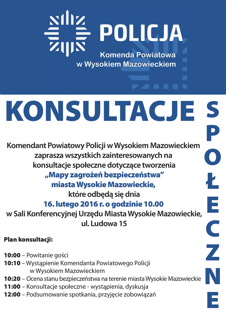 Komendant Powiatowy Policji w Wysokiem Mazowieckiem zaprasza wszystkich zainteresowanych na konsultacje społeczne dotyczące tworzenia „Mapy zagrożeń bezpieczeństwa” miasta Wysokie Mazowieckie, które odbędą się dnia 16. lutego 2016 r. o godzinie 10.00 w Sali Konferencyjnej Urzędu Miasta Wysokie Mazowieckie, ul. Ludowa 15 Plan konsultacji: 10:00 – Powitanie gości 10:10 – Wystąpienie Komendanta Powiatowego Policji w Wysokiem Mazowieckiem 10:20 – Ocena stanu bezpieczeństwa na terenie miasta Wysokie Mazowieckie 11:00 – Konsultacje społeczne - wystąpienia, dyskusja 12:00 – Podsumowanie spotkania, przyjęcie zobowiązań SPOŁECZNE KONSULTACJE