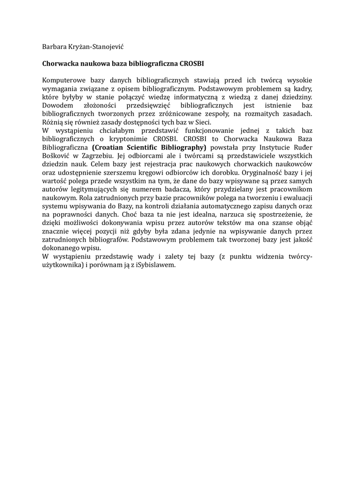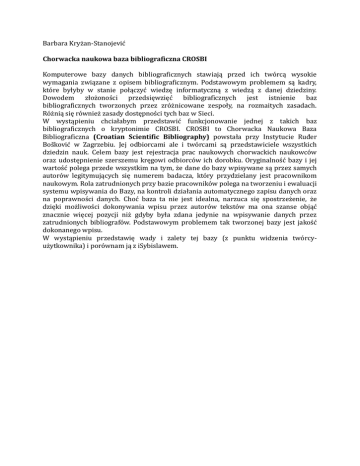 Barbara Kryżan-Stanojević Chorwacka naukowa baza bibliograficzna CROSBI Komputerowe bazy danych bibliograficznych stawiają przed ich twórcą wysokie wymagania związane z opisem bibliograficznym. Podstawowym problemem są kadry, które byłyby w stanie połączyć wiedzę informatyczną z wiedzą z danej dziedziny. Dowodem złożoności przedsięwzięć bibliograficznych jest istnienie baz bibliograficznych tworzonych przez zróżnicowane zespoły, na rozmaitych zasadach. Różnią się również zasady dostępności tych baz w Sieci. W wystąpieniu chciałabym przedstawić funkcjonowanie jednej z takich baz bibliograficznych o kryptonimie CROSBI. CROSBI to Chorwacka Naukowa Baza Bibliograficzna (Croatian Scientific Bibliography) powstała przy Instytucie Ruđer Bošković w Zagrzebiu. Jej odbiorcami ale i twórcami są przedstawiciele wszystkich dziedzin nauk. Celem bazy jest rejestracja prac naukowych chorwackich naukowców oraz udostępnienie szerszemu kręgowi odbiorców ich dorobku. Oryginalność bazy i jej wartość polega przede wszystkim na tym, że dane do bazy wpisywane są przez samych autorów legitymujących się numerem badacza, który przydzielany jest pracownikom naukowym. Rola zatrudnionych przy bazie pracowników polega na tworzeniu i ewaluacji systemu wpisywania do Bazy, na kontroli działania automatycznego zapisu danych oraz na poprawności danych. Choć baza ta nie jest idealna, narzuca się spostrzeżenie, że dzięki możliwości dokonywania wpisu przez autorów tekstów ma ona szanse objąć znacznie więcej pozycji niż gdyby była zdana jedynie na wpisywanie danych przez zatrudnionych bibliografów. Podstawowym problemem tak tworzonej bazy jest jakość dokonanego wpisu. W wystąpieniu przedstawię wady i zalety tej bazy (z punktu widzenia twórcyużytkownika) i porównam ją z iSybislawem.