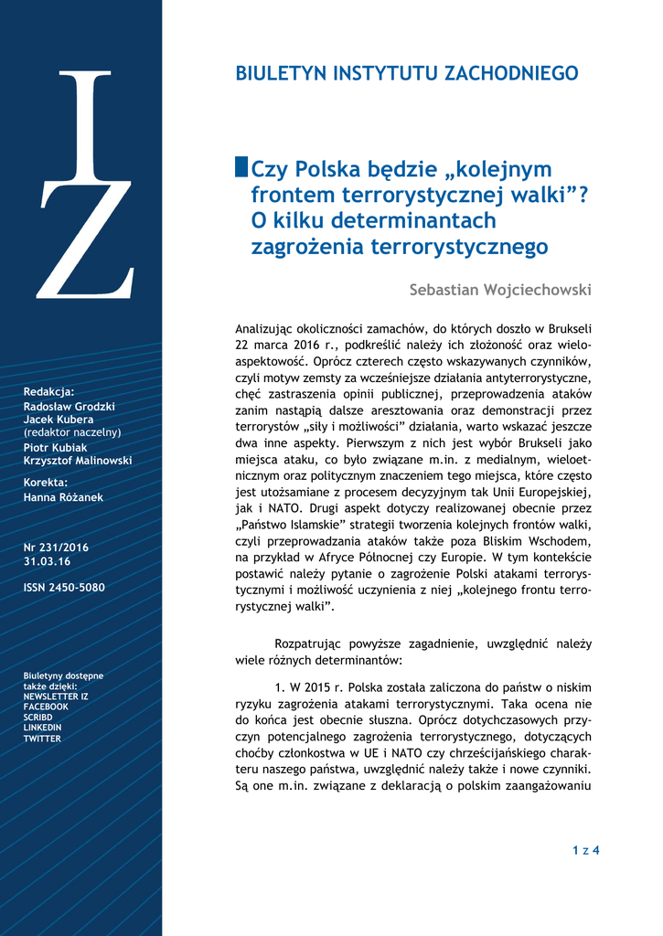 BIULETYN INSTYTUTU ZACHODNIEGO Czy Polska będzie „kolejnym frontem terrorystycznej walki”? O kilku determinantach zagrożenia terrorystycznego Sebastian Wojciechowski Redakcja: Radosław Grodzki Jacek Kubera (redaktor naczelny) Piotr Kubiak Krzysztof Malinowski Korekta: Hanna Różanek Nr 231/2016 31.03.16 ISSN 2450-5080 Analizując okoliczności zamachów, do których doszło w Brukseli 22 marca 2016 r., podkreślić należy ich złożoność oraz wieloaspektowość. Oprócz czterech często wskazywanych czynników, czyli motyw zemsty za wcześniejsze działania antyterrorystyczne, chęć zastraszenia opinii publicznej, przeprowadzenia ataków zanim nastąpią dalsze aresztowania oraz demonstracji przez terrorystów „siły i możliwości” działania, warto wskazać jeszcze dwa inne aspekty. Pierwszym z nich jest wybór Brukseli jako miejsca ataku, co było związane m.in. z medialnym, wieloetnicznym oraz politycznym znaczeniem tego miejsca, które często jest utożsamiane z procesem decyzyjnym tak Unii Europejskiej, jak i NATO. Drugi aspekt dotyczy realizowanej obecnie przez „Państwo Islamskie” strategii tworzenia kolejnych frontów walki, czyli przeprowadzania ataków także poza Bliskim Wschodem, na przykład w Afryce Północnej czy Europie. W tym kontekście postawić należy pytanie o zagrożenie Polski atakami terrorystycznymi i możliwość uczynienia z niej „kolejnego frontu terrorystycznej walki”. Rozpatrując powyższe zagadnienie, uwzględnić należy wiele różnych determinantów: Biuletyny dostępne także dzięki: NEWSLETTER IZ FACEBOOK SCRIBD LINKEDIN TWITTER 1. W 2015 r. Polska została zaliczona do państw o niskim ryzyku zagrożenia atakami terrorystycznymi. Taka ocena nie do końca jest obecnie słuszna. Oprócz dotychczasowych przyczyn potencjalnego zagrożenia terrorystycznego, dotyczących choćby członkostwa w UE i NATO czy chrześcijańskiego charakteru naszego państwa, uwzględnić należy także i nowe czynniki. Są one m.in. związane z deklaracją o polskim zaangażowaniu 1z4 w zwalczanie „Państwa Islamskiego” czy realizowaniem przez tę strukturę terrorystyczną wspomnianej już strategii tworzenia „kolejnych frontów walki”. Potencjalny atak na Polskę może zostać wykorzystany przez „Państwo Islamskie” również w celach propagandowych. Posłuży on nie tylko do gloryfikacji „wojny z niewiernymi”, ale także do zniechęcenia lub zastraszenia innych członków antyislamskiej koalicji. Jest to ważne choćby ze względu na organizowany w Polsce szczyt NATO czy Światowe Dni Młodzieży, które z uwagi na swój masowy i religijny charakter są dobrym celem ataku. Nie można się przy tym zgodzić z dość często powtarzaną opinią, iż skoro nie doszło w Polsce do ataku terrorystycznego pomimo naszego zaangażowania w Iraku czy Afganistanie, również i teraz nie ma takiego zagrożenia. Mimo że prawdopodobieństwo ataku nie jest zbyt duże, to jednak „Państwo Islamskie” ma o wiele większe możliwości działania i inną strategię niż Talibowie czy Al-Kaida w przeszłości. W tej kwestii nie brakuje jednak i bardziej radykalnych wypowiedzi niektórych ekspertów, np. Érica Denécé – dyrektora Francuskiego Centrum Badań nad Wywiadem – CF2R, który stwierdził: „Terroryści, jeśli zechcą, uderzą jutro w Warszawę czy Kopenhagę. Nikt temu nie zapobiegnie”. 2. Uwzględnić należy ponadto wysoki poziom obaw związanych z atakami terrorystycznymi, który występuje w Polsce. Na przykład, jak wynika z sondażu przeprowadzonego w grudniu 2015 r. przez CBOS, aż 59% respondentów stwierdziło, że zagrożenie terroryzmem jest w Polsce realne. Co więcej, 61% deklarowało, że polskie władze i instytucje państwowe nie są dobrze przygotowane do zapobiegania atakom terrorystycznym. Przeciwnego zdania było tylko 20% ankietowanych. Zamachy przeprowadzone w Brukseli 22 marca 2016 r. zapewne jeszcze bardziej spotęgują takie obawy i towarzyszące im oceny. 3. Poziom zagrożenia atakami terrorystycznymi w Polsce zależy od wielu czynników oraz wydarzeń. Obecnie można zaobserwować korelacje zachodzące np. na linii terroryzm a kwestia imigracji/uchodźstwa. Z jednej strony ataki terrorystyczne w różnych częściach świata mogą przyczynić się do dodatkowego generowania zjawiska imigracji/uchodźstwa, tak dzieje się choćby w przypadku Syrii, Iraku, Afganistanu, Libii czy Nigerii. Z drugiej zaś strony wśród imigrantów/uchodźców (co potwierdził choćby szef niemieckiego kontrwywiadu BfV) „ukrywają się” terroryści. Jaka jest lub może być skala tego zagrożenia? Jak „zlokalizować” terrorystów w tłumie imigrantów/uchodźców? Jak skutecznie przeciwdziałać temu zagrożeniu? Są to pytania, z którymi muszą się zmierzyć również i polskie powołane do tego instytucje. Jest to obecnie szczególnie istotne, ponieważ system kontroli i weryfikacji imigrantów/ /uchodźców stosowany do tej pory przez Unię Europejską okazał się wadliwy i niewystarczający. Koresponduje z tym także problem wzrostu w 2015 r. odnotowanych przypadków próby przemytu broni czy nielegalnego przekroczenia polskich granic. 4. Kolejne ważne zagadnienie to kwestia bojowników „Państwa Islamskiego”, którzy z różnych względów postanowili wrócić do Europy. Motywy ich powrotu są bardzo zróżnicowane, począwszy od zniechęcenia czy rozczarowania działaniami „Państwa Islamskiego” lub występującą tam sytuacją, a kończąc na powierzeniu niektórym spośród nich różnych zadań terrorystycznych (choćby logistycznych czy werbunkowych). Według danych ze stycznia 2016 r. do Niemiec wróciło około 400 takich osób, a do Francji około 250. Nie one jednak są największym zagrożeniem dla 2z4 bezpieczeństwa. Można je bowiem monitorować. Podobnie sytuacja wygląda z radykalnymi islamistami, którzy prowadzą aktywną działalność m.in. na forach internetowych czy w meczeta
